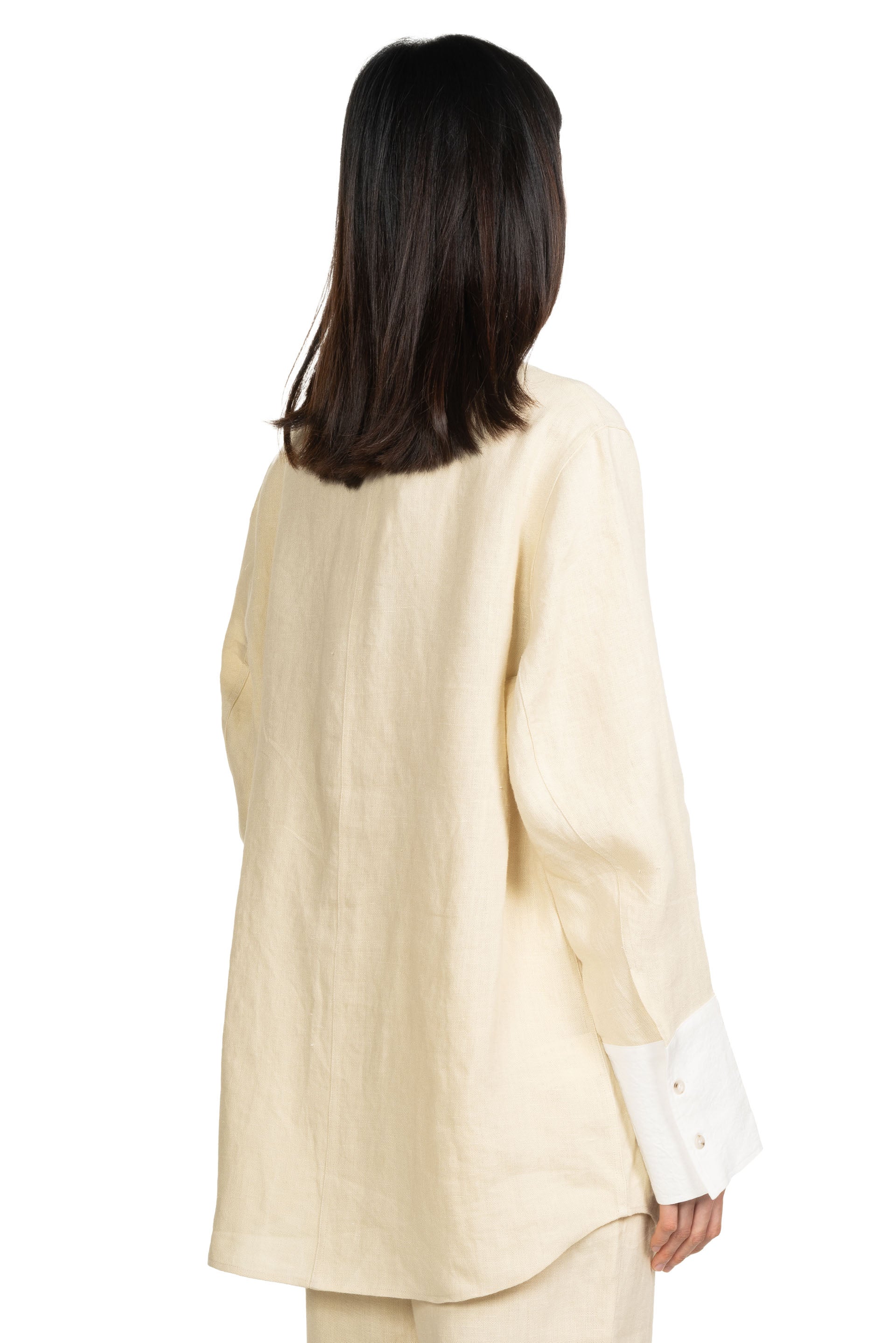 Swaying linen shirt. Long sleeves. Button closure at front. Button closure at cuffs. Turned up sleeves. Two colour contrast at front and cuffs.