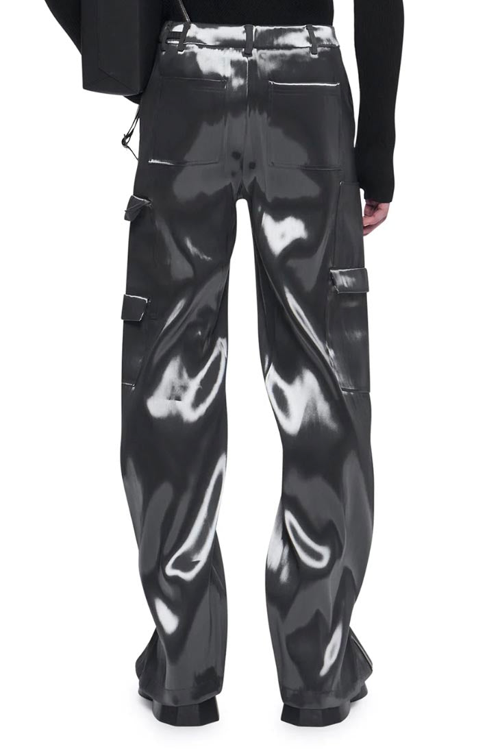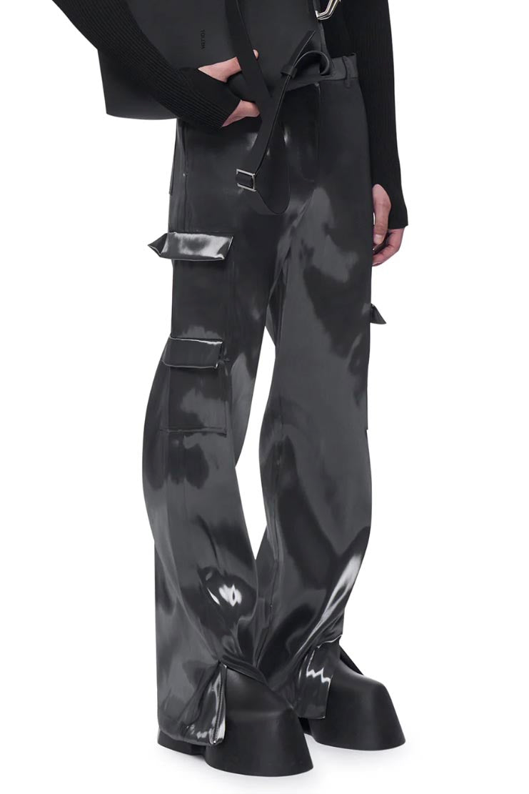 Signature Liquid Metal trousers, now in oversized cargo style with pockets. Oversized fit. Liquid metal fabric. Patch pockets at sides of legs and back. Diagonal zips in trouser hem for flared fit adjustment. Hook and eye closure waistband. Edgebound seam allowances with front and back lining. 'H'-beltloop at back.