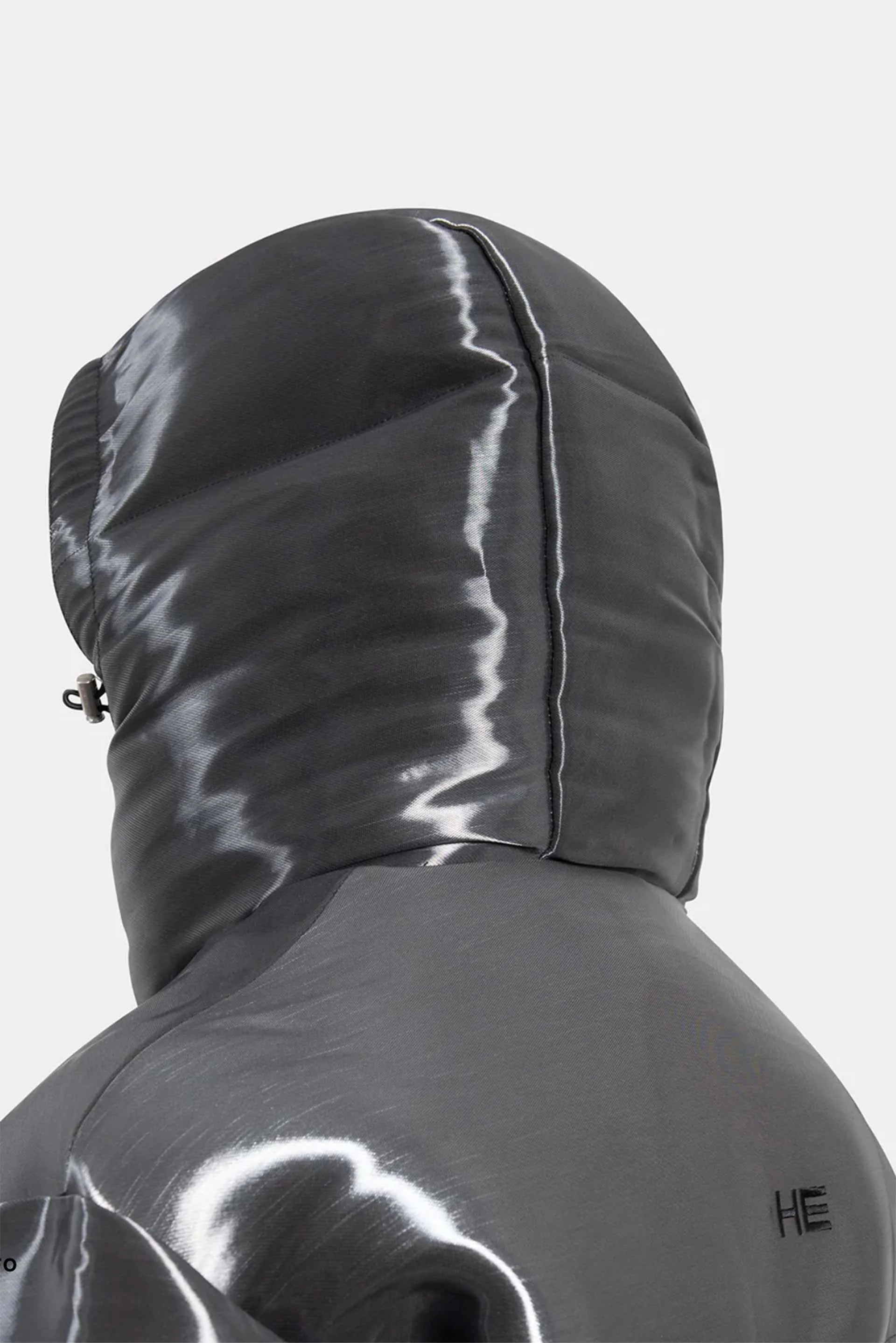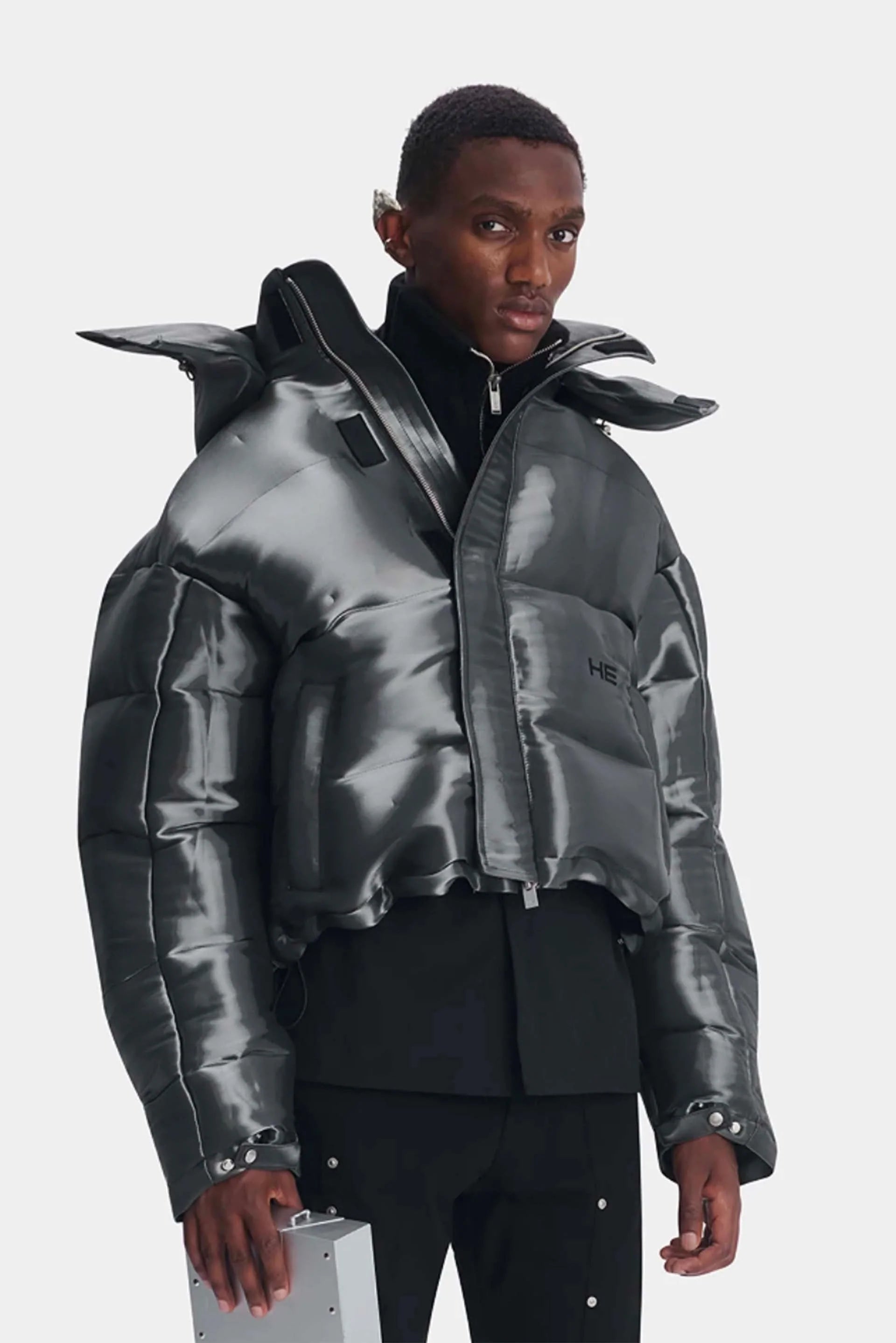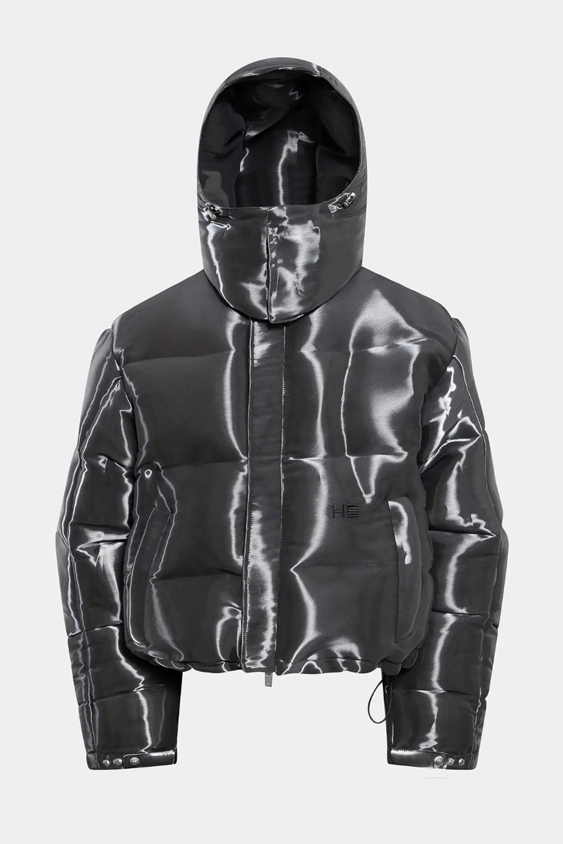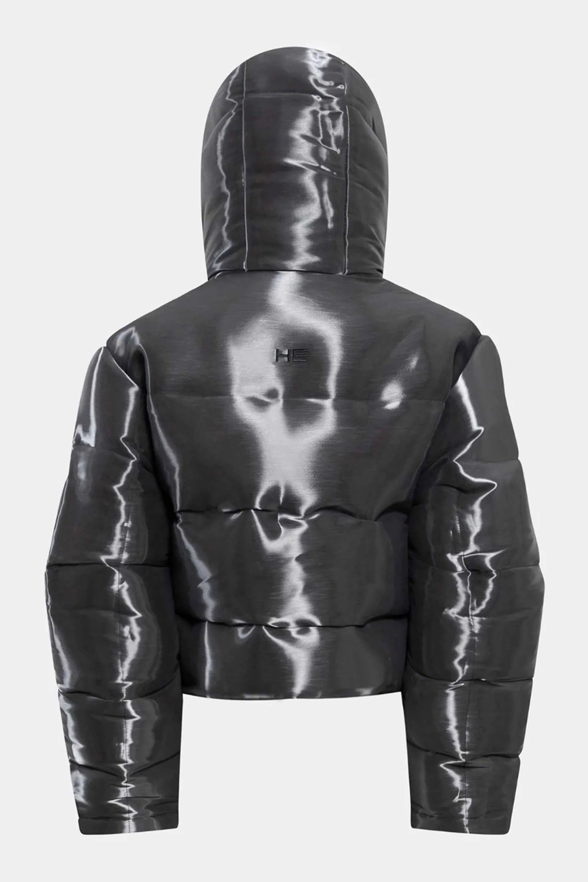 Signature liquid metal fabric with a high shine effect. Straight quilting lines. Two-way front zip closure. Front welt pockets with metal press button closure. Embroidered HE logo on the back. Cropped fit