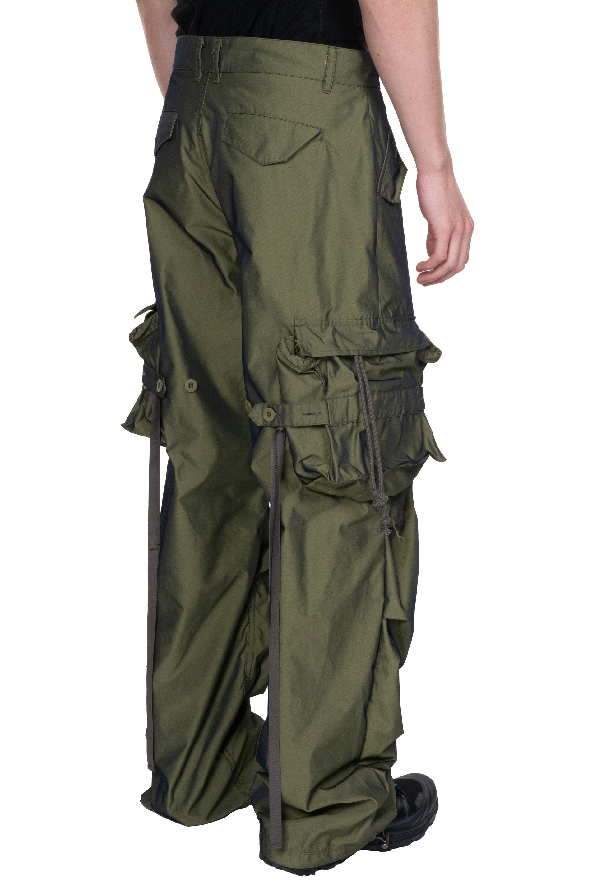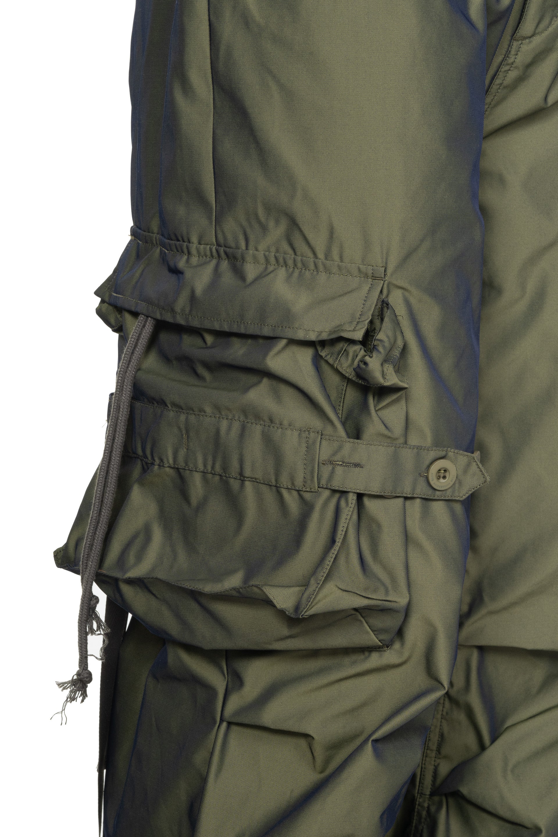 Button closure at waist. Two side pockets. Two back pockets. Cargo pockets at legs. Drawstrings closure at legs.