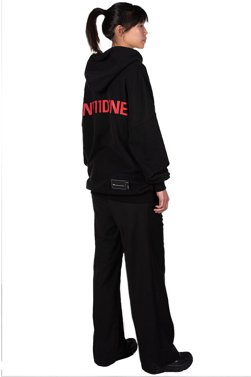 Black & Red Logo Hoodie. Long sleeve French terry hoodie in black. Tonal drawstring at hood. Rib knit cuffs and hem. Logo printed in red and rubber logo patch in black at back. Silver-tone hardware.