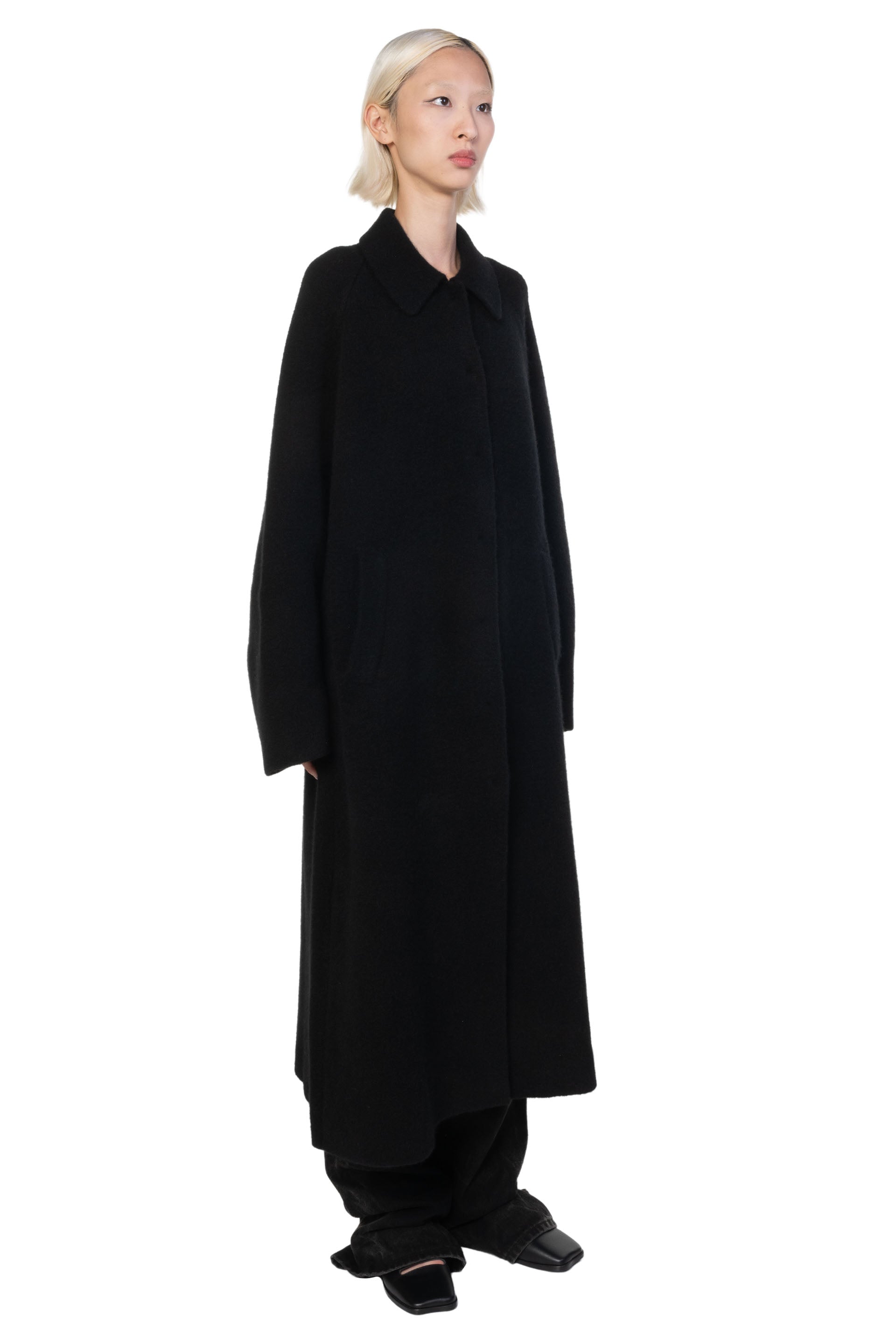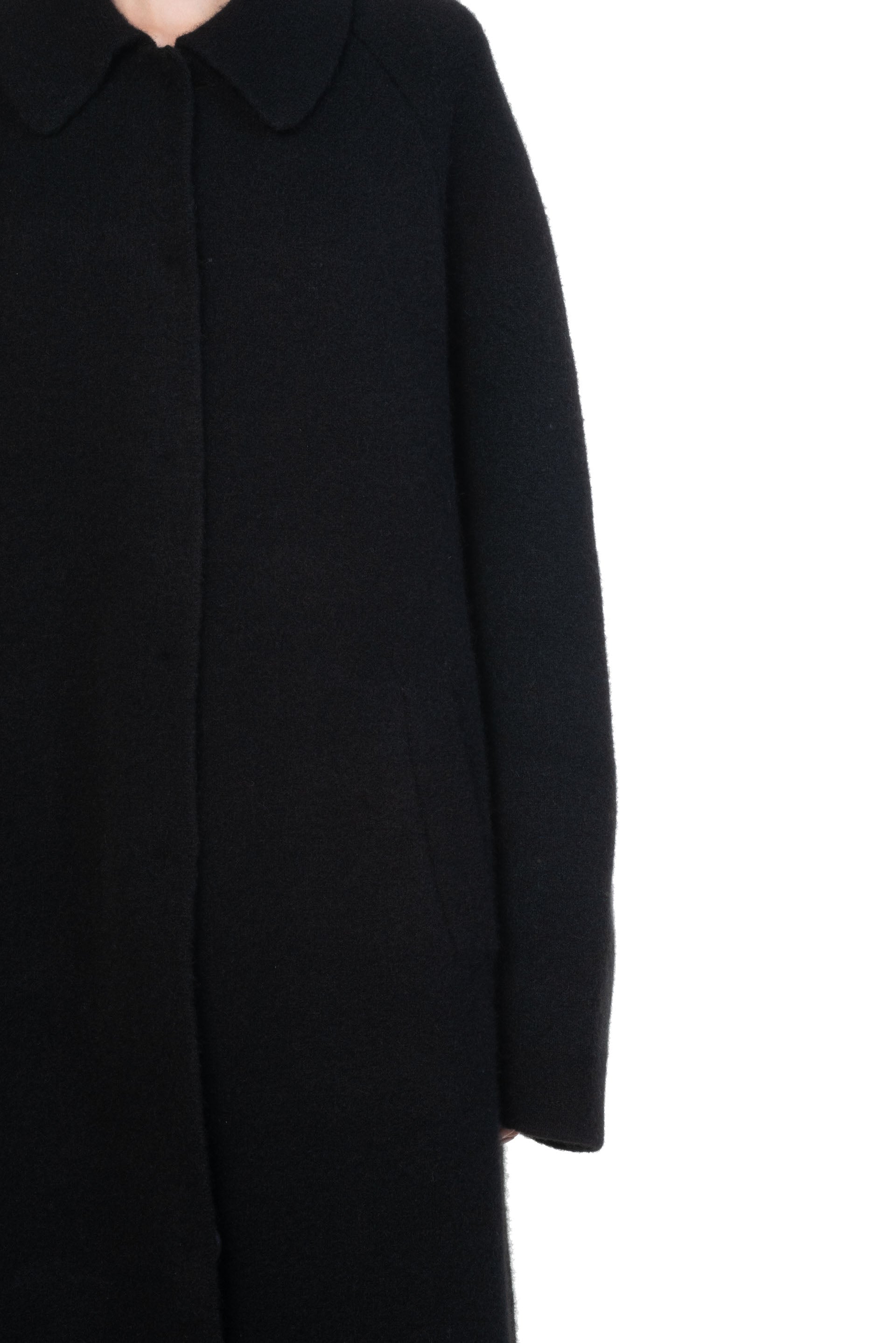 Black Yak wool coat from Boboutic. Classic collar. Long sleeves. Button closure at front. Hidden button system. Two side pockets. Signature Yak mix. Soft textural fabric. Lightweight.