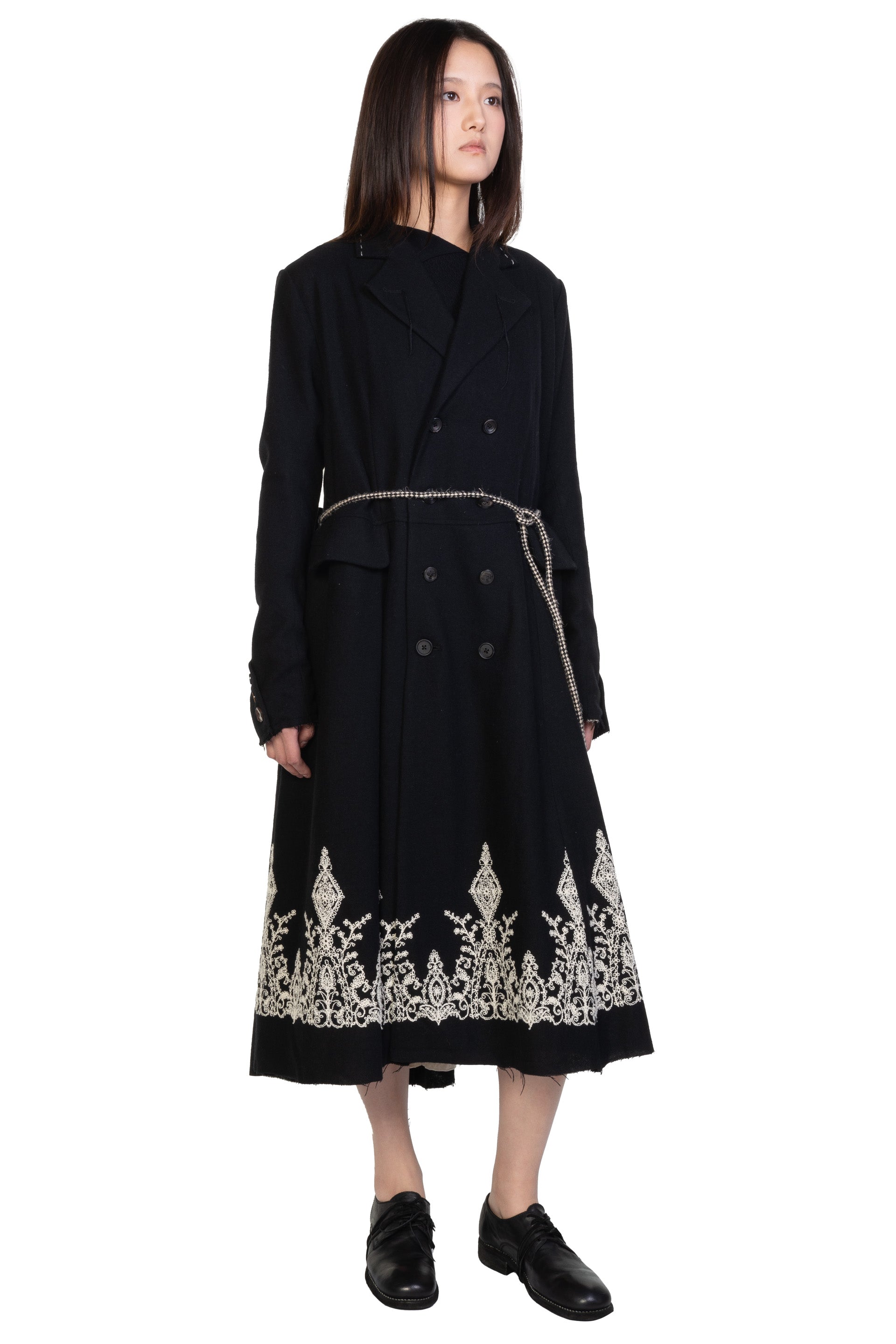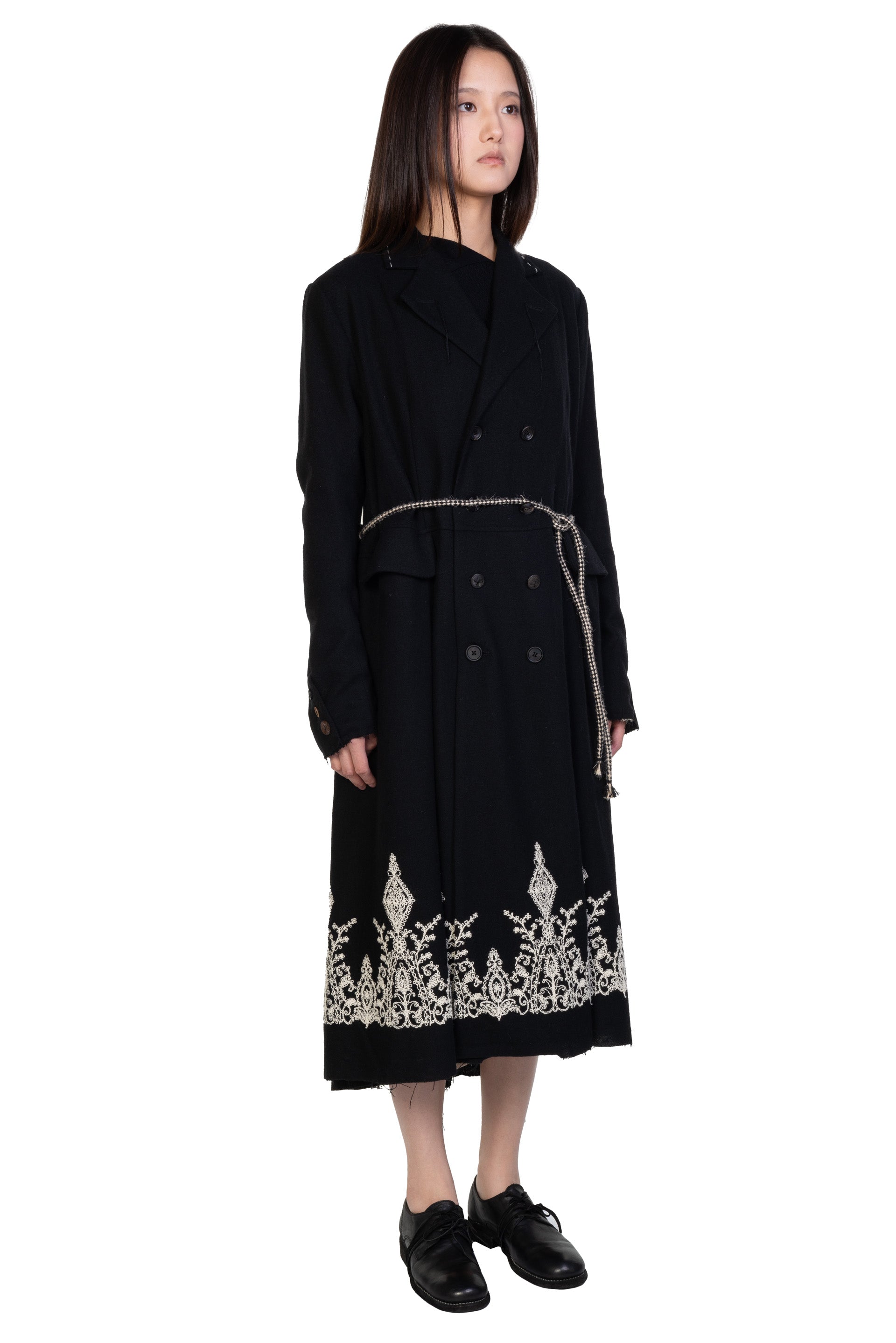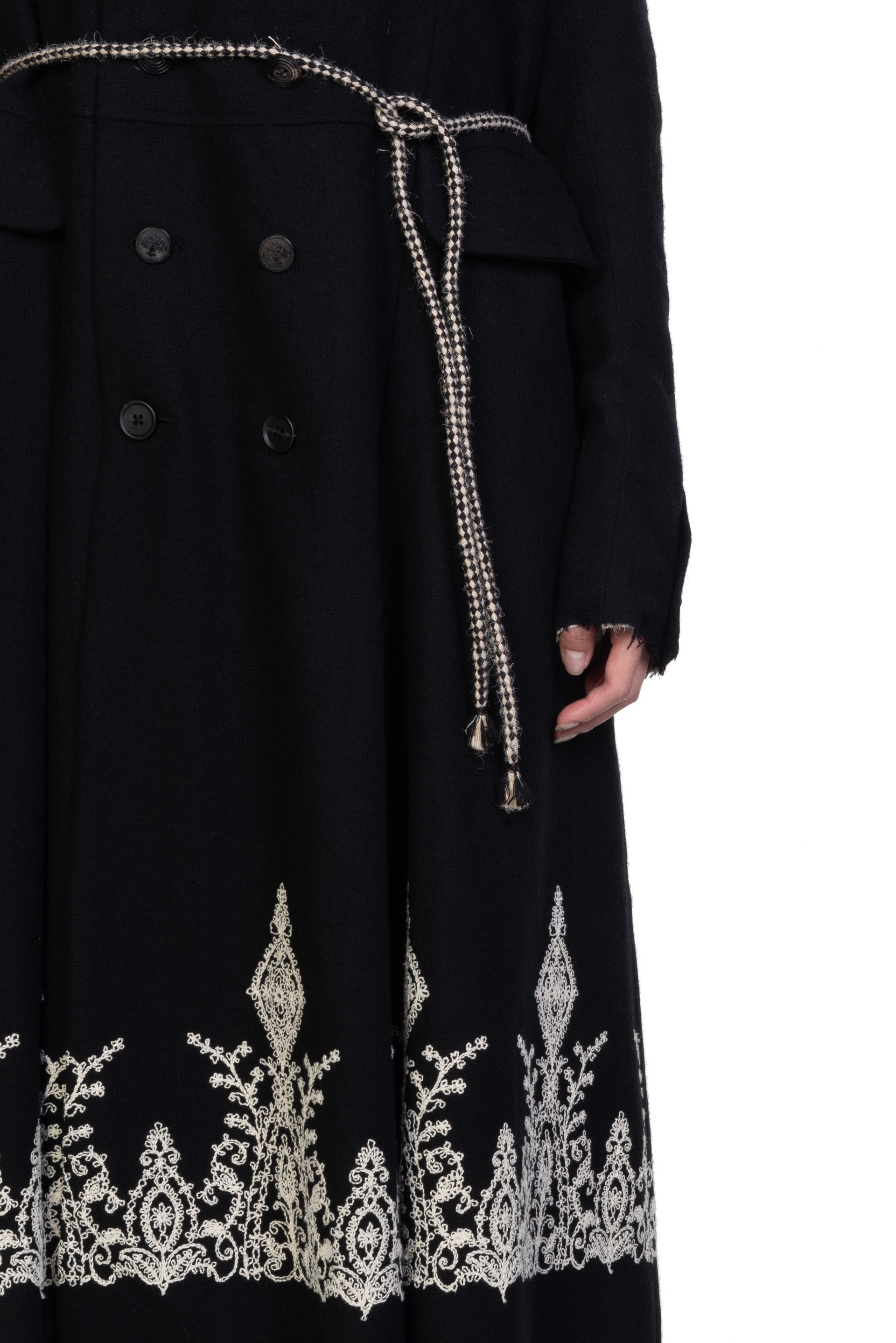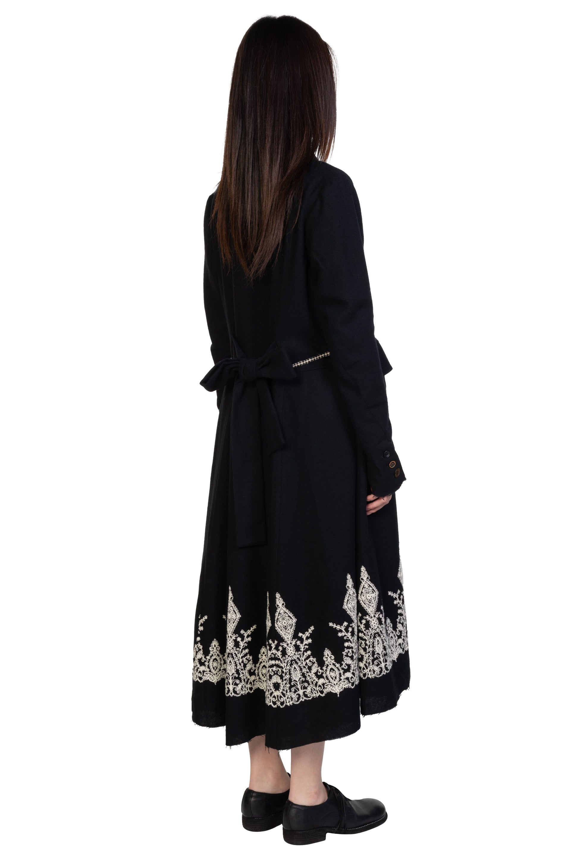 A Tentative Atelier aims to explore artistic handicraft elements and innovative forms and silhouettes on garments combining with neo-vintage effect. The label does not only focus on fashion, it is a platform to encourage and sustain the spirit and tradition in craftsmanship to create new form as seen with the Long Flared Embroidery Ribbon Coat.