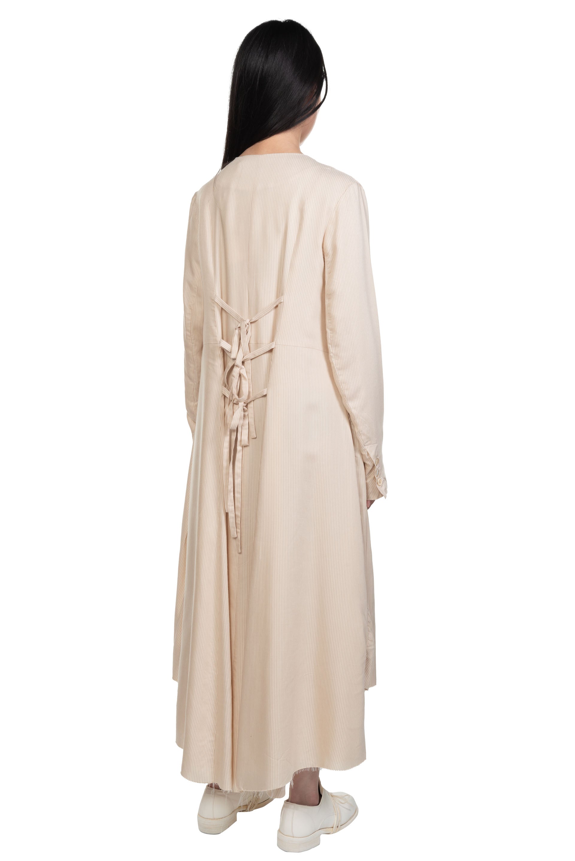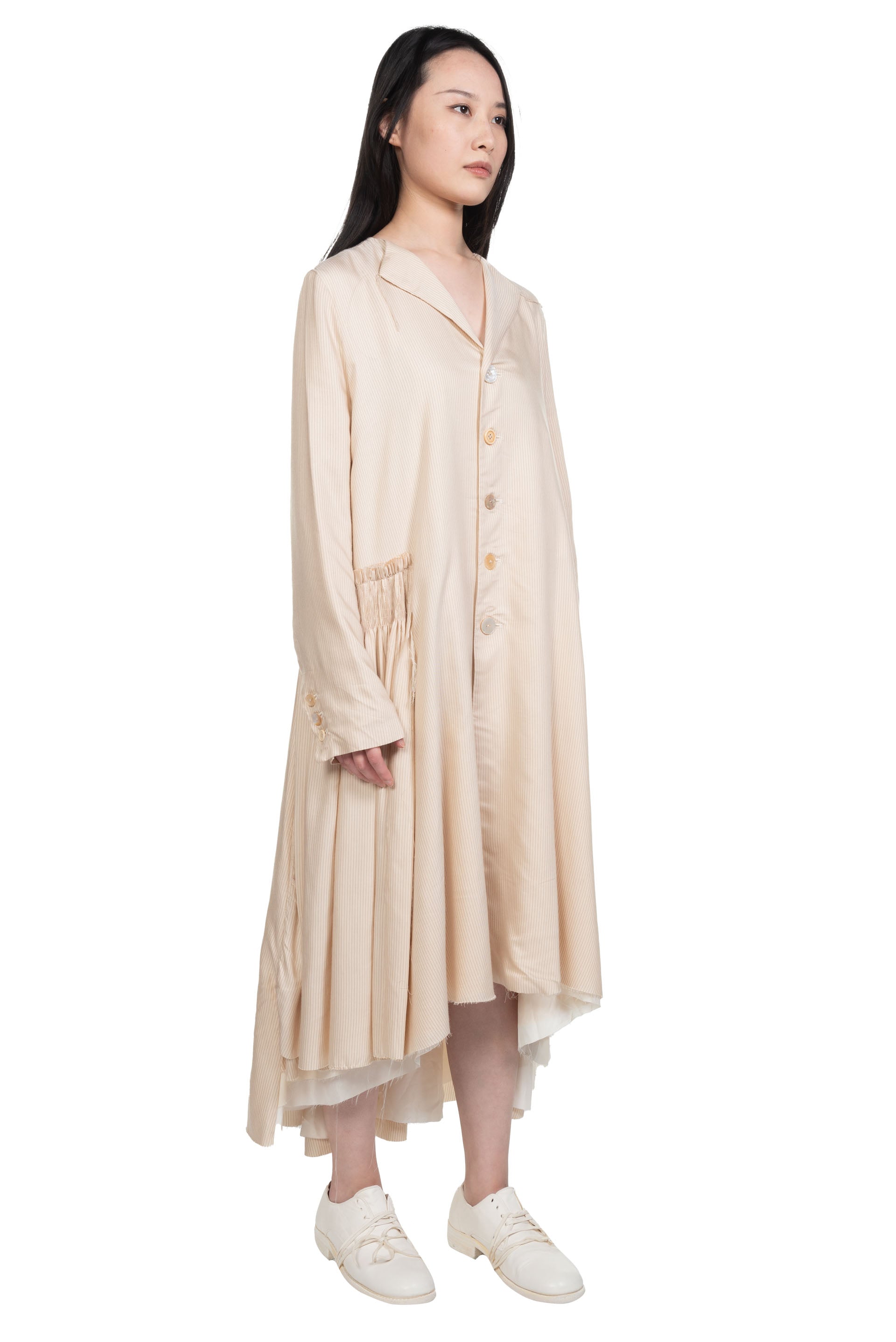 A Tentative Atelier aims to explore artistic handicraft elements and innovative forms and silhouettes on garments combining with neo-vintage effect. The label does not only focus on fashion, it is a platform to encourage and sustain the spirit and tradition in craftsmanship to create new form as seen with the Long Flared Smocking Stripe Coat.
