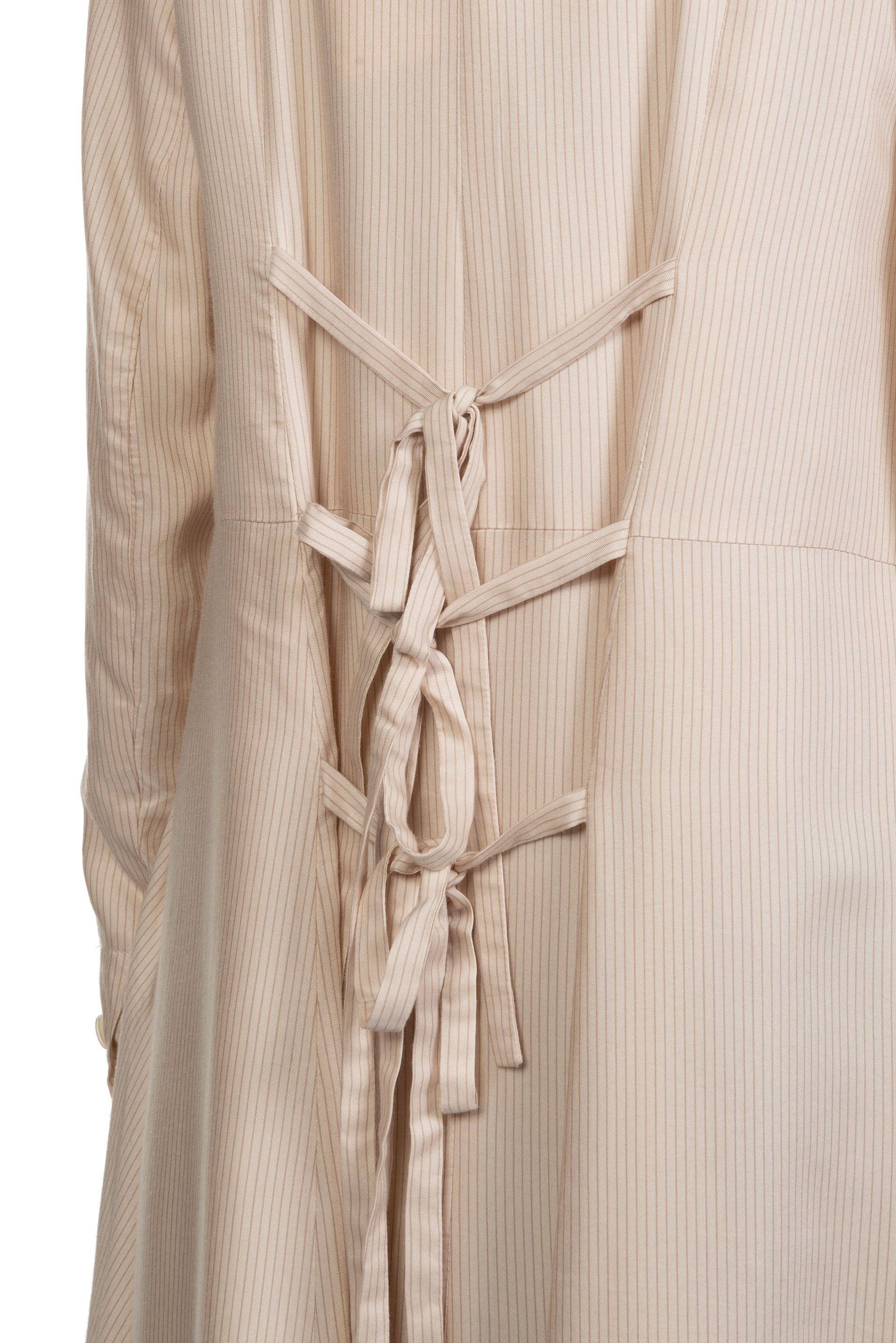 Long sleeves. Button closure at front. Belt detailing at the back. Pleated design at waist. Smocking details at side. Spread collar. Side pockets. Layered.