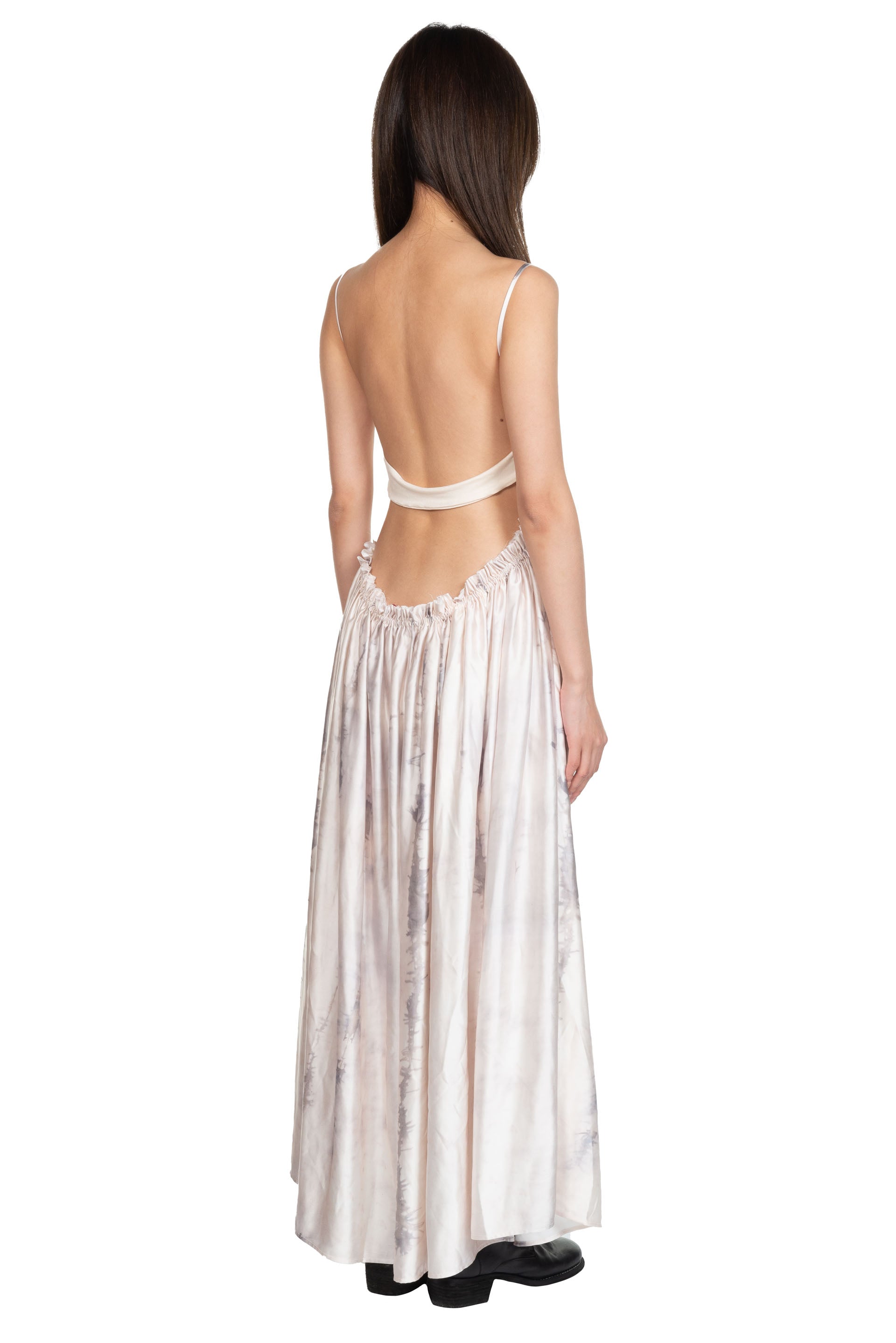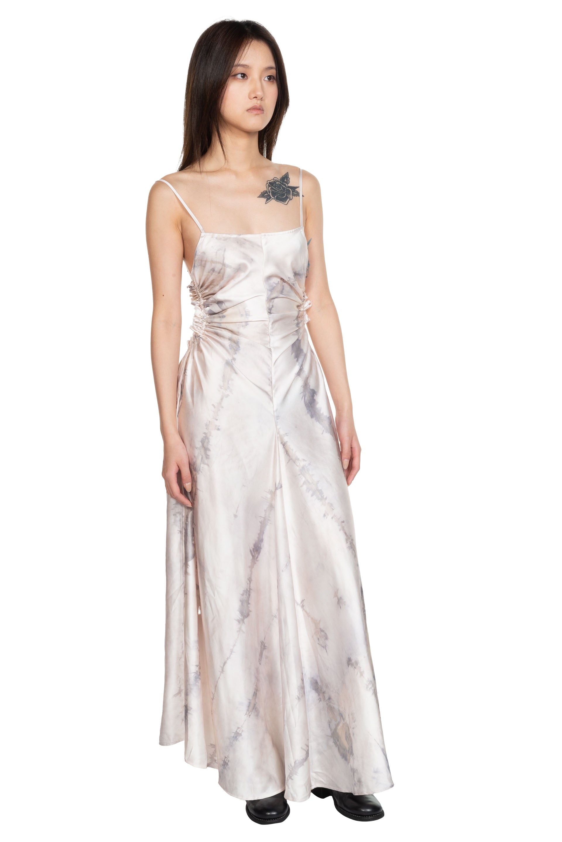 Two shoulder straps. Brand stitching at back. Beautiful Satin Silk fabric. Open back. Raw edges throughout. Random colour dye.