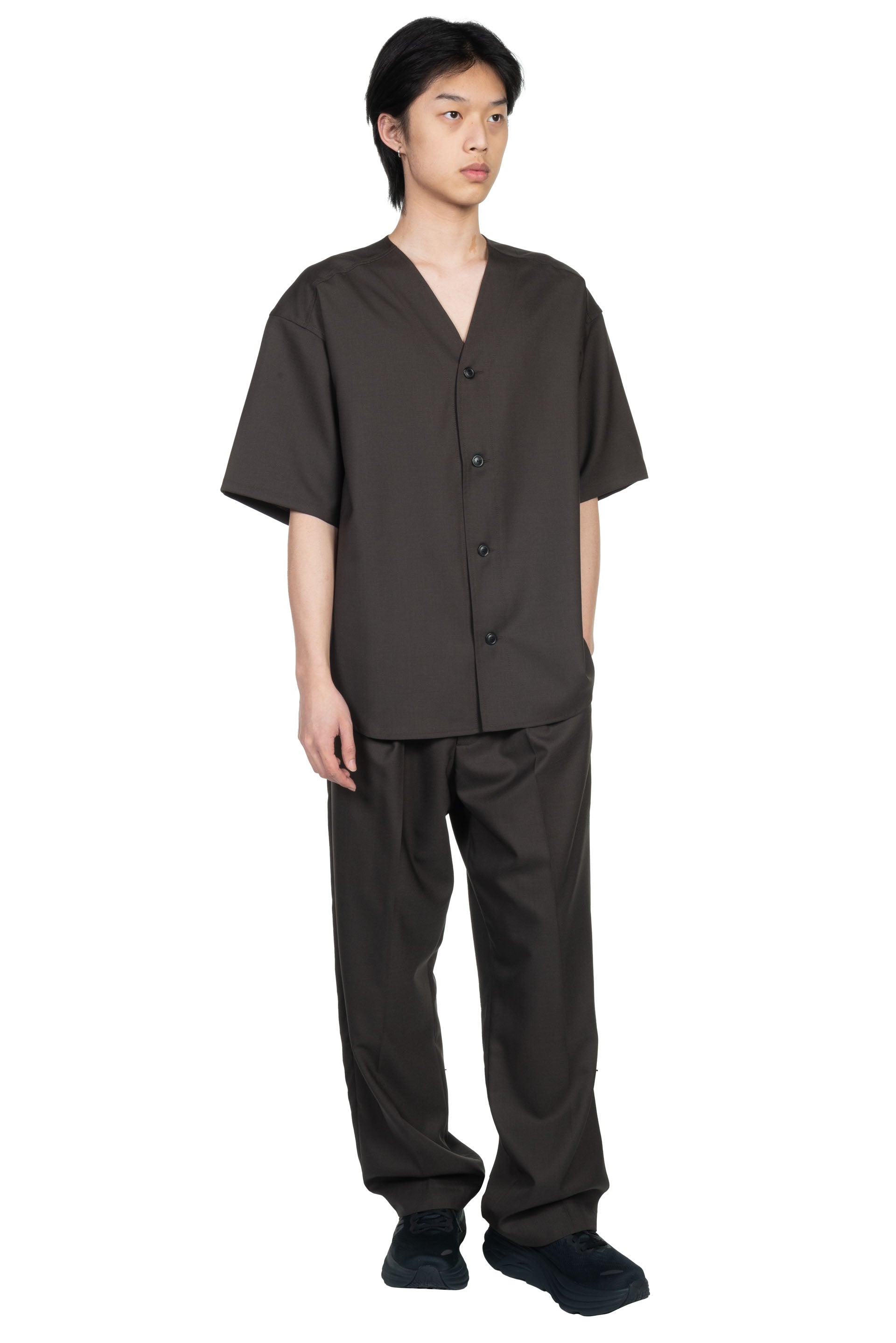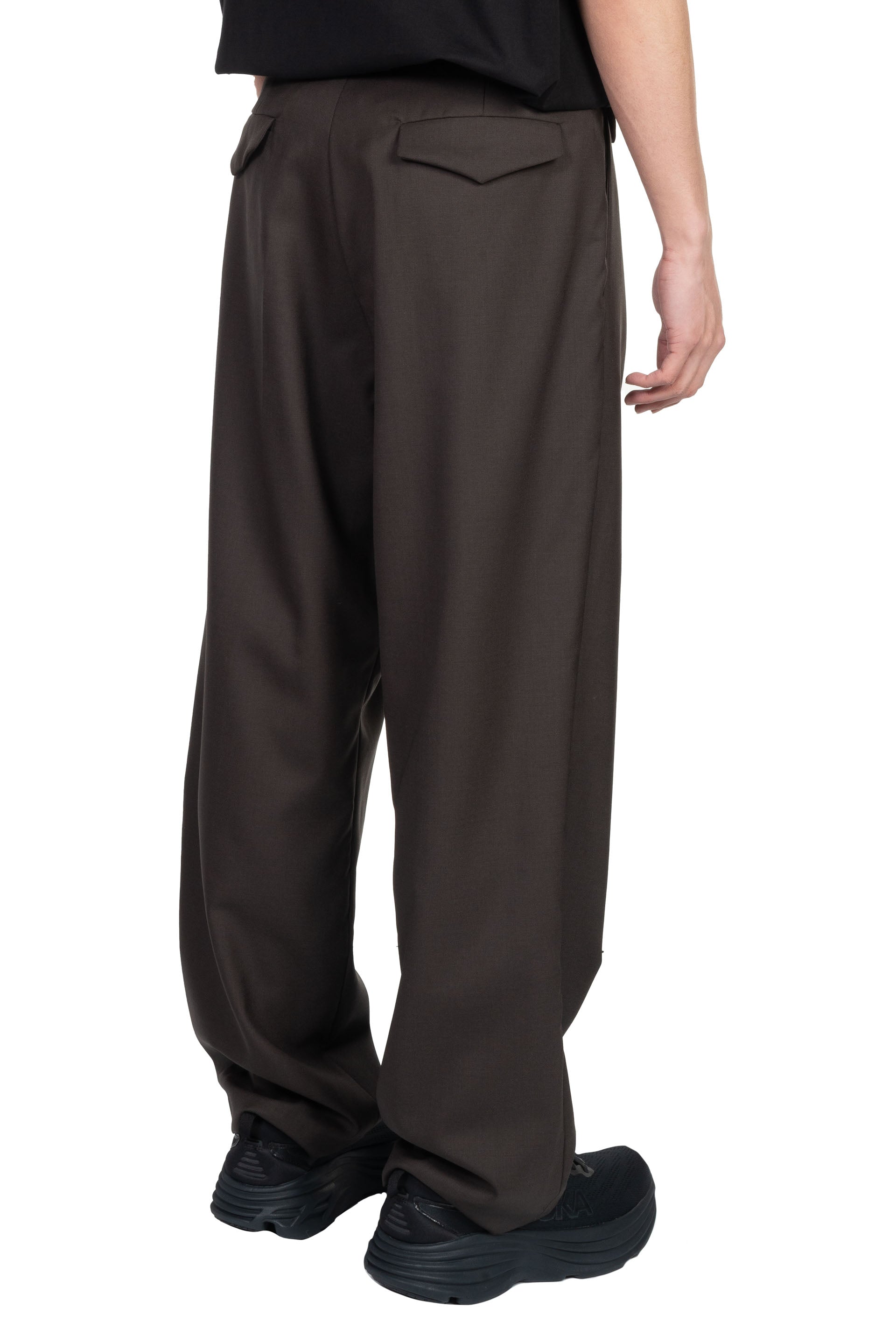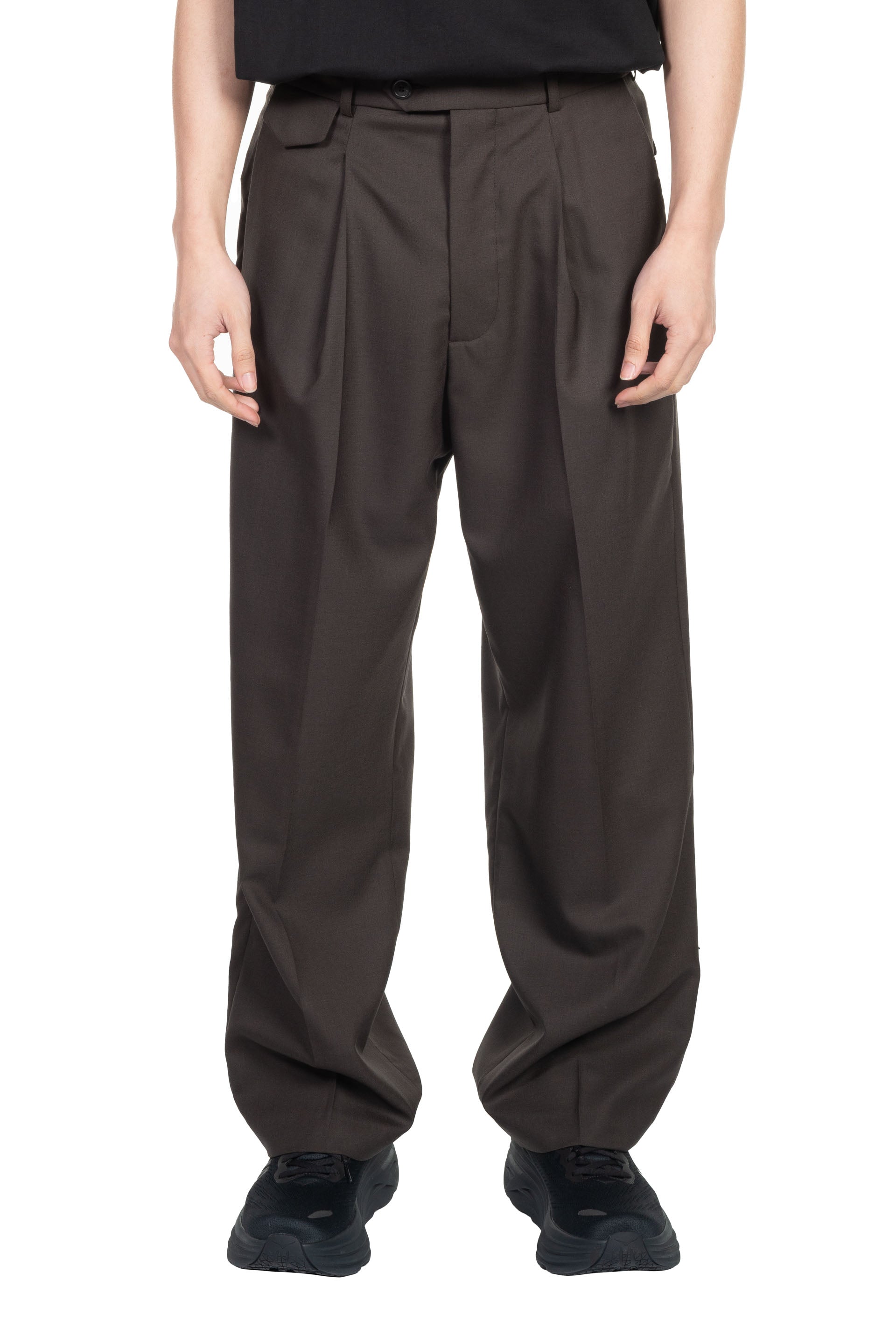 Lownn Long Wide Pants in Dark Brown. Mid-rise. Belt loops. Four-pocket styling. Horn buttons. Pleated front