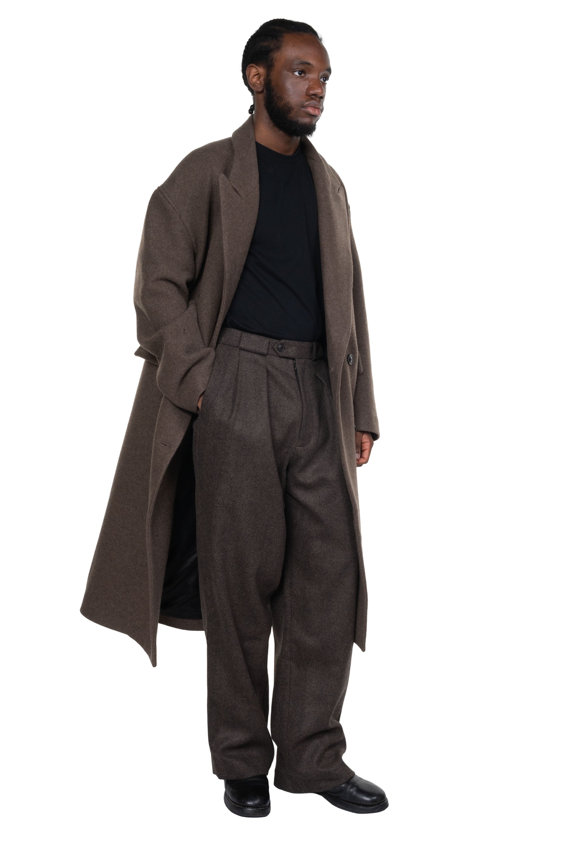Always in search of uniformity, focusing on form and function rather than thematic seasonal collections, Lownn reinterprets utilitarian menswear with a minimalist and contemporary approach and gives you a testimony of its time as seen with the Long Wide Pants Wool Cashmere Coffee Brown.