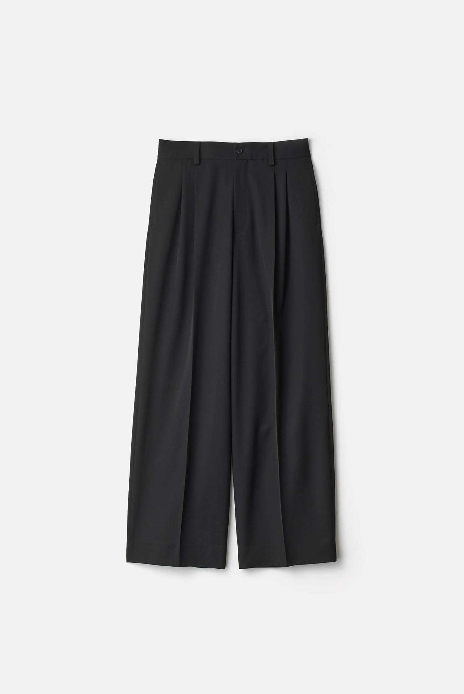 Two tuck trousers with a wide silhouette from thigh to hem, crafted from original wool gabardine woven at high density using 2/90 Super120’s yarns and piece-dyed. The silhouette is slightly tapered to maintain a clean and refined look despite the wide fit.