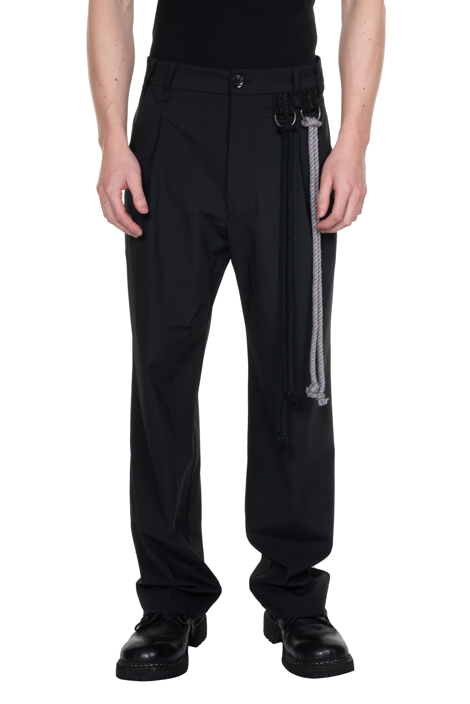 Song for the Mute loose pleated pants. Button closure at front. Two side pockets. Two back pockets. Pleated at front. Detachable tussle detail at waist.