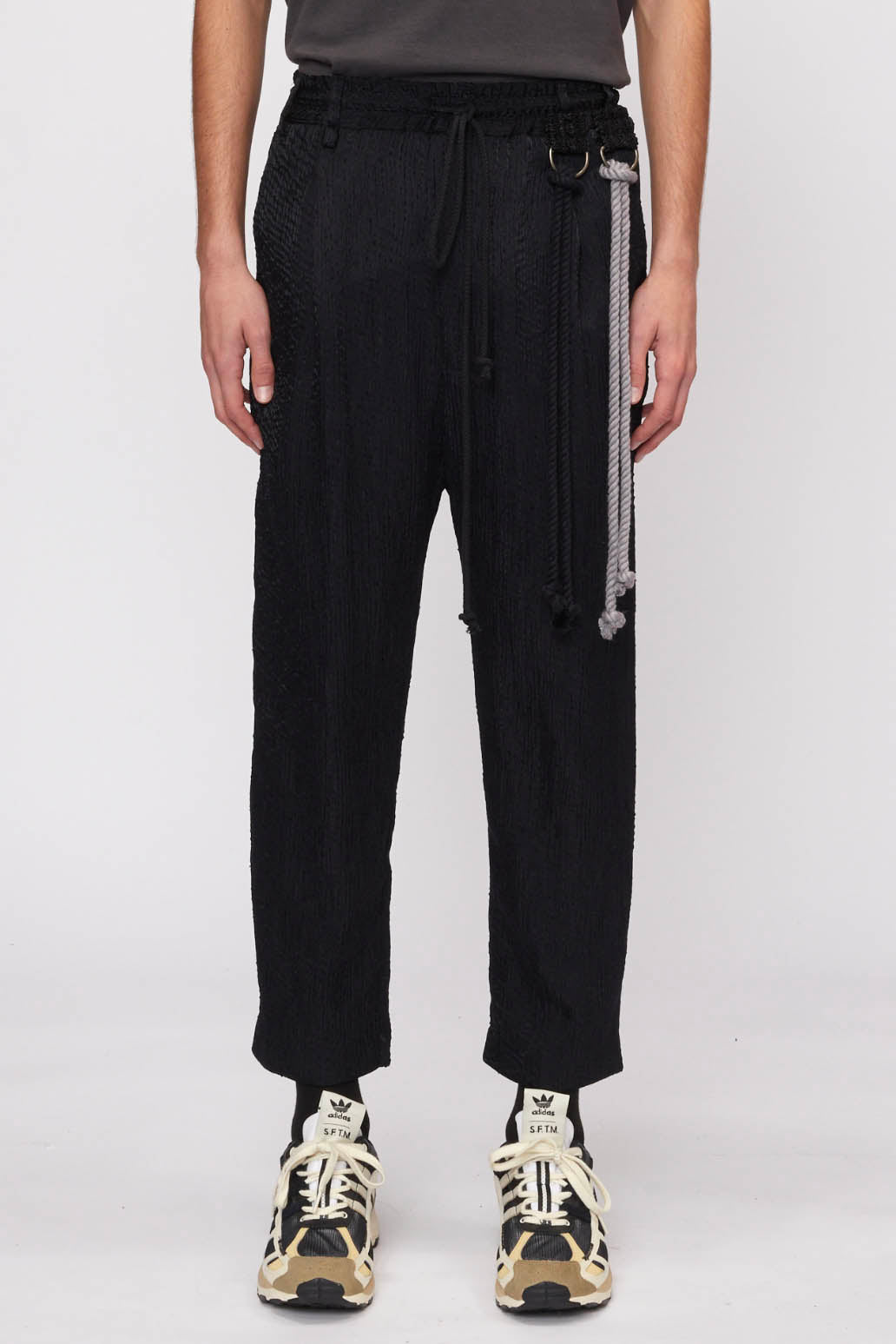 Song for the Mute lounge pants. Elastic waist. Drawstring closure at waist. Detachable tussle detailing at waist. Two side pockets. Two back pockets. Tapered cut.