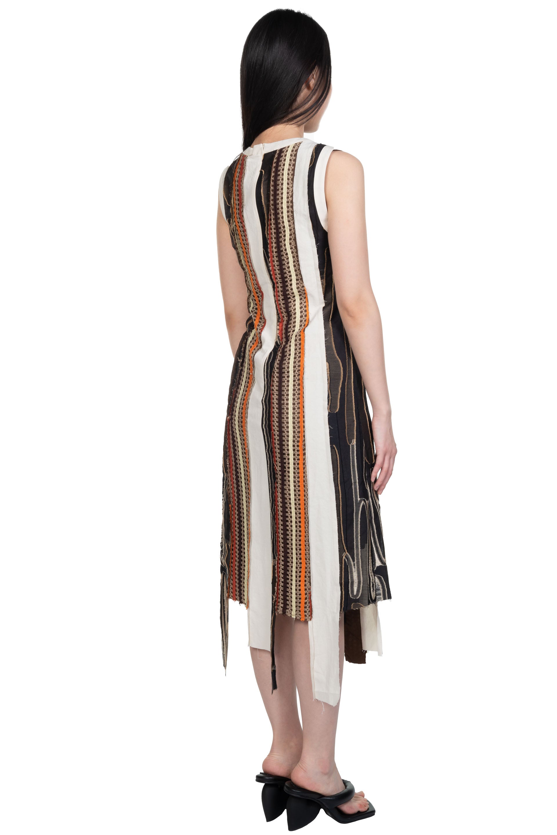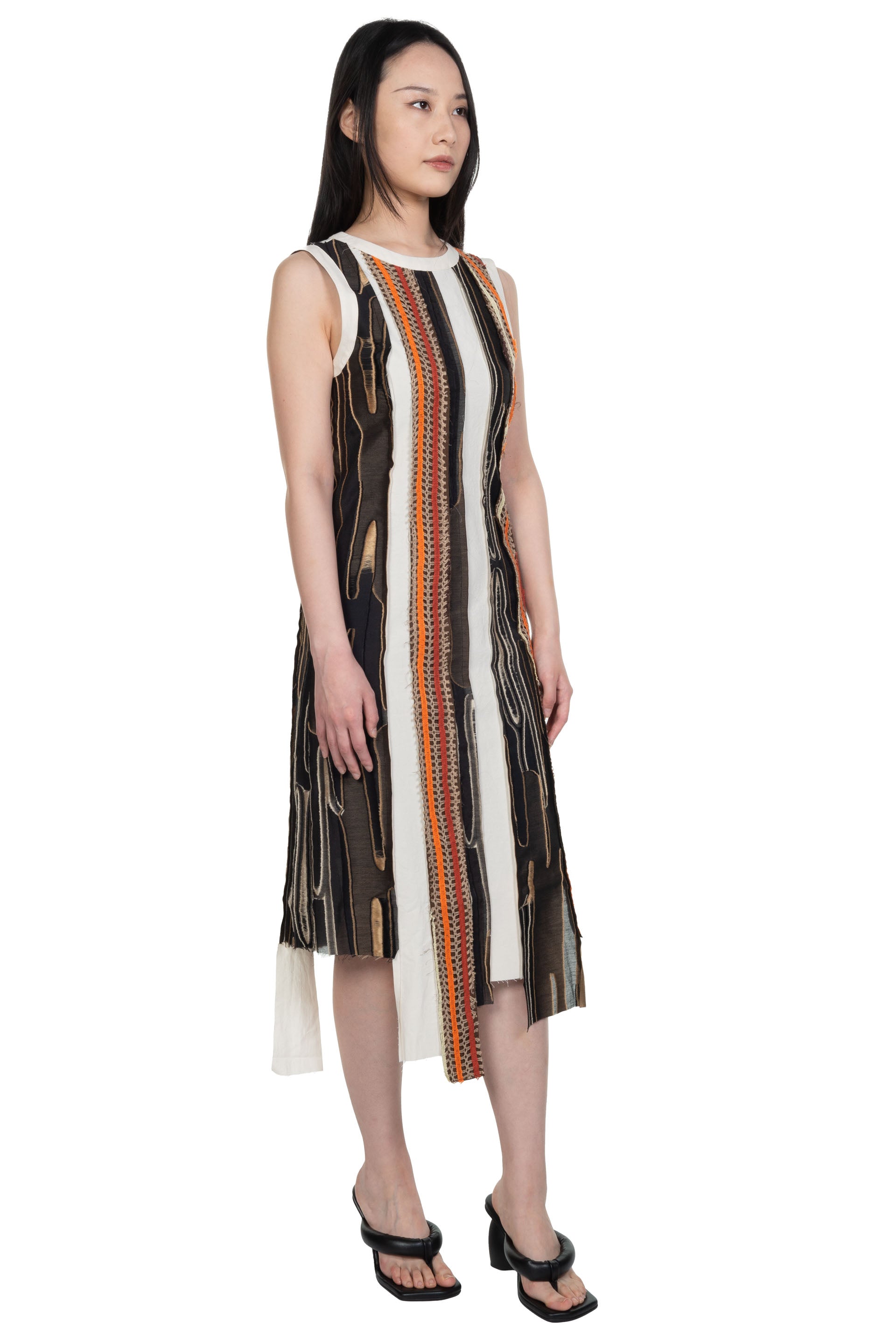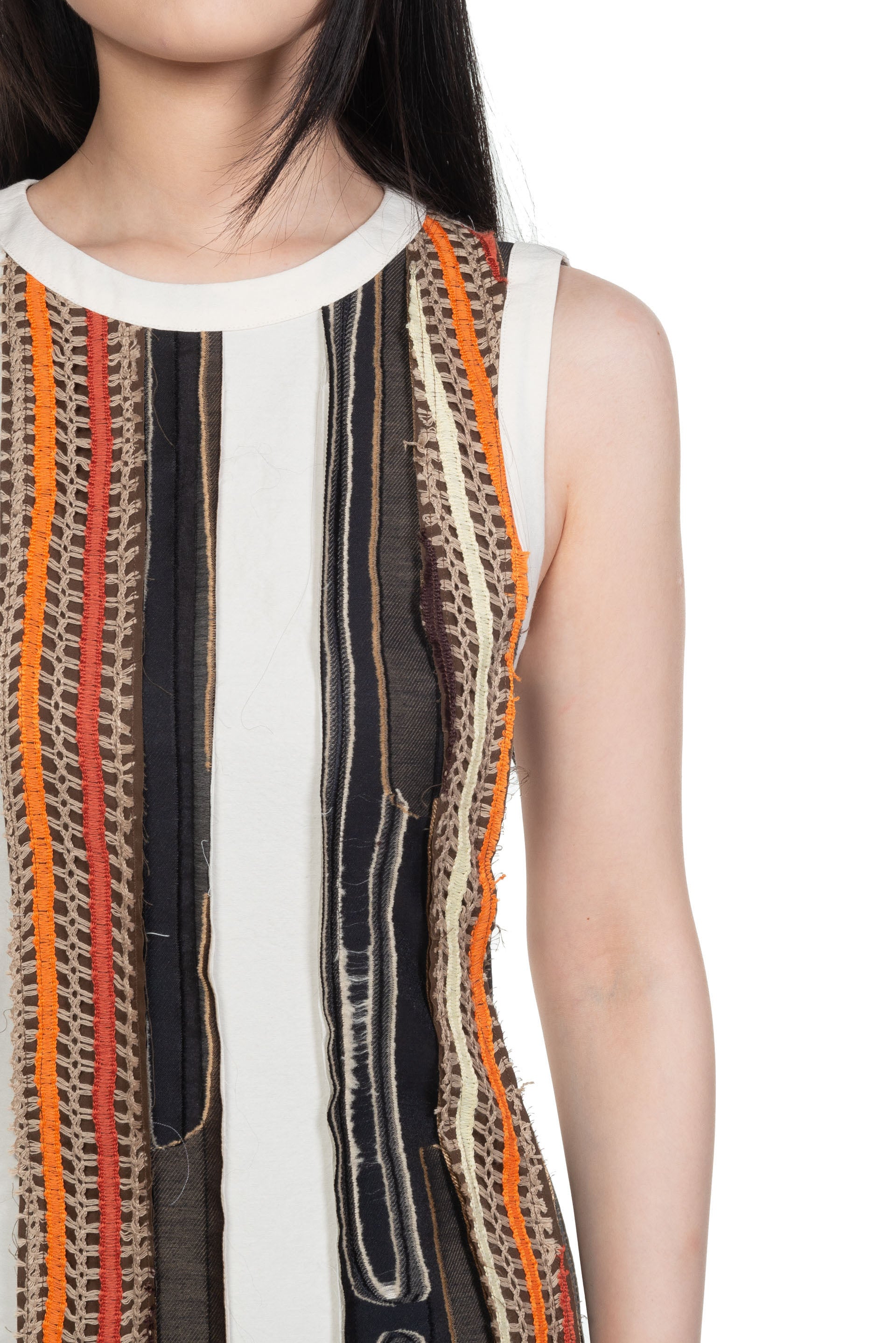 Sleeveless. Round neck. Stripe patchwork throughout. Cut out detailing. Contrast fabric. Deconstructed.