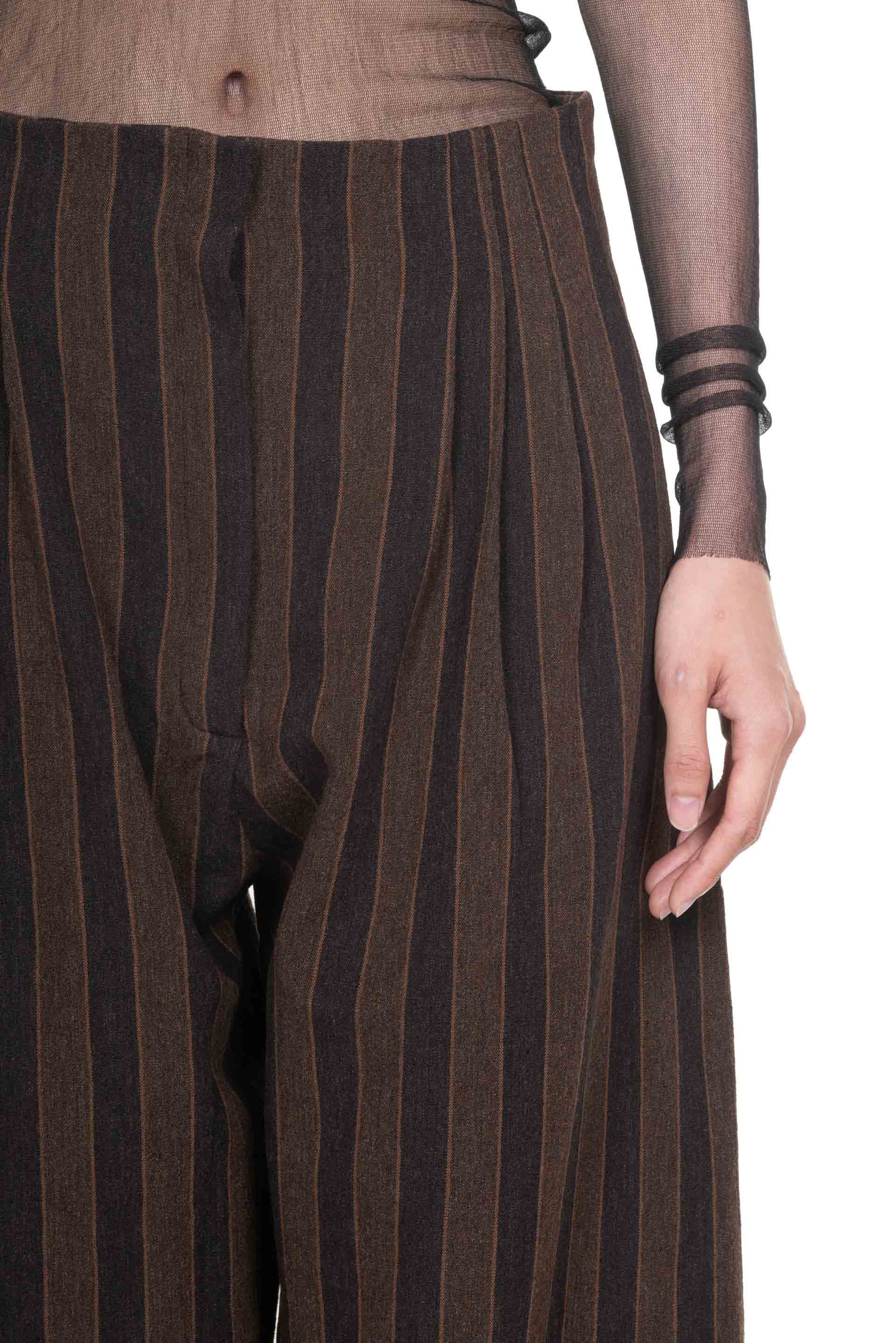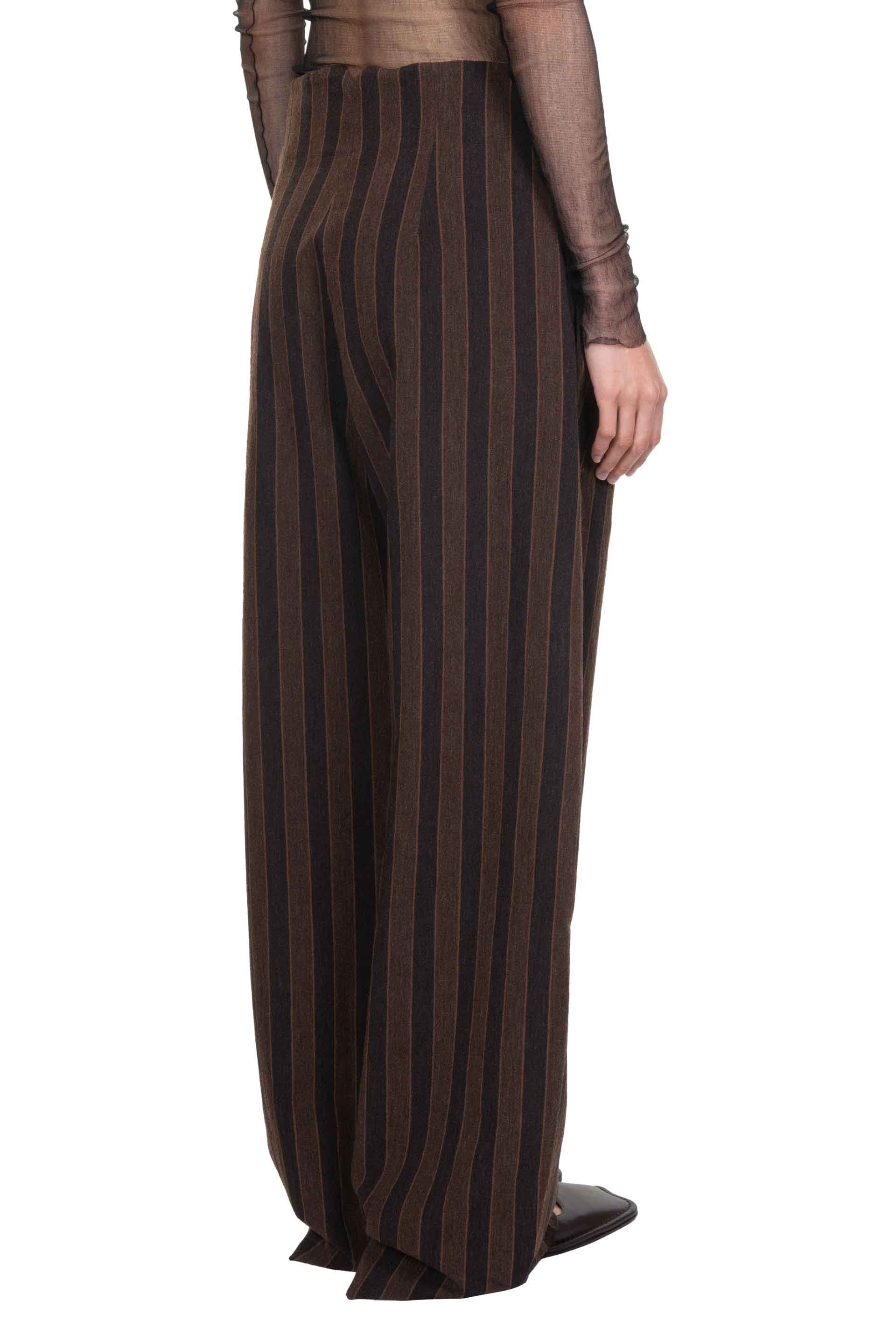 Unisex high-waisted, wide-leg pants with front pleats and side pockets. Made of a striped fabric that combines linen and brown virgin wool. Two side pockets.