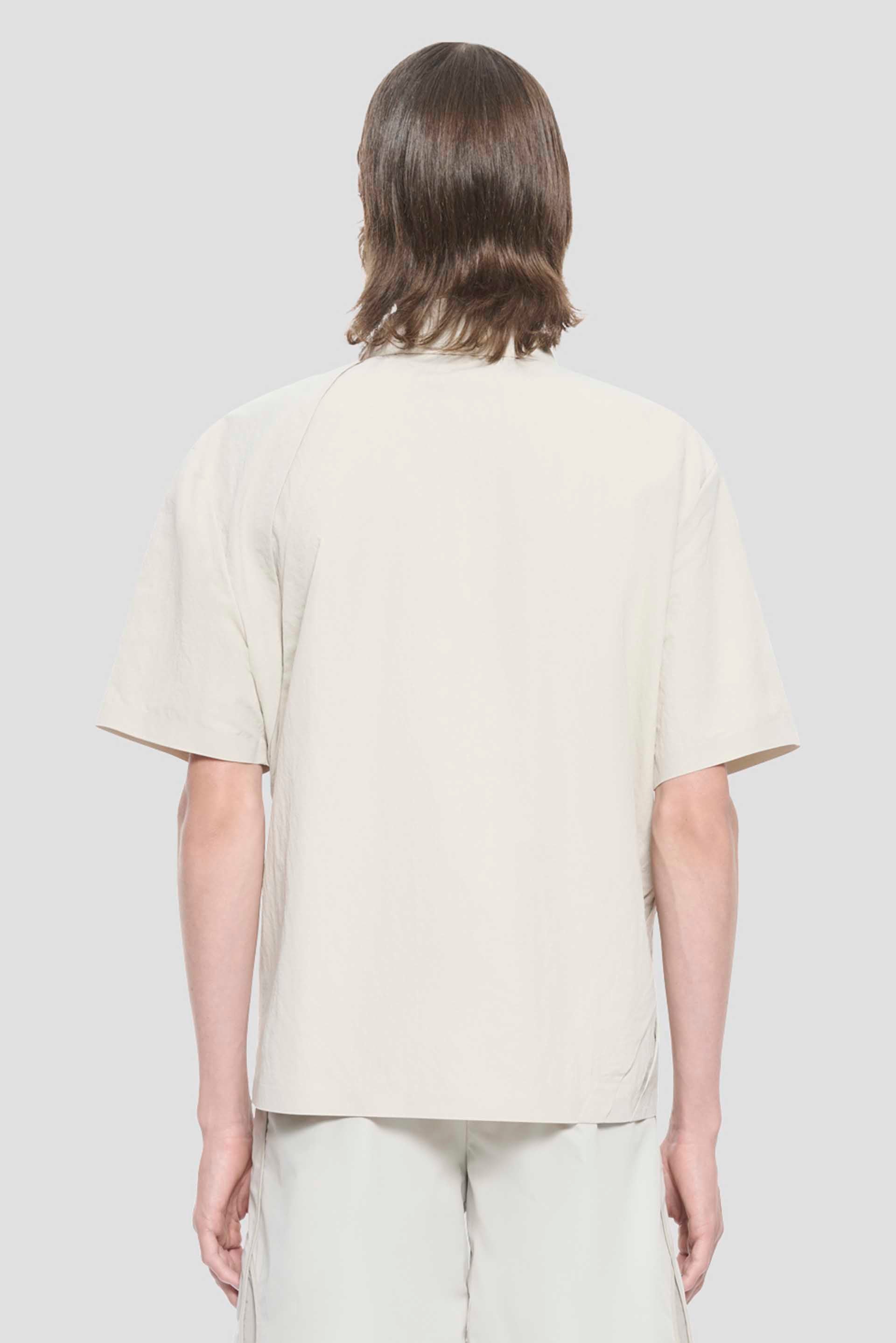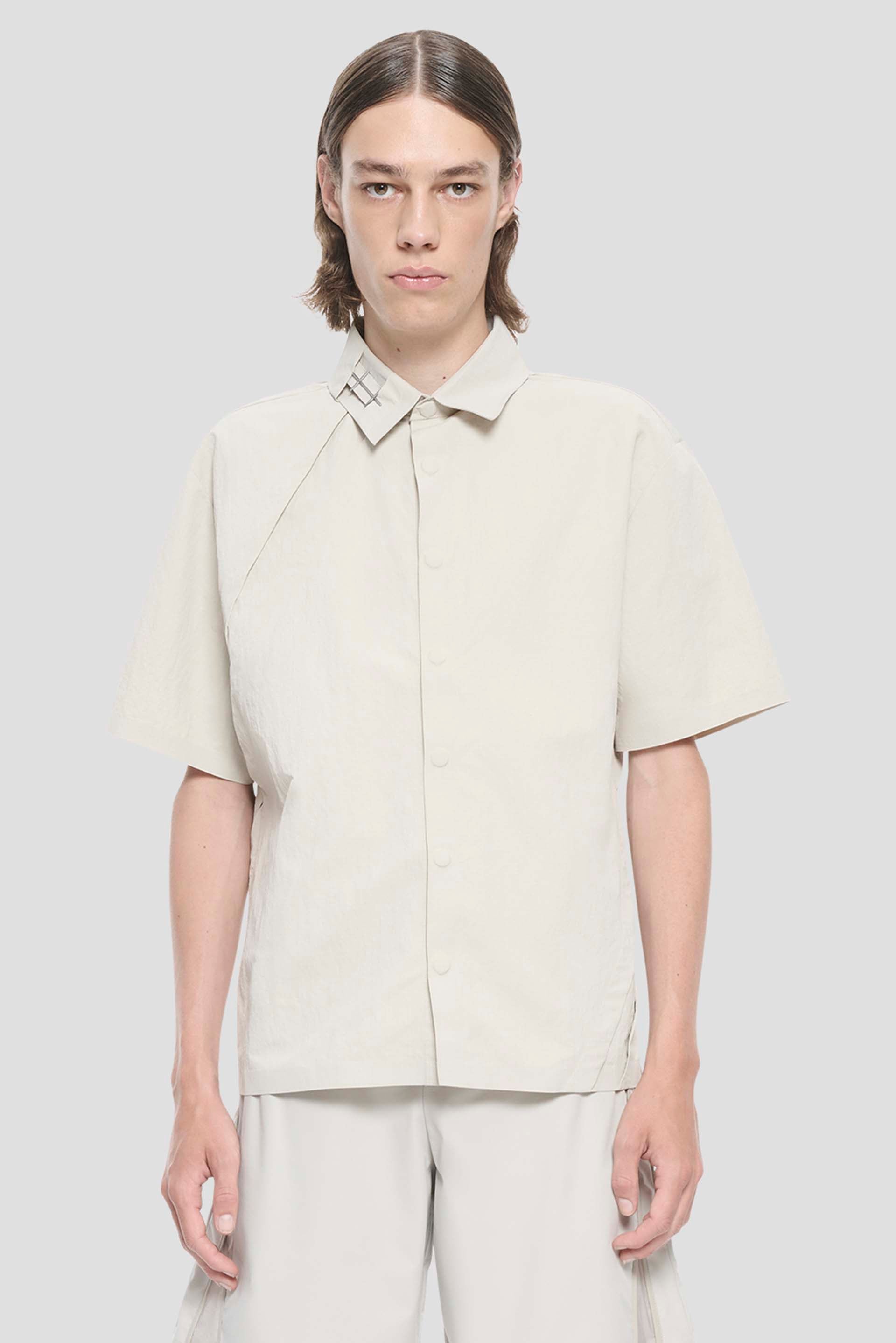 Heliot Emil Marl Shirt Stone. Short sleeves. Regular collar. Signature metallic details at collar. Button closure at front. Boxy fit. Paper like technical fabric.