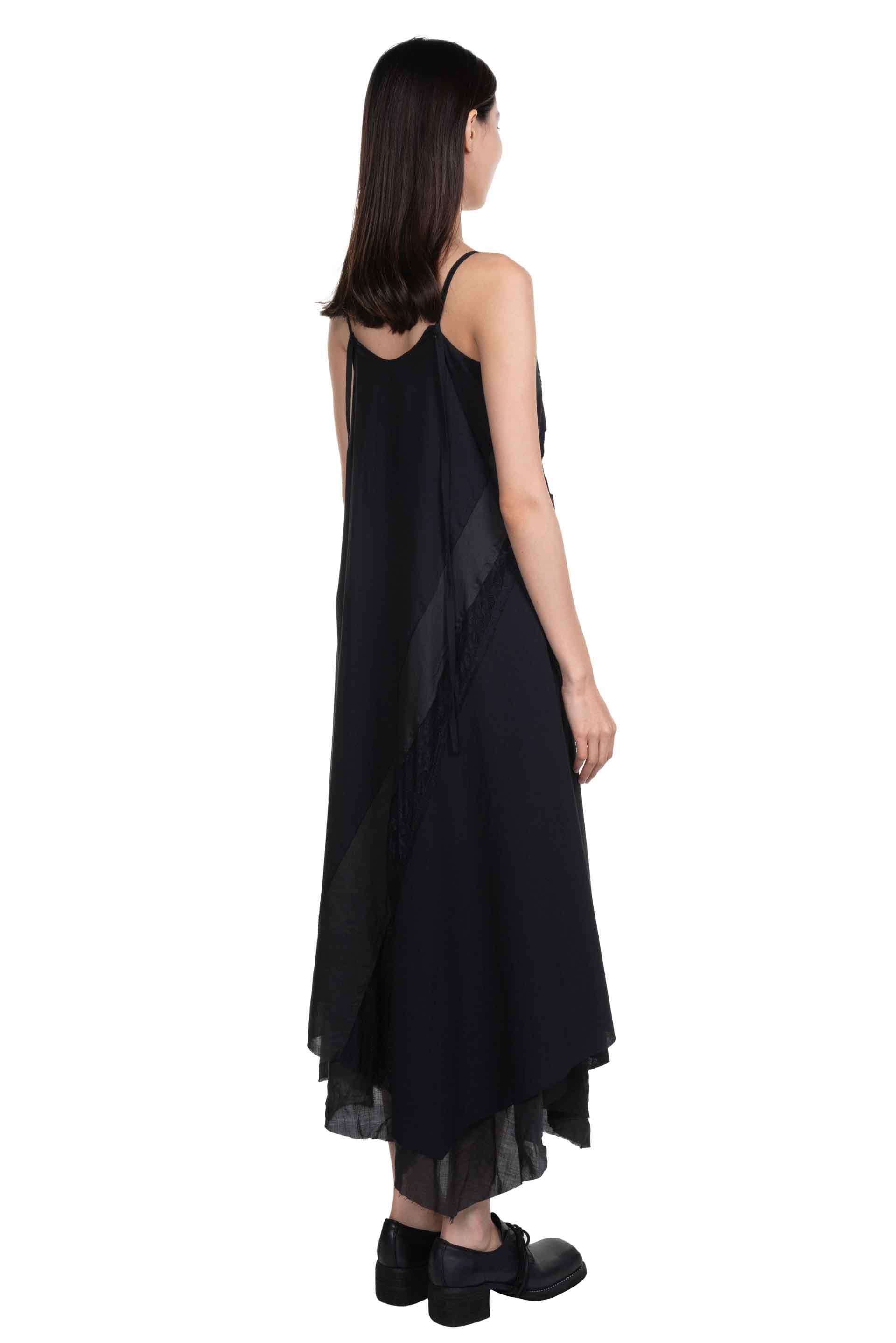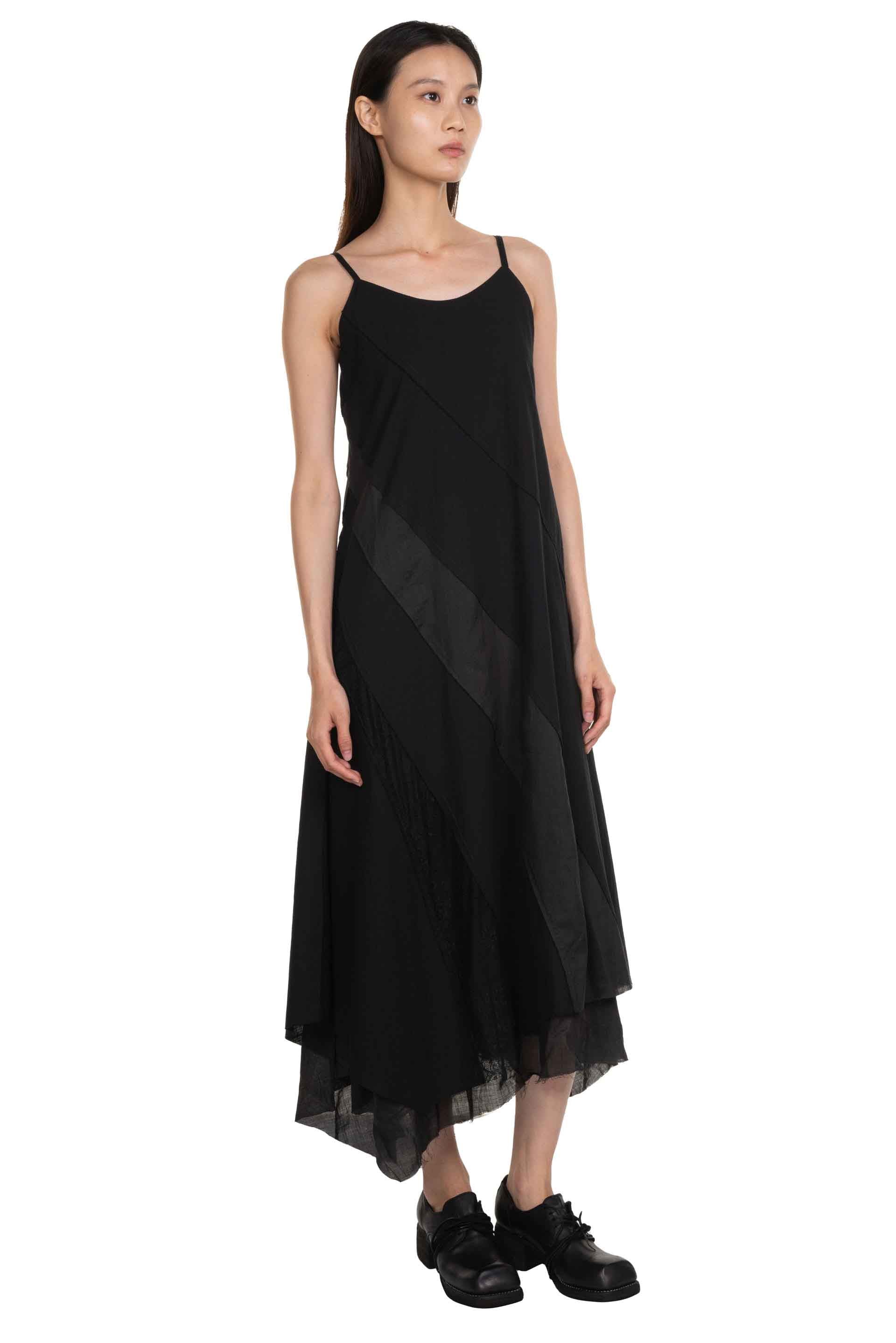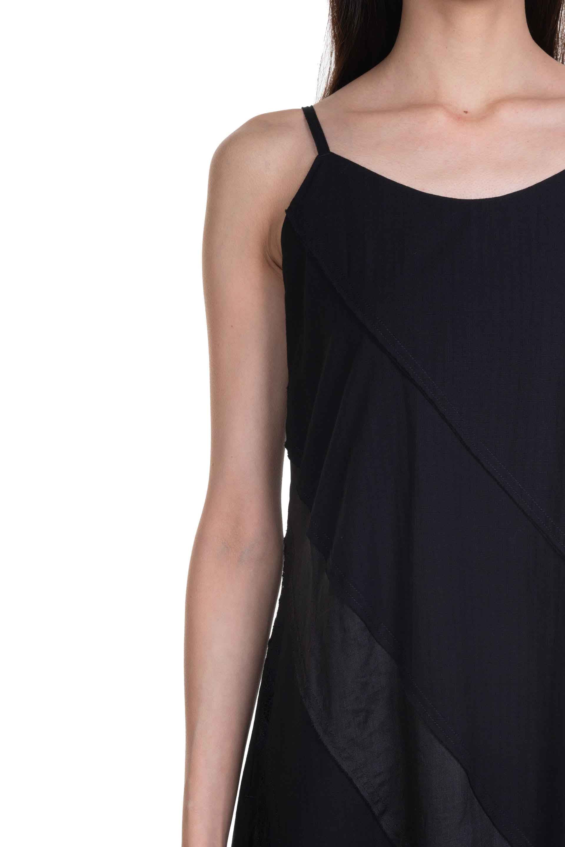 Black Maxi Dress from Professor e. Sleeveless. Adjustable strap at shoulders. Multi fabric layering. Soft and light textural fabric. Raw edges.