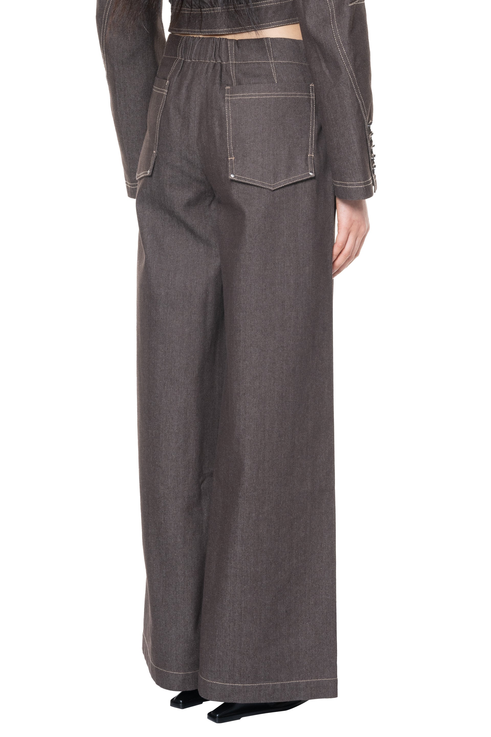 Button closure at waist. Elastic at back. Zip fly closure at front. Two side pocket. Two back pockets. Wide leg.