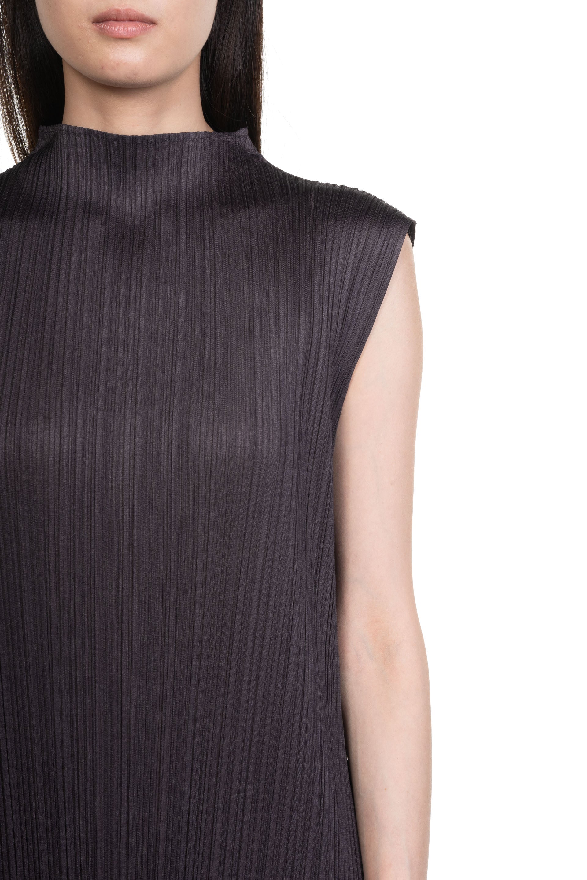 This sleeveless pleated midi dress in Black Charcoal navy has a mock neckline.