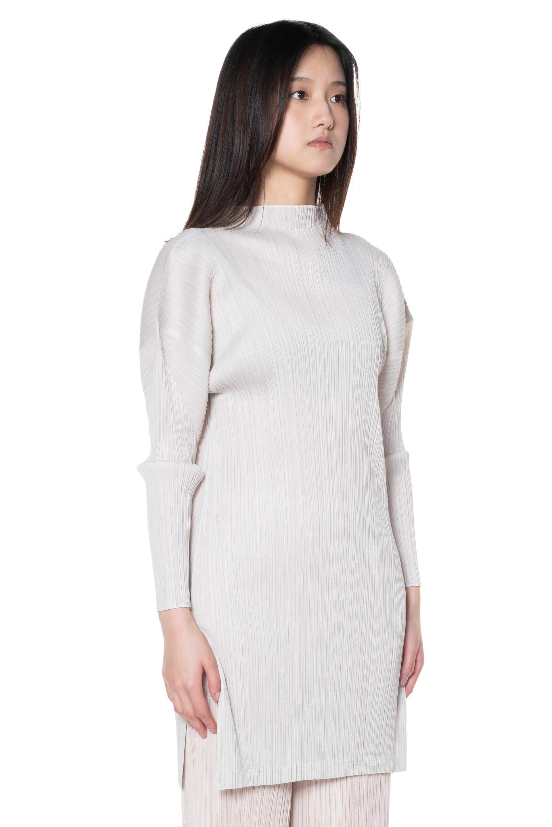 This ivory tunic features dropped pointed shoulders, a mock neckline and side slits.