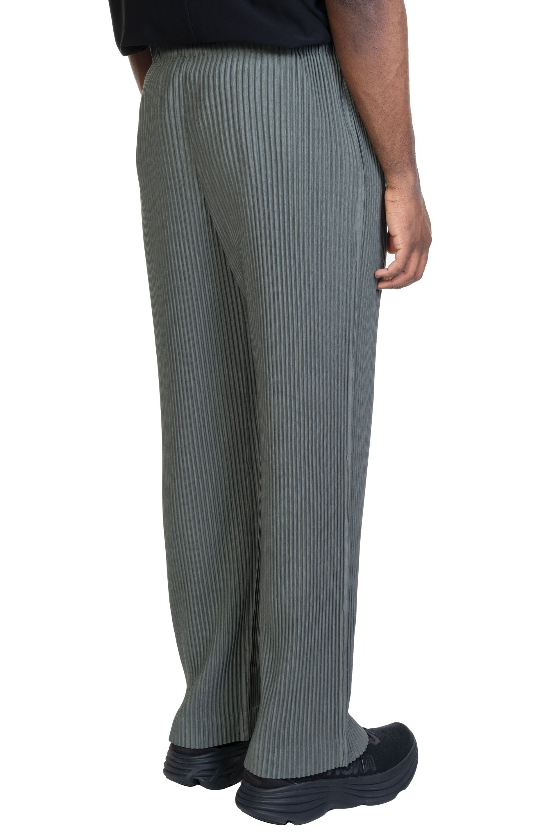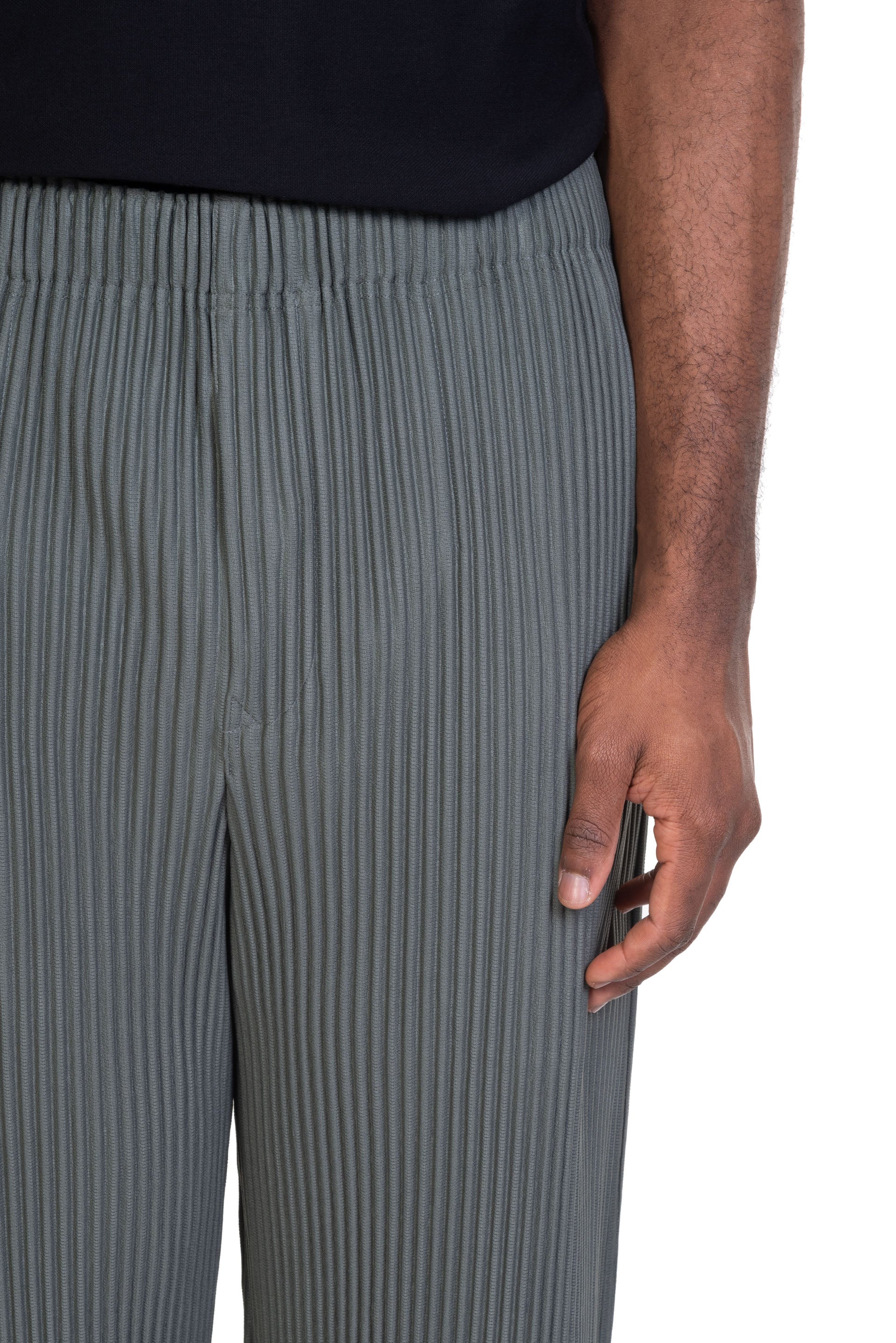 Issey Miyake Homme Plisse MC October Trousers Moss Green. These straight-leg pleated trousers in moss green have an elasticated waistband with an inner draw cord, a button fly and side pockets.
