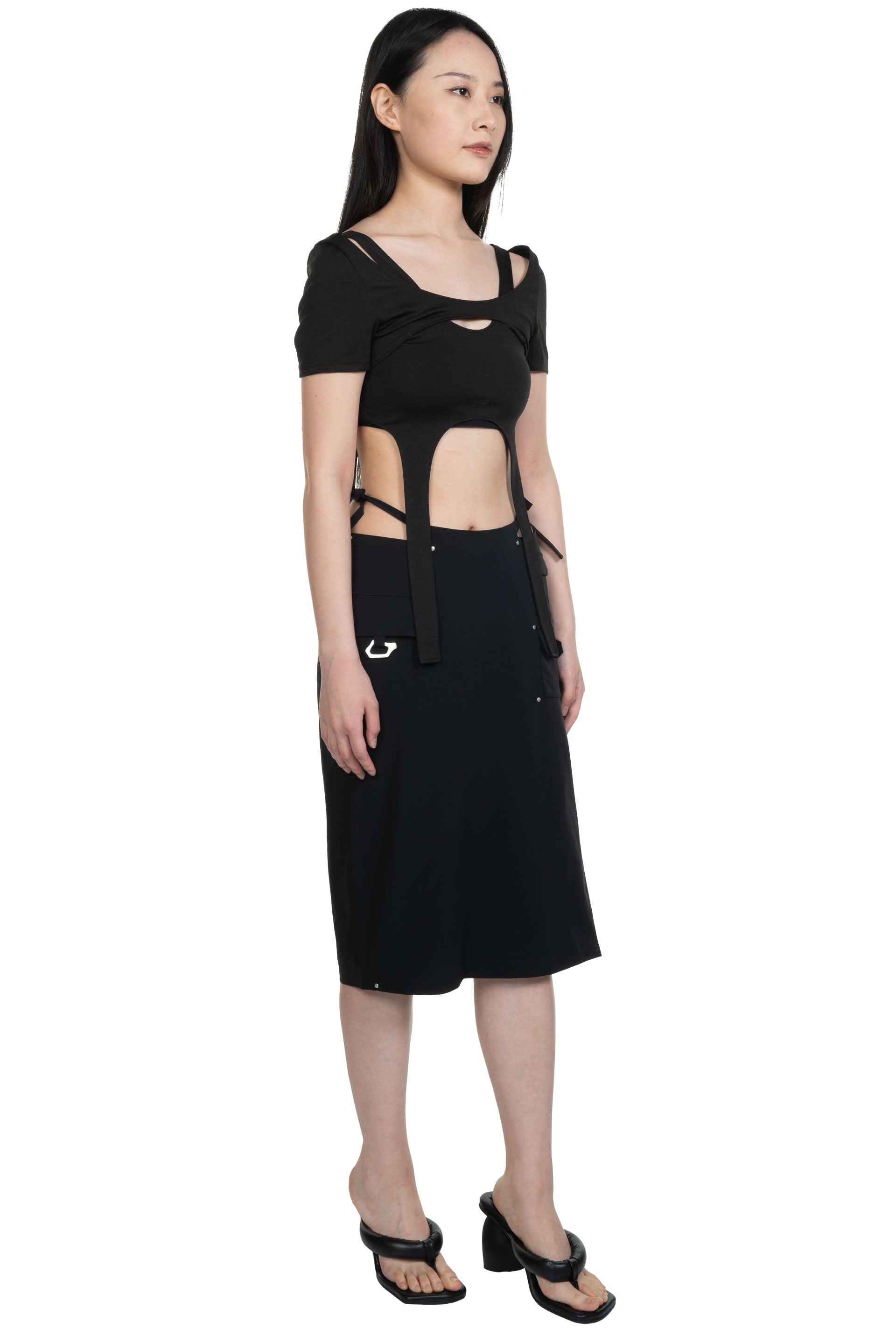 Technical wear. Long slit. Small Carabiner. Thong detail.