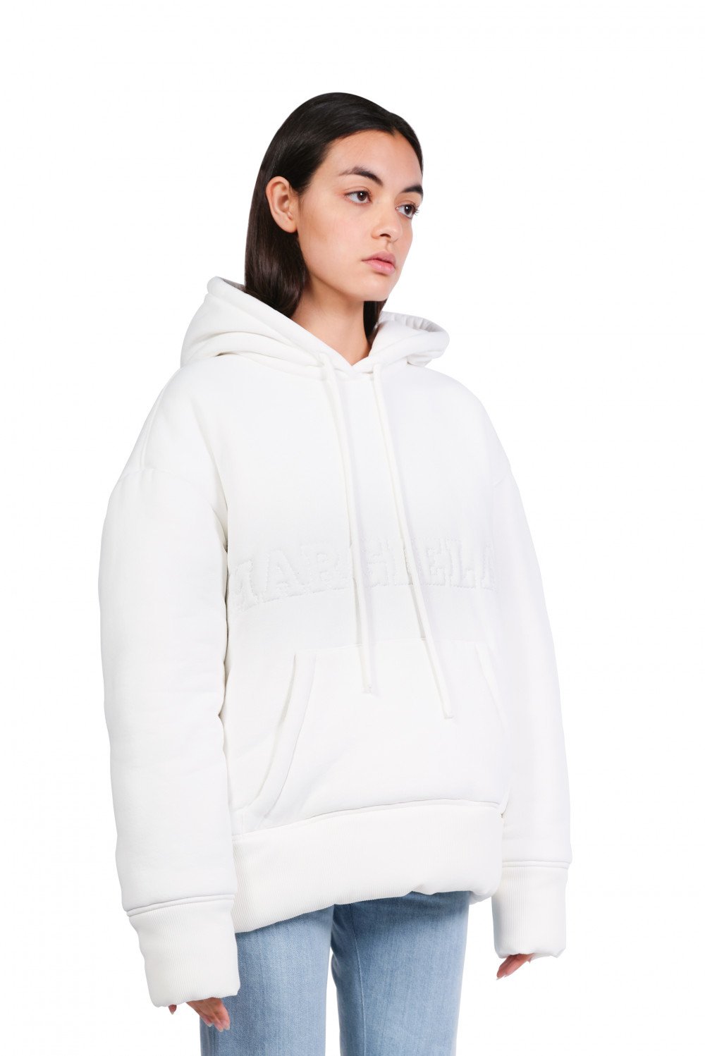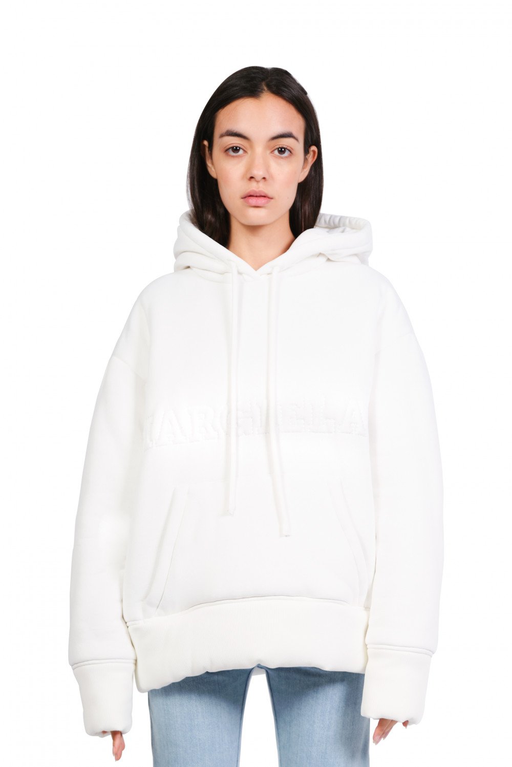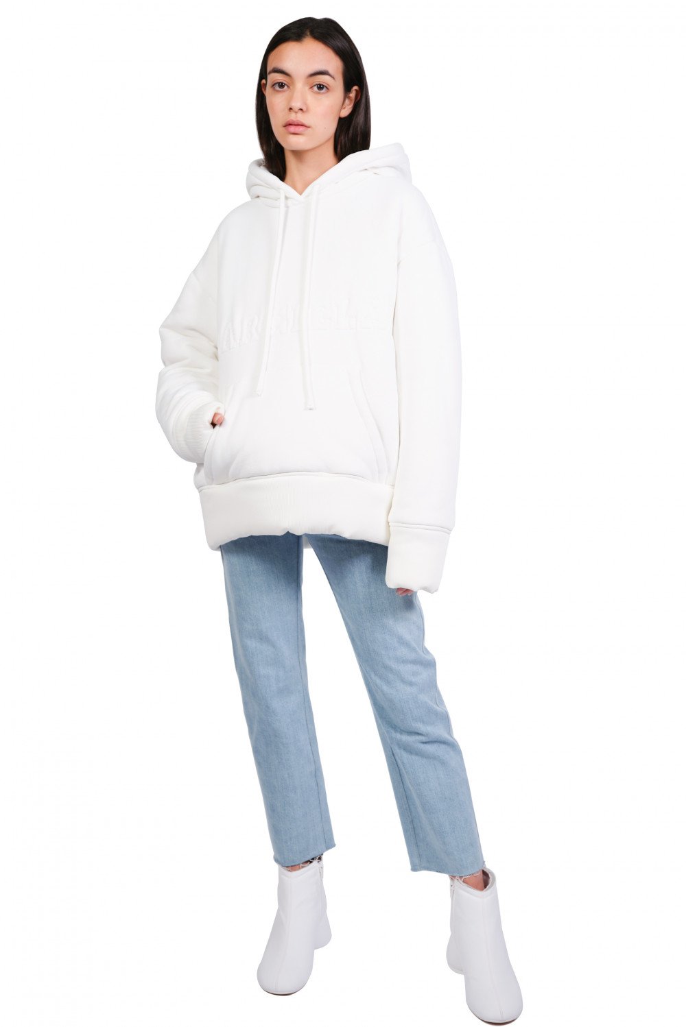 MM6 is known for its sporty ready-to-wear and off-beat accessories, more casual, street-inspired take on the Maison's intellectual approach to luxury as seen in the White Padded Hoodie.