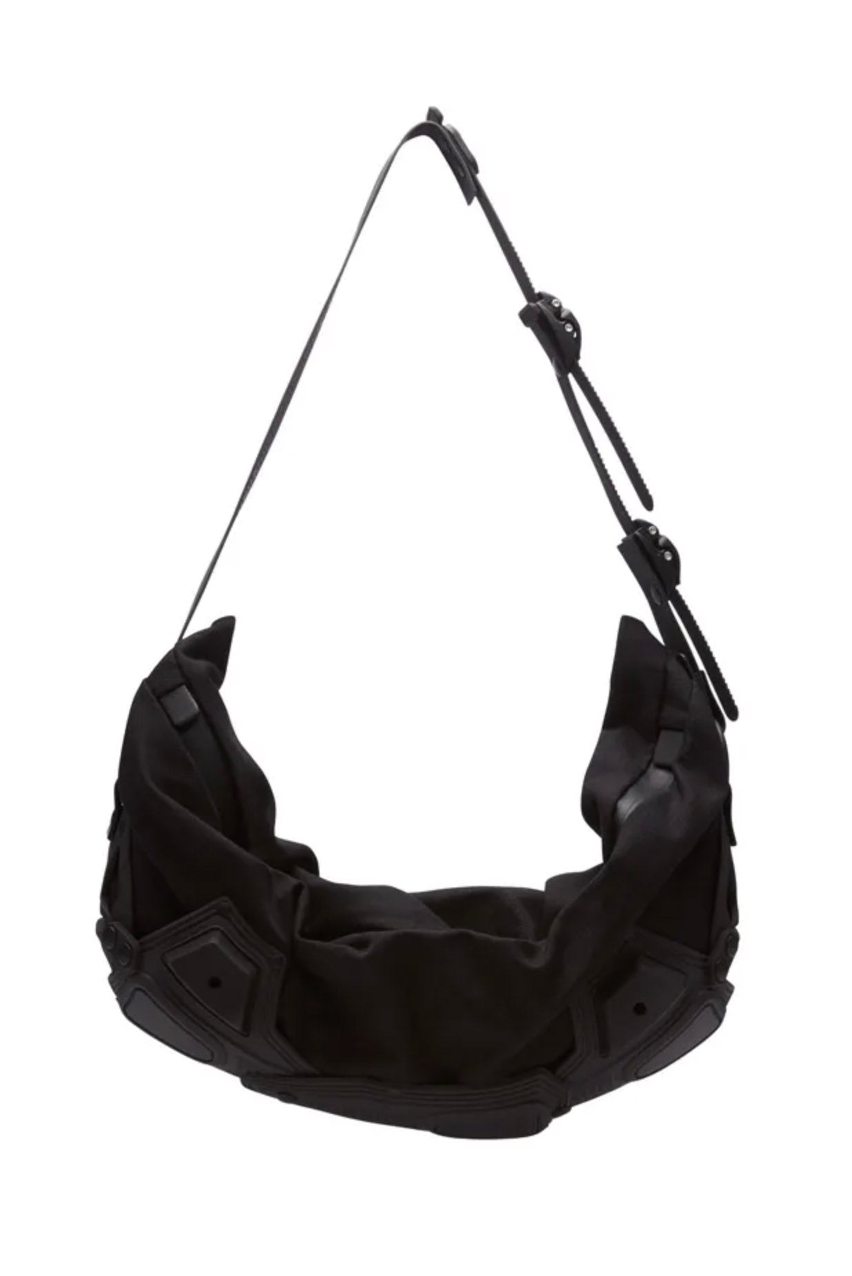 Colour:  Black Matt. Composition: Shell: 100% PU. Fabric: 100% Cotton. Lining: 100% Cotton. Trim: 100% PU. Strap + Extension strap: 100% PU. Measurements: H: 20 cm W: 40 cm D: 10 cm Strap: 55/76 cm. Weight: 0,65 kg. Made in Italy