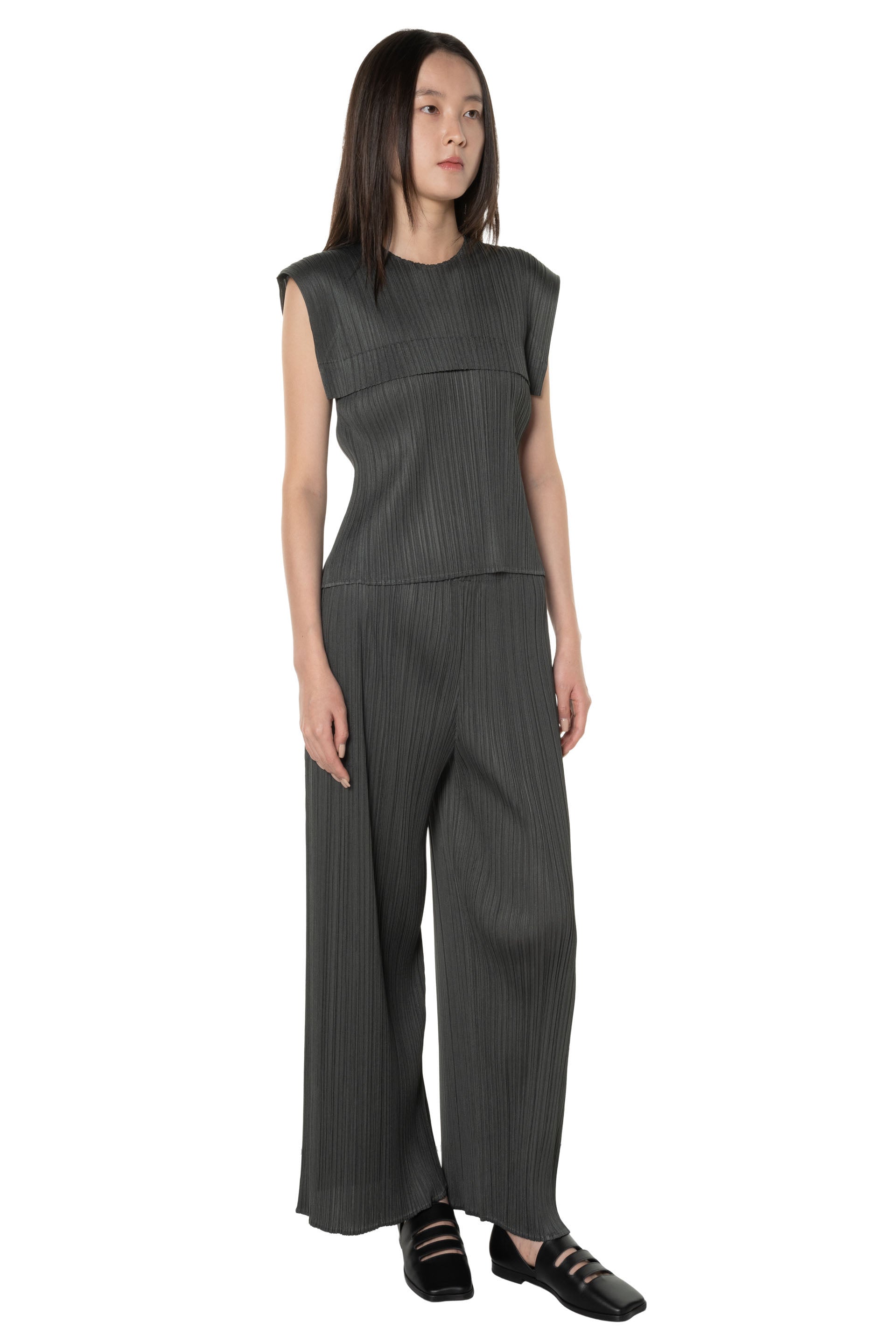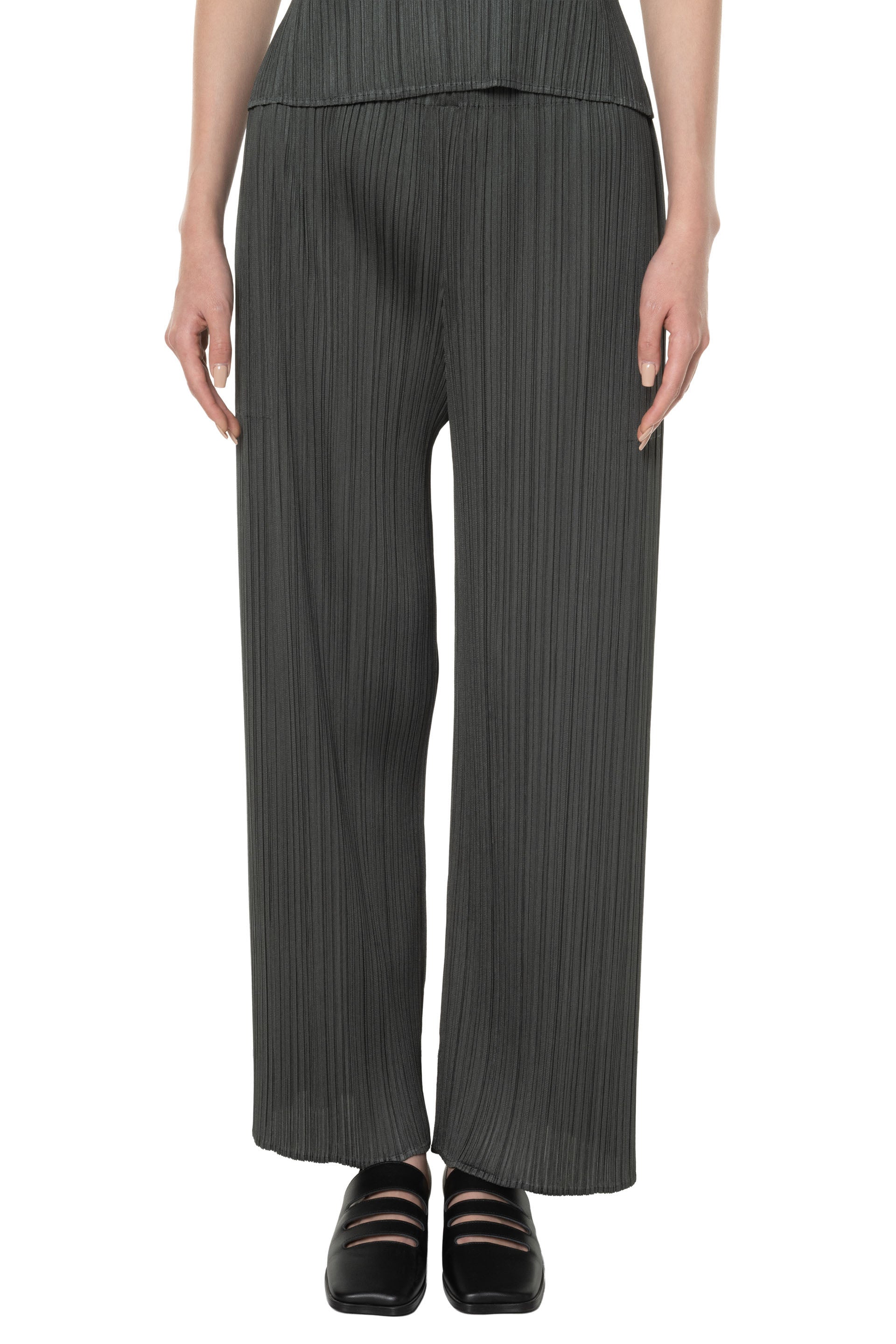 Pleats Please Monthly Colors June Trousers Charcoal Grey. Cropped fit. Wide-leg pleated trousers in Charcoal Grey have an elasticated waistband and side pockets.