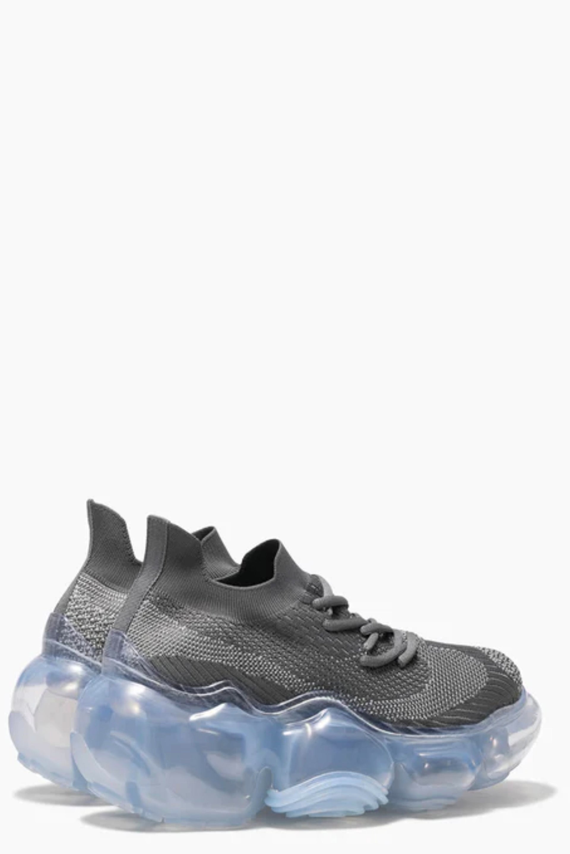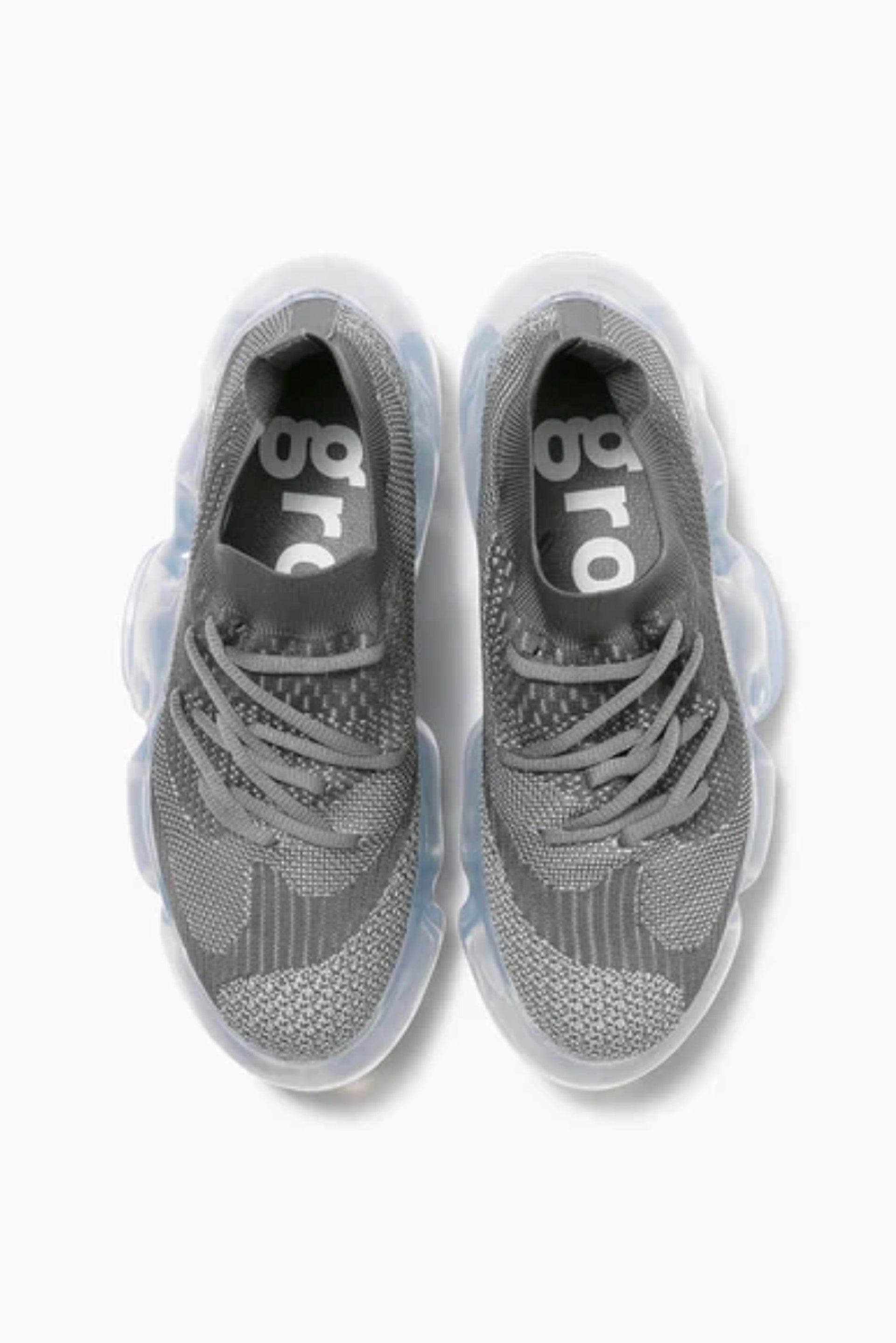 Grounds translates the pulse of Japanese youth into bold shoe design as seen with the Moopie Charcoal Ice Gray. Footwear that looks as if you have stepped on something huge and gel-like The outsole, which is supposed to be sturdy to support the entire body, is deliberately made to look fluid and soft, a design that tickles the playful spirit. The rubber parts on the outside add an accent to the design. The upper has a delicate finish in contrast to the voluminous soles. The sharp shape, the nape of the foot, and the gentle slope from the toe to the heel give the impression of an elegant and slender style that is not found in existing sneakers. The asymmetrical layout of the shoe holes and pattern on the knit upper is a continuation of the abstract design of the outsole. Despite the thick soles, the entire sole is designed to support the body and provide adequate cushioning to prevent walking fatigue.
