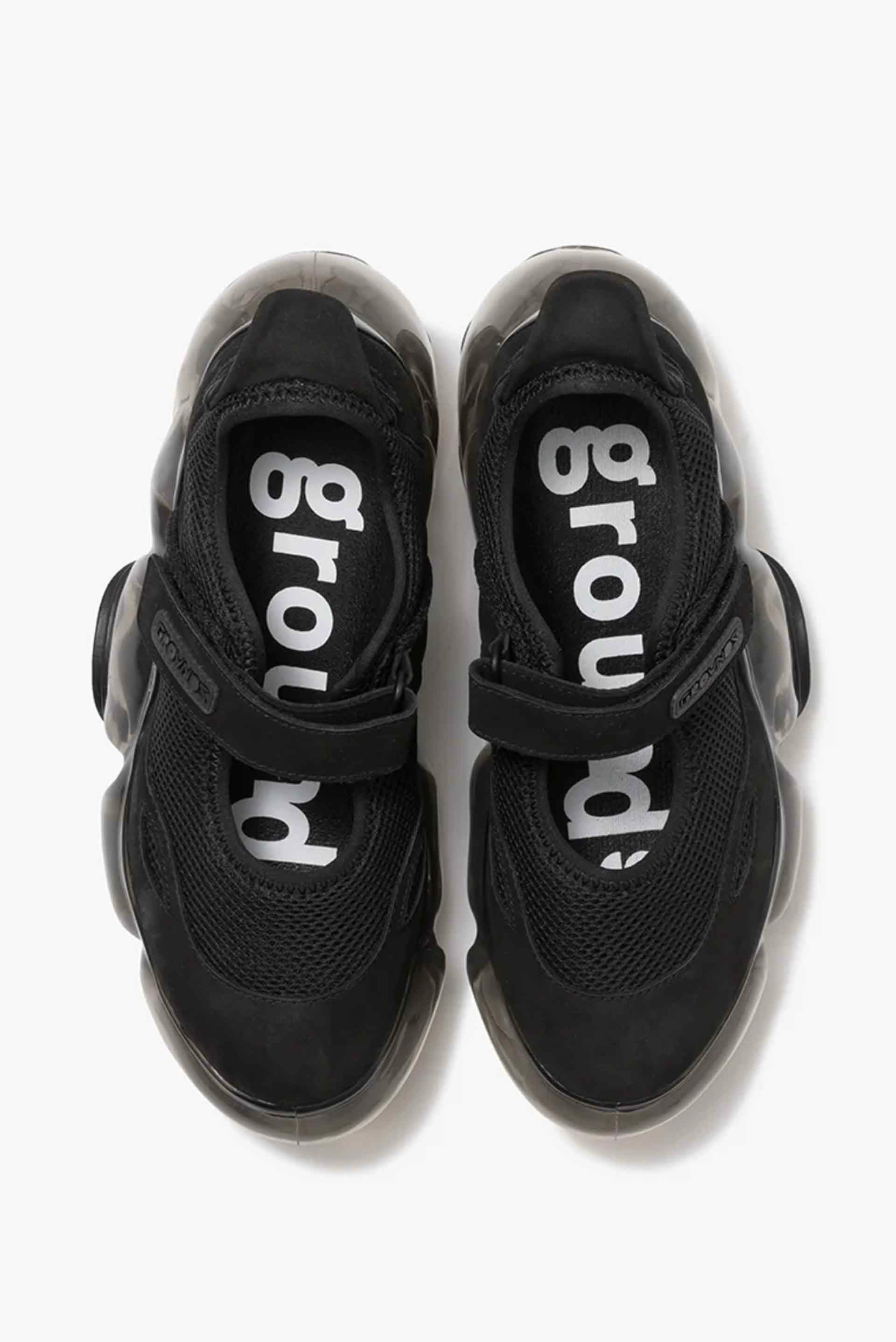 Grounds translates the pulse of Japanese youth into bold shoe design as seen with the Moopie Mary Jane Black Black. Footwear that looks as if you have stepped on something huge and gel-like. The outsole, which is supposed to be sturdy to support the entire body, is deliberately made to look fluid and soft, a design that tickles the playful spirit. The rubber parts on the outside add an accent to the design. The upper has a delicate finish in contrast to the voluminous soles. The sharp shape, the nape of the foot, and the gentle slope from the toe to the heel give the impression of an elegant and slender style that is not found in existing sneakers. The upper is a Mary Jane made of a combination of different materials.