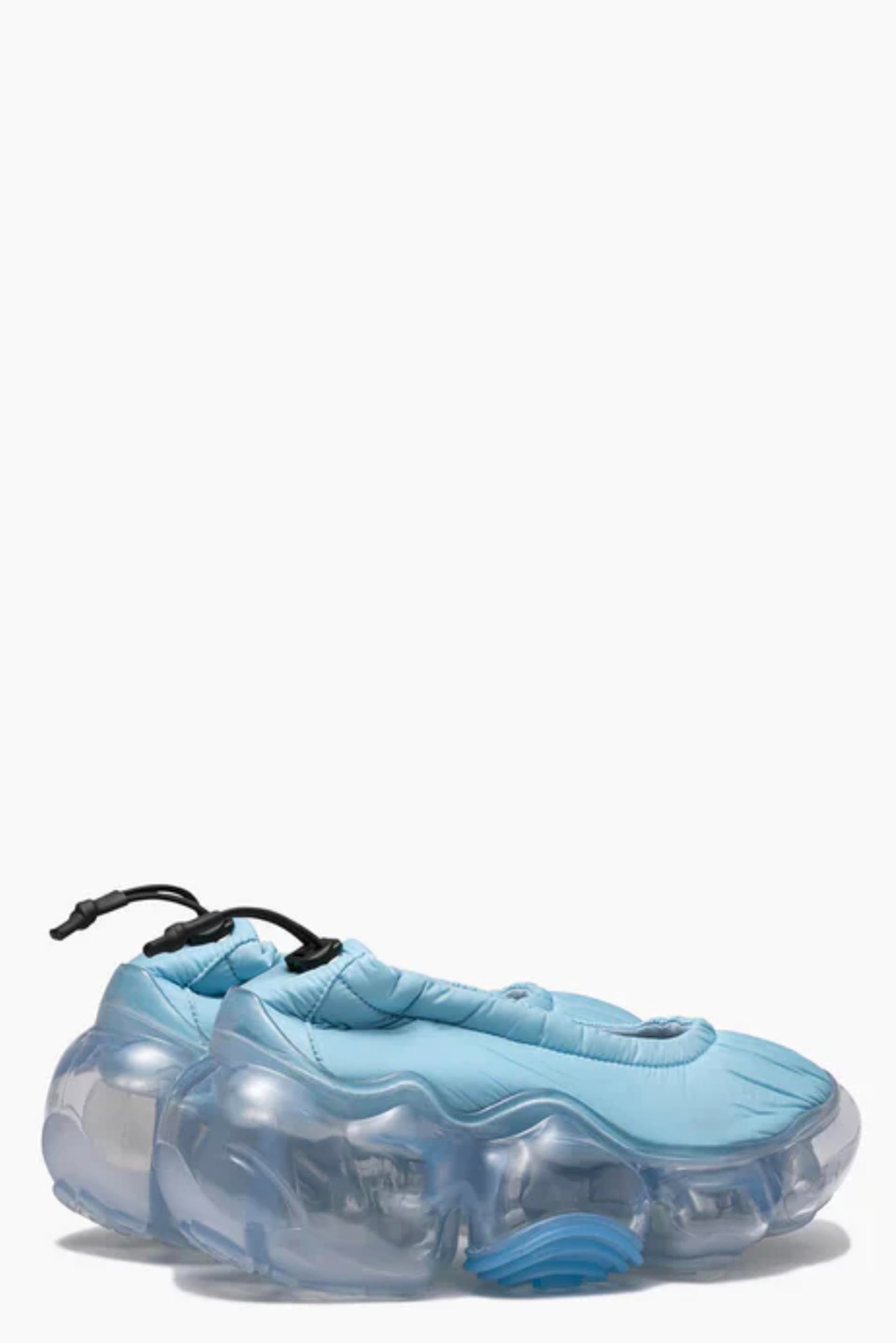 Footwear that looks as if you have stepped on something huge and gel-like. The outsole, which is supposed to be sturdy to support the entire body, is deliberately made to look fluid and soft, a design that tickles the playful spirit. The rubber parts on the outside add an accent to the design. The upper has a delicate finish in contrast to the voluminous soles.The upper has a delicate finish in contrast to the voluminous soles. The sharp shape, the nape of the foot, and the gentle slope from the toe to the heel give the impression of an elegant and slender style that is not found in existing sneakers. Pumps with polyester fabric upper. The size can be adjusted with a cord stopper.