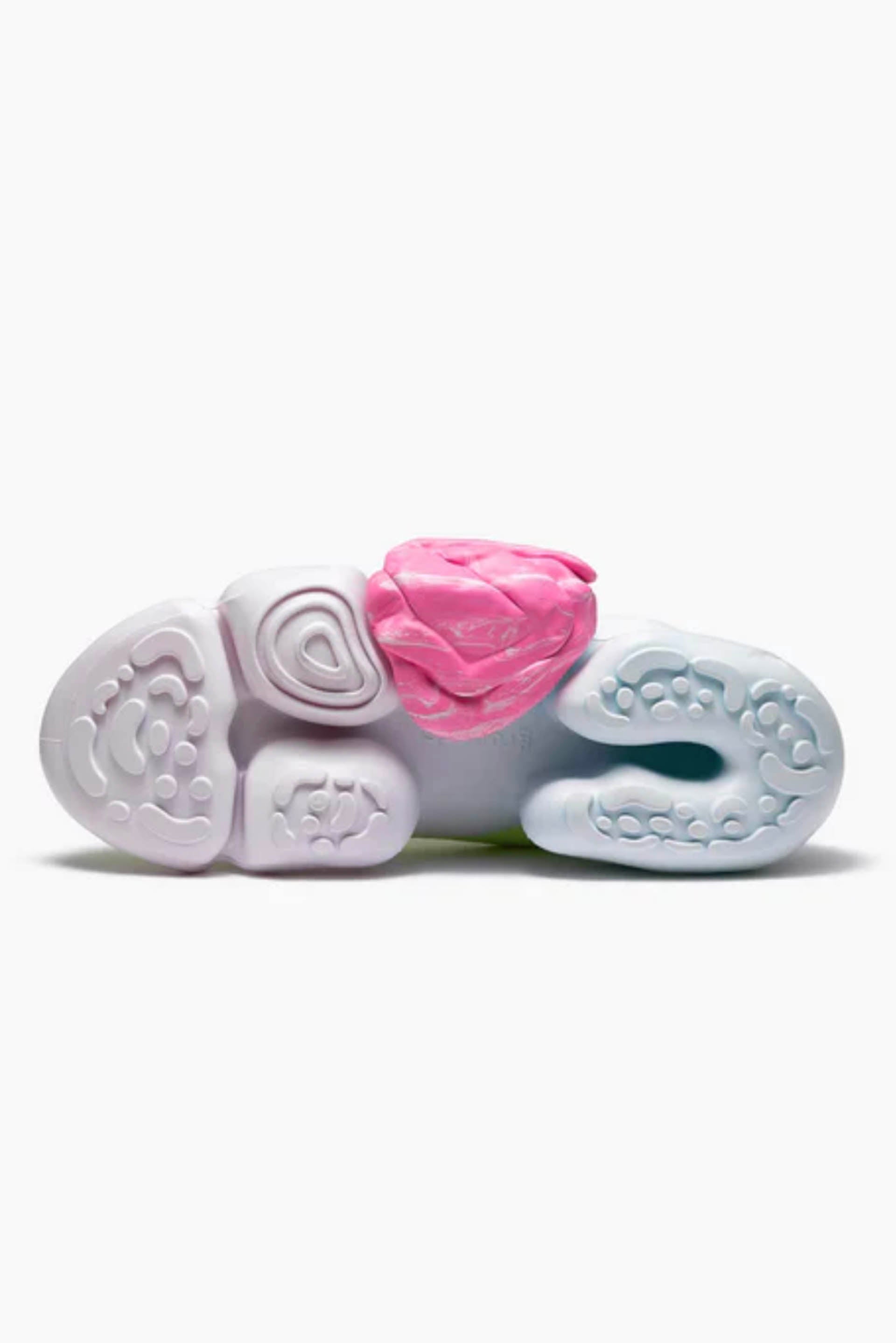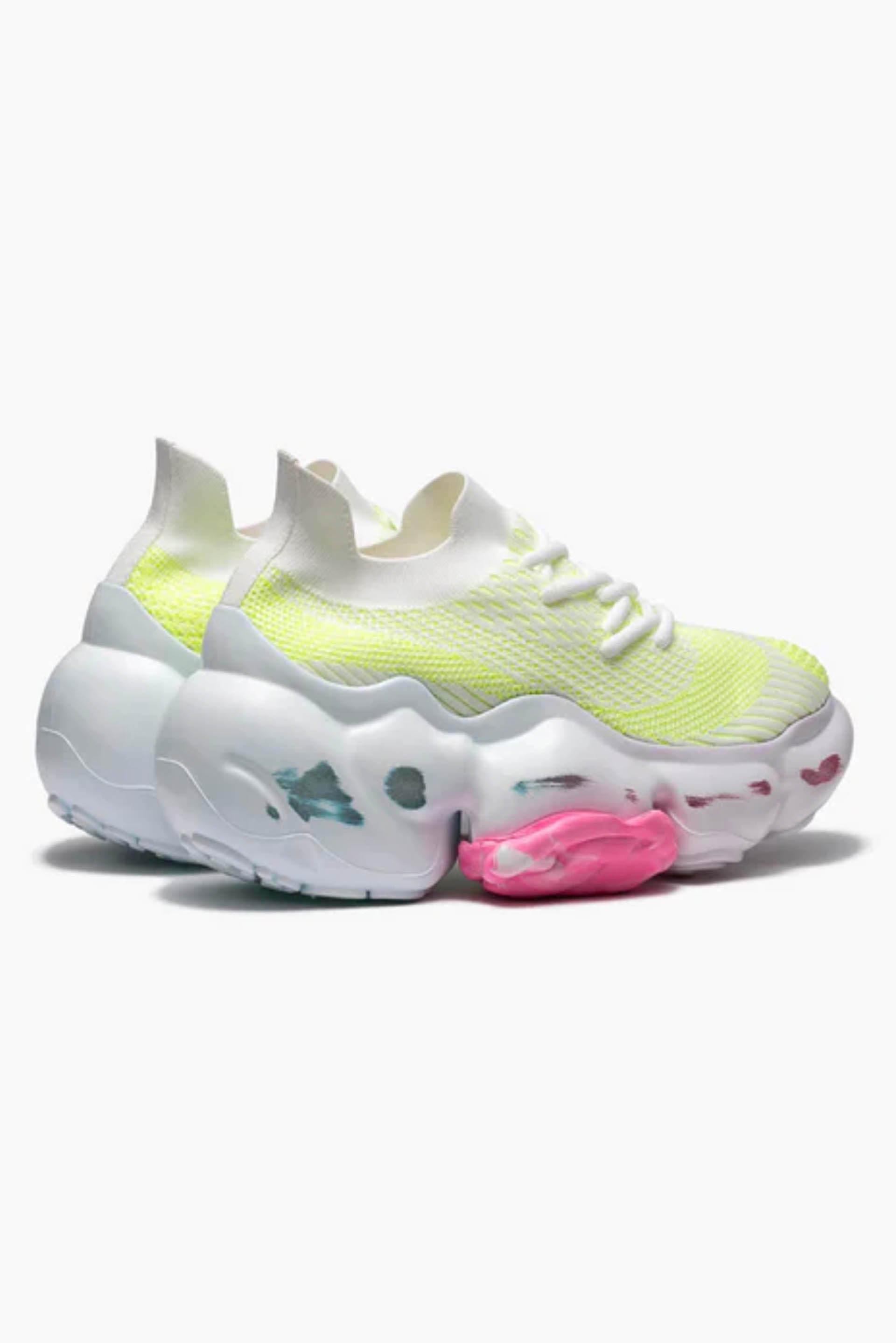 Footwear that looks as if you have stepped on something huge and gel-like. The outsole, which is supposed to be sturdy to support the entire body, is deliberately made to look fluid and soft, a design that tickles the playful spirit. The rubber parts on the outside add an accent to the design. The upper has a delicate finish in contrast to the voluminous soles. The sharp shape, the nape of the foot, and the gentle slope from the toe to the heel give the impression of an elegant and slender style that is not found in existing sneakers. The asymmetrical layout of the shoe holes and pattern on the knit upper is a continuation of the abstract design of the outsole. Despite the thick soles, the entire sole is designed to support the body and provide adequate cushioning to prevent walking fatigue.Colour: White Neon White Scratch. The height of the heel is approximately 7cm.