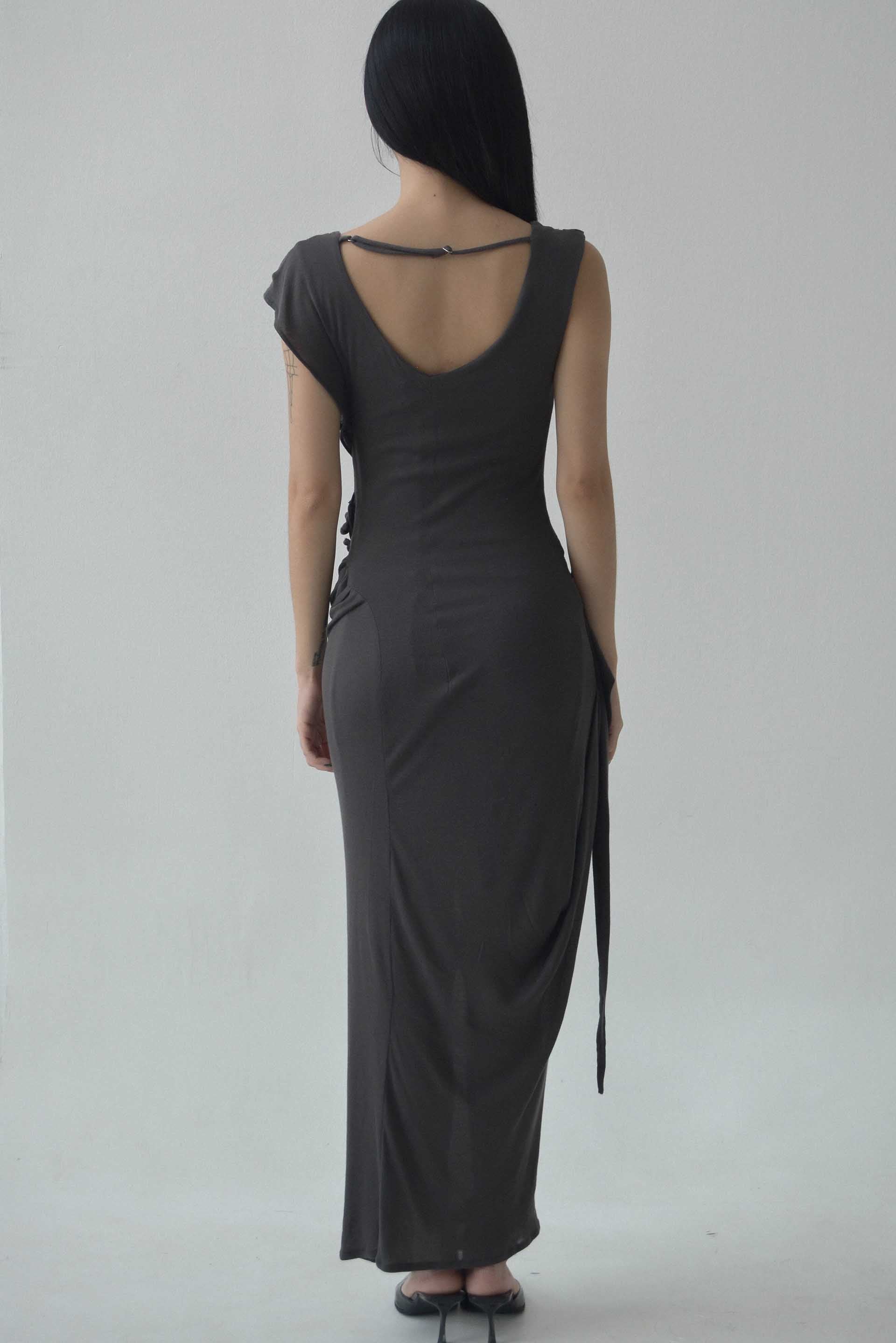 The Morph Grey Dress is a fitted jersey design featuring asymmetrical draping, cut-out, braided accents, and hanging strap details.