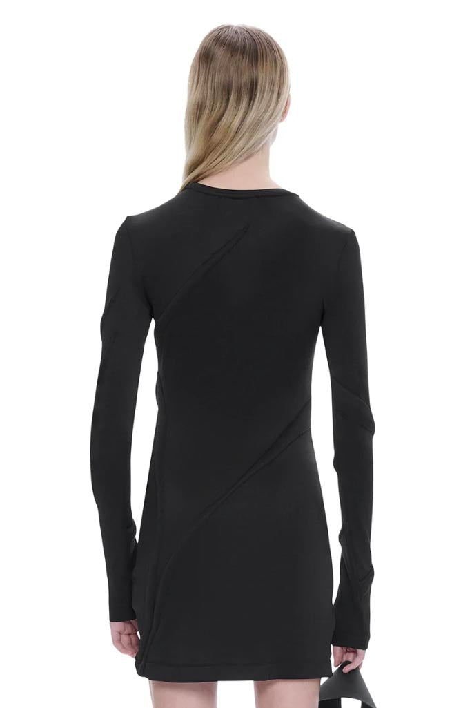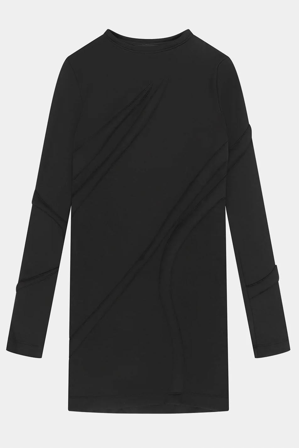 Body hugging dress with organic padding details & long sleeves. Slim fit. Lightweight jersey. Asymmetric padding detailing on body and sleeves. Organic shapes