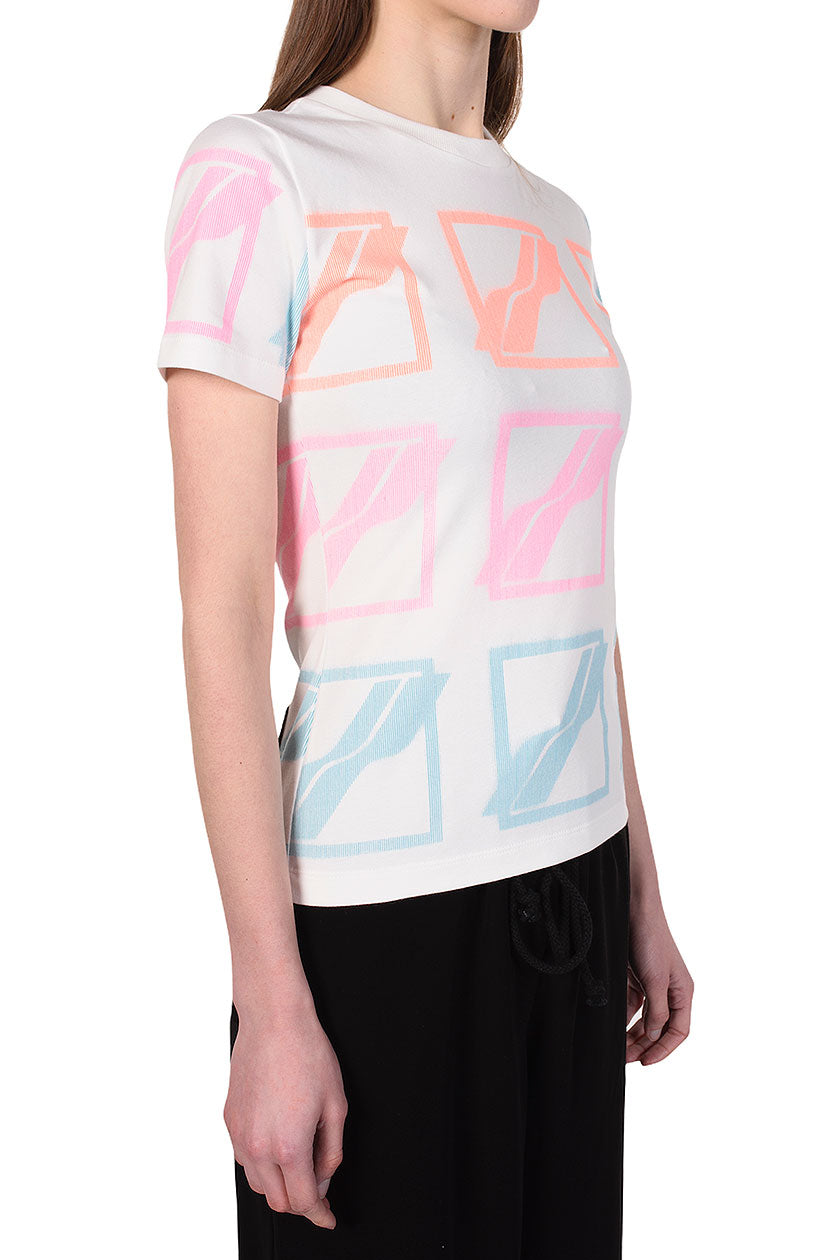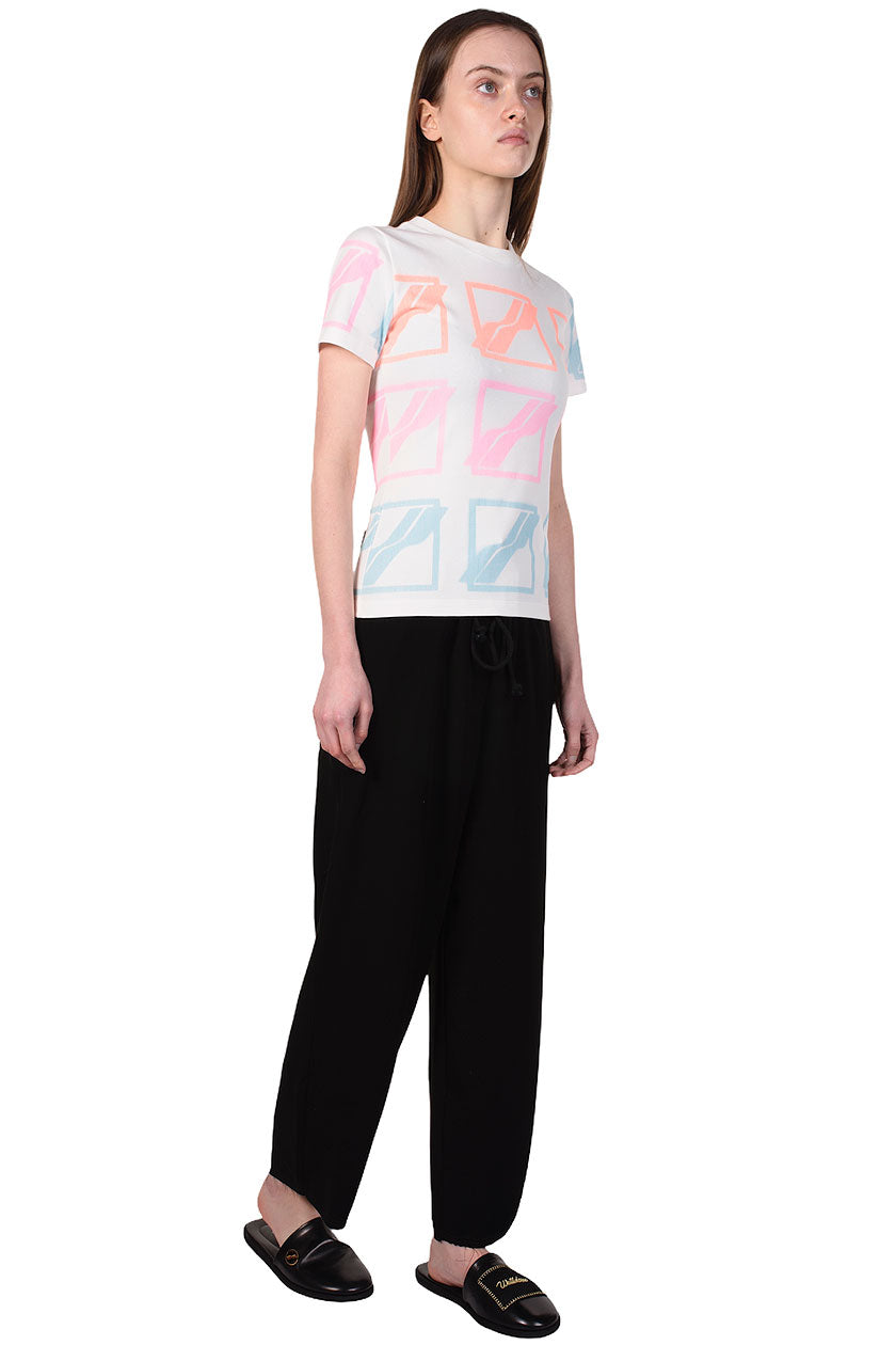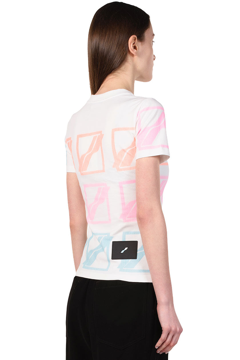 We11done merges late 1990s and early 2000s aesthetics creating a feeling of futurity. Functional, sportive, and sleek, We11done’s versatile designs refine classic elements into contemporary lifestyle pieces as seen with the Short sleeve stretch cotton jersey T-shirt in white. Rib knit crewneck collar. Printed logo pattern in orange, pink, and blue throughout. Rubberised logo appliqué in black at back waist.