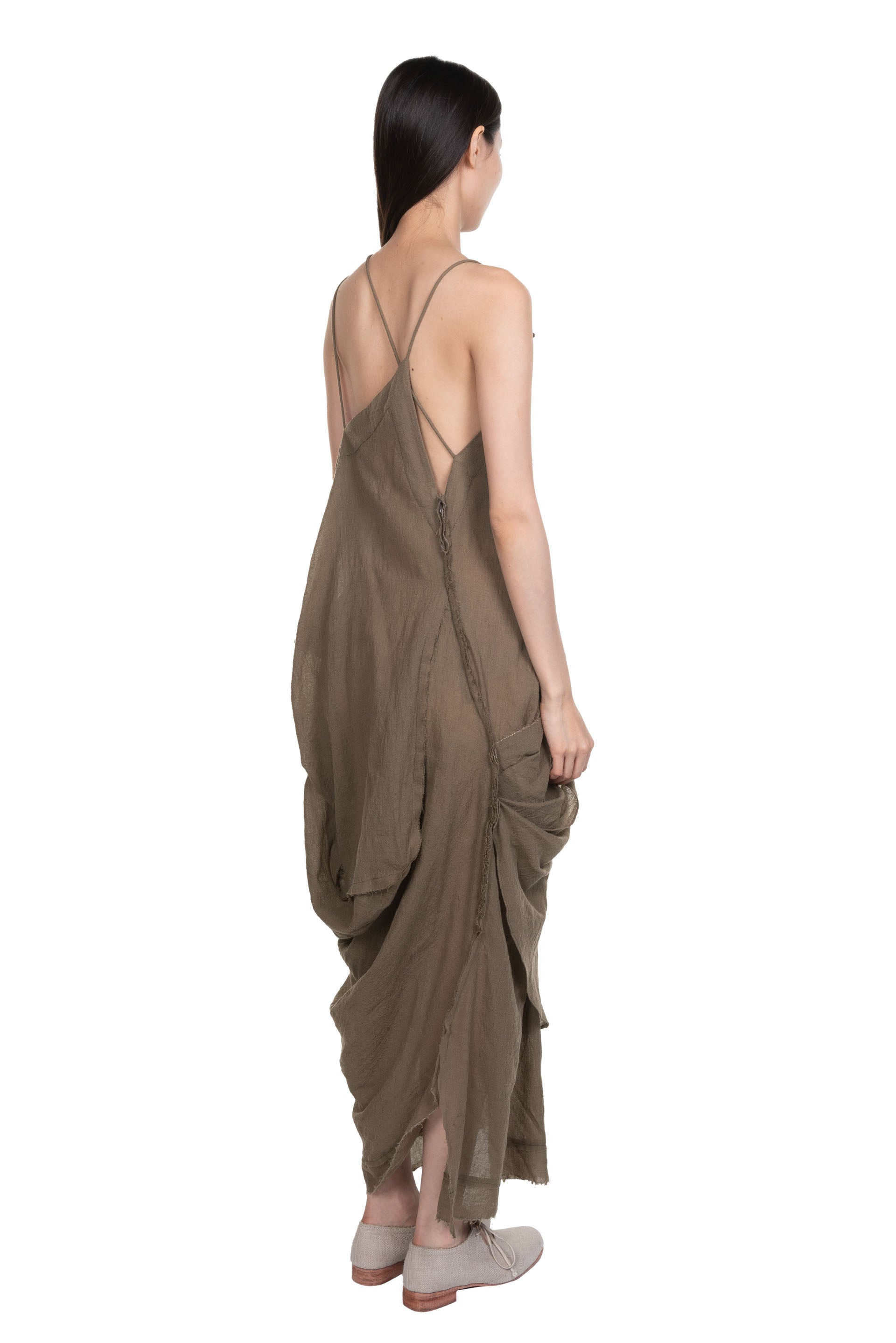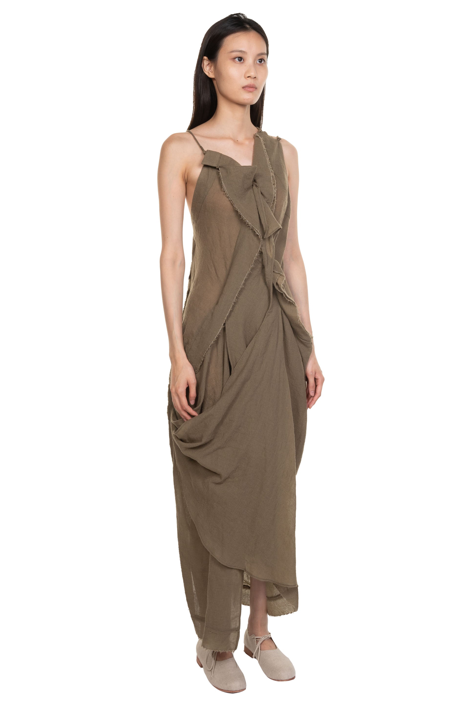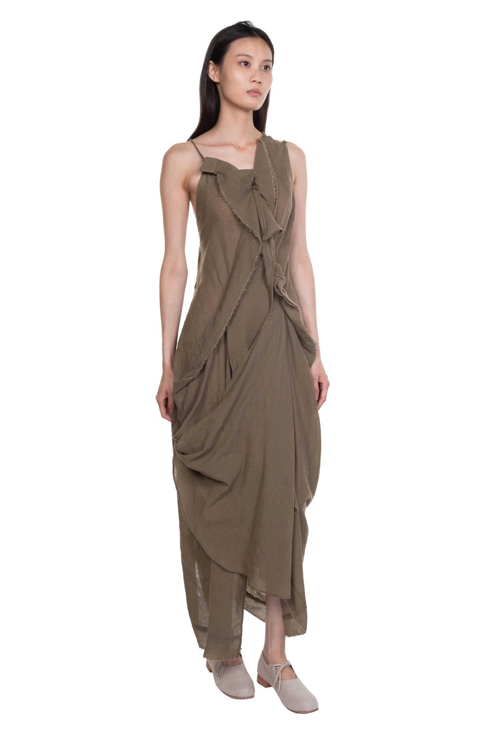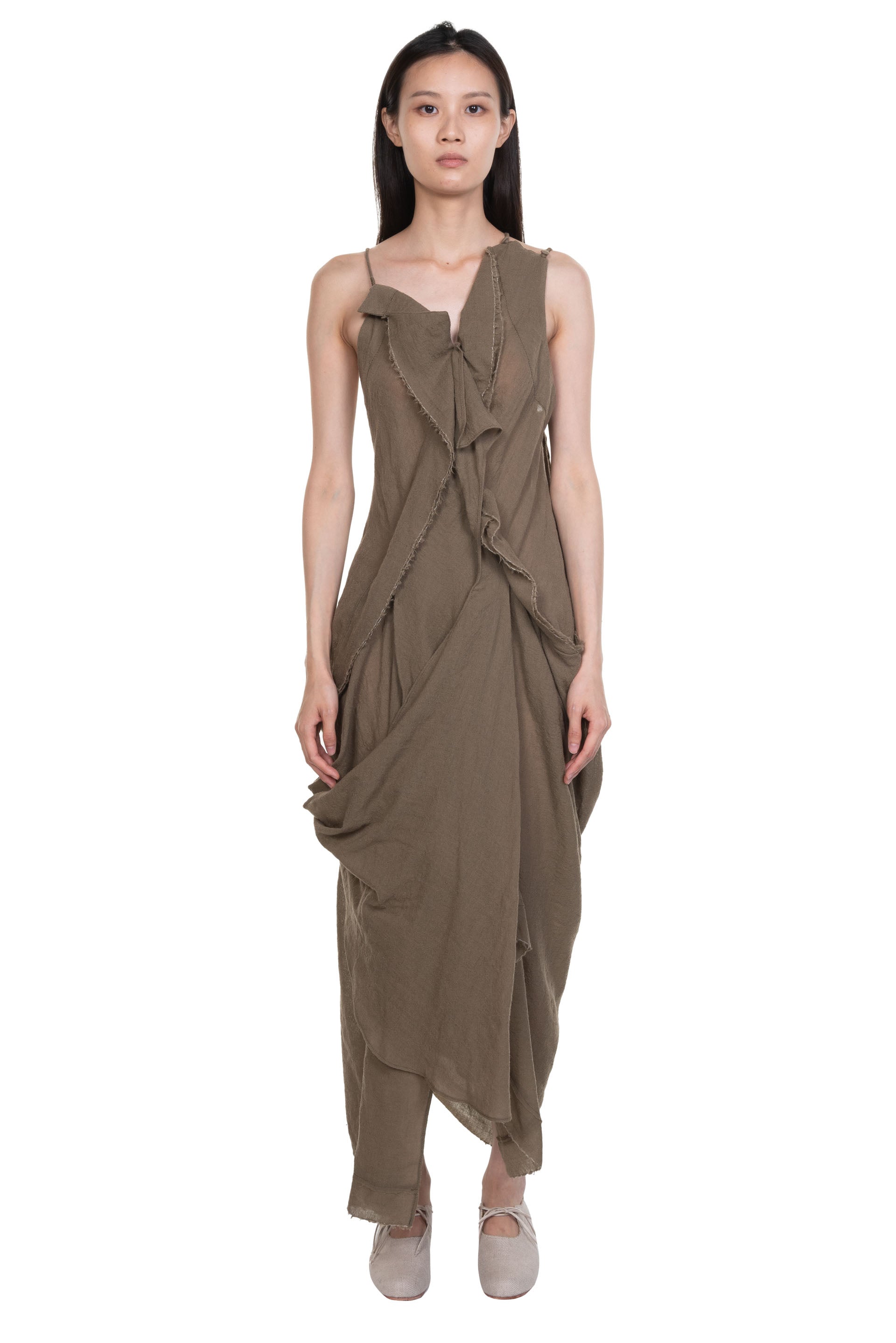 Yehuafan Asymmetric dress in Mustard colour. Sleeveless. Deconstructed. Button closure at front. Open Back. Soft lightweight fabric. Distressed details throughout. Two side pockets.