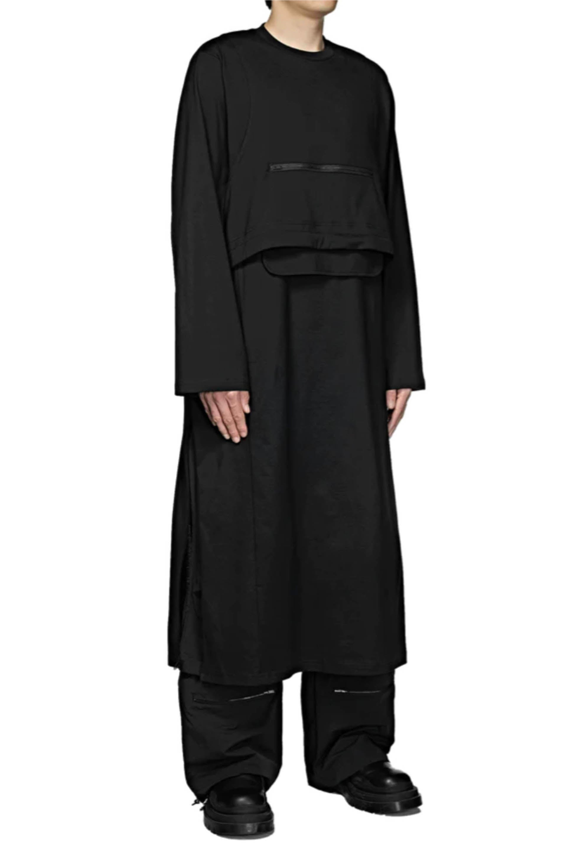 Long sleeve over-length cotton t-shirt in black with top layering featuring a revealed pocket at front with a zipper opening. Crew collar. Elongated side slits with an adjustable belt detailing with tonal buckle. Regular fit. Light weight. Comfortable and breathable.