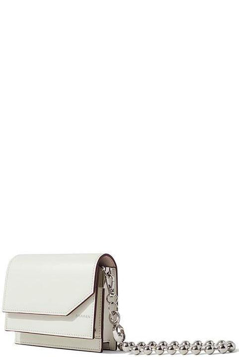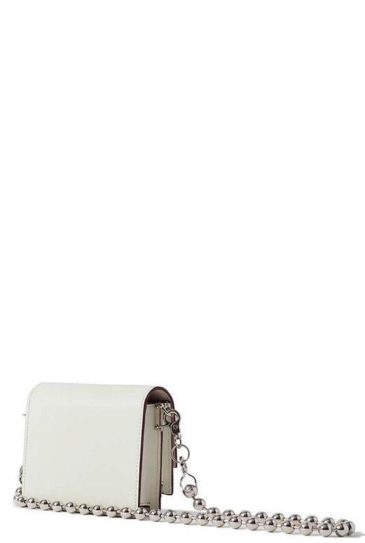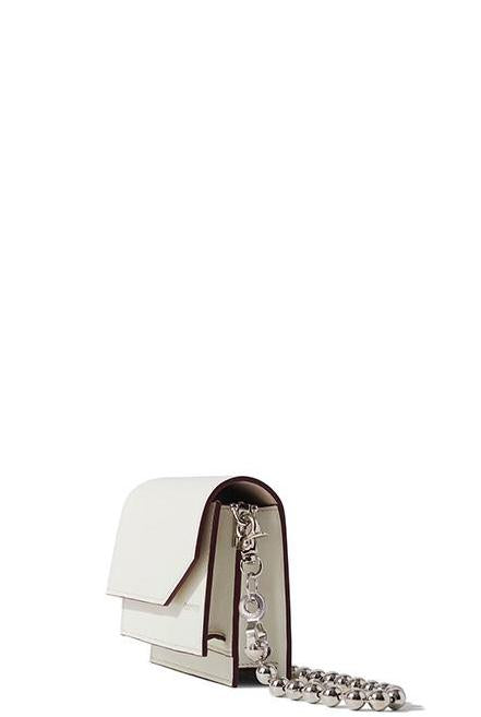 Hanwen Naomi White Mini Shoulder Bag. Buffed calfskin shoulder bag. Silver-tone logo stamp at face. fold-over flap with magnetic fastening. 3 interior compartments with card slot. Tonal leather lining in camel.