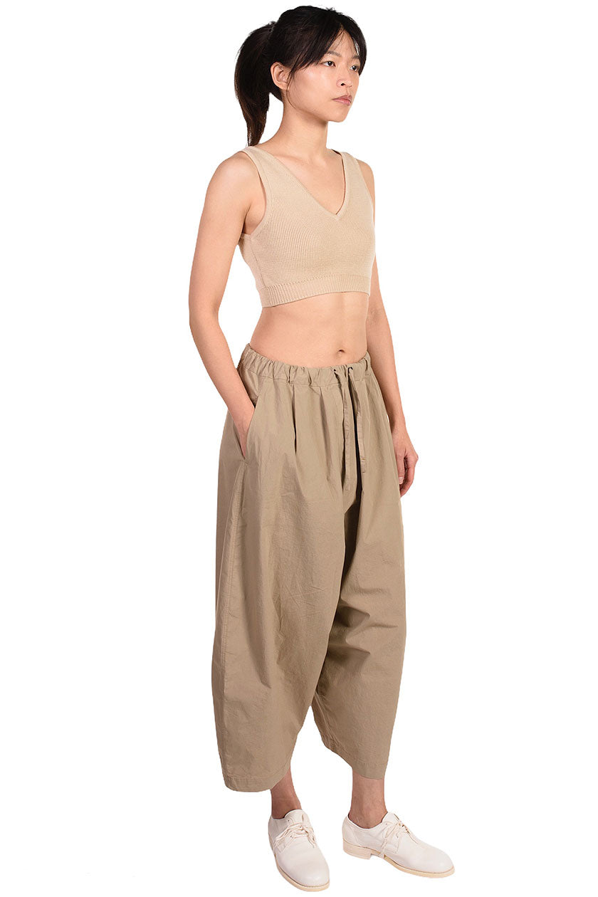 Timeless modernity trousers, designed to use them all year round. Made from cotton. They have drawstring elasticated waistband, high rise and curved and cropped leg, finished with side pockets.