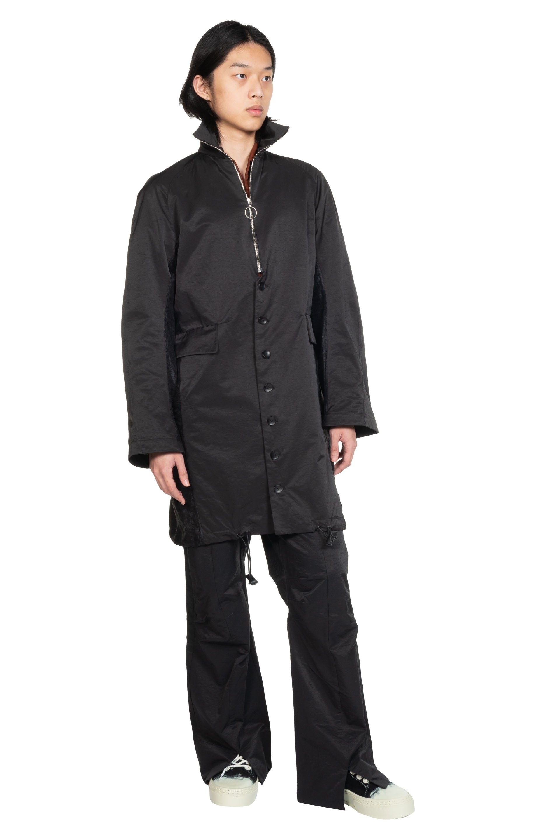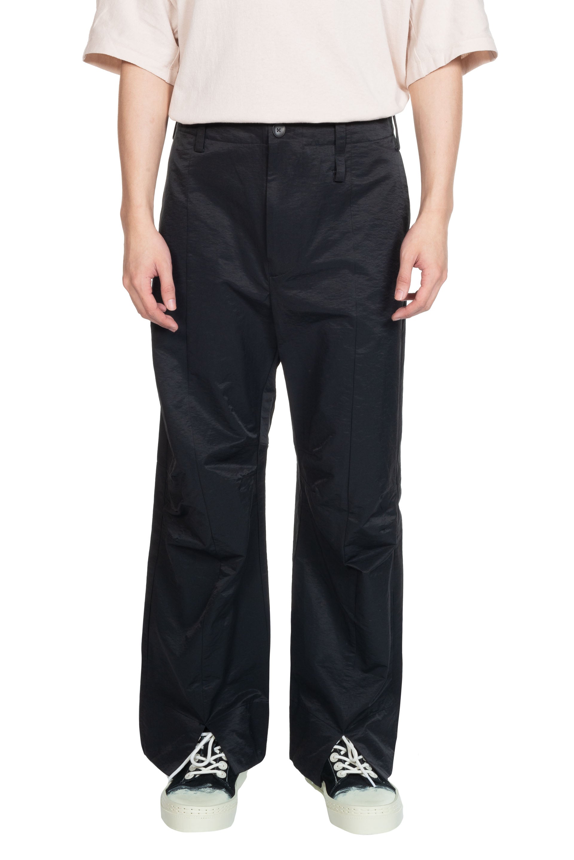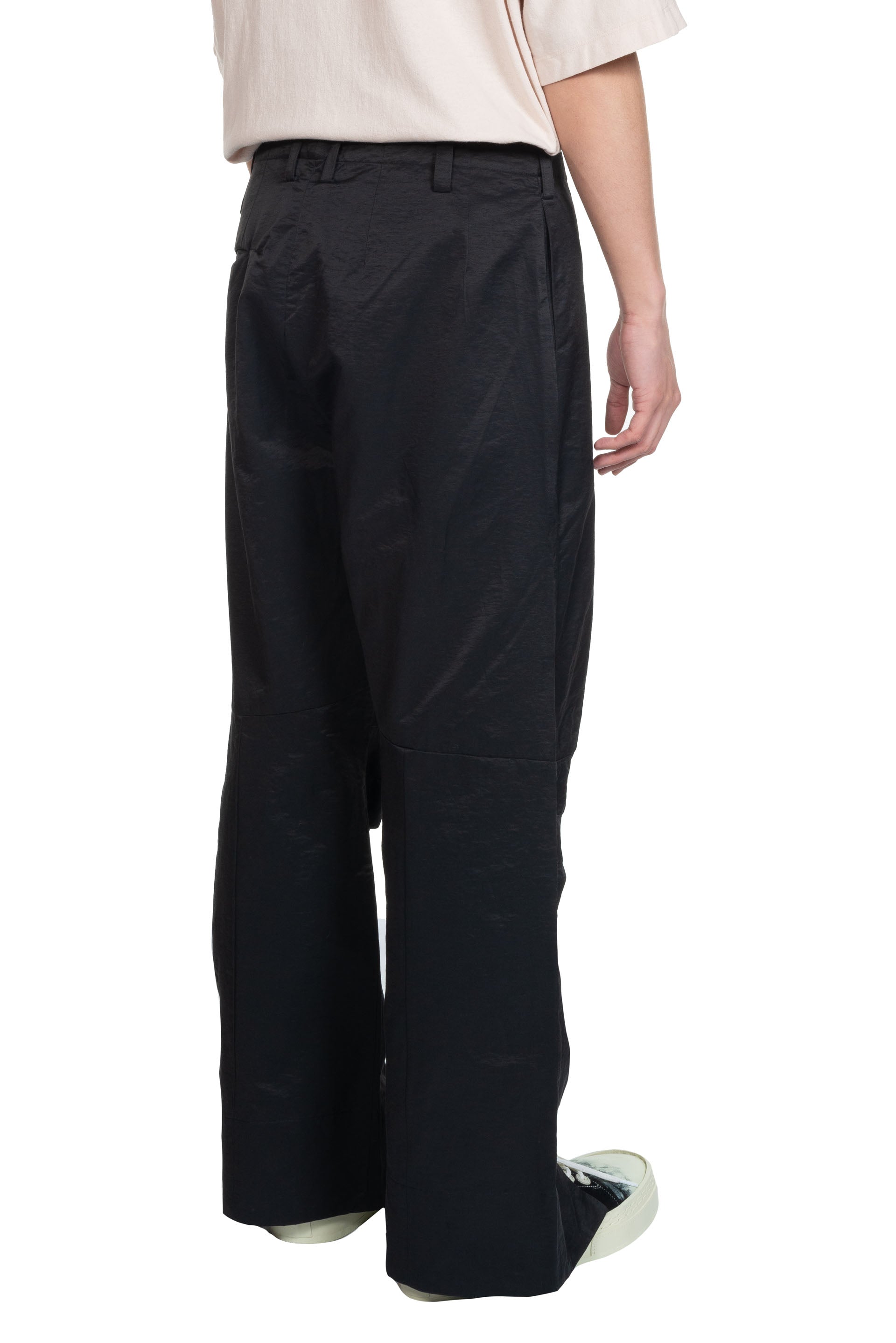 Peng Tai creates modern silhouette with traditional chinese philosophy. Inspired by how Chinese herbal medicine regulates the body from the inside out, Peng Tai aims to research and develop a way to boil Chinese herbal medicine with fabrics, to create clothes that feel like a second skin as seen with the Nylon 3W Trousers Squid Ink.