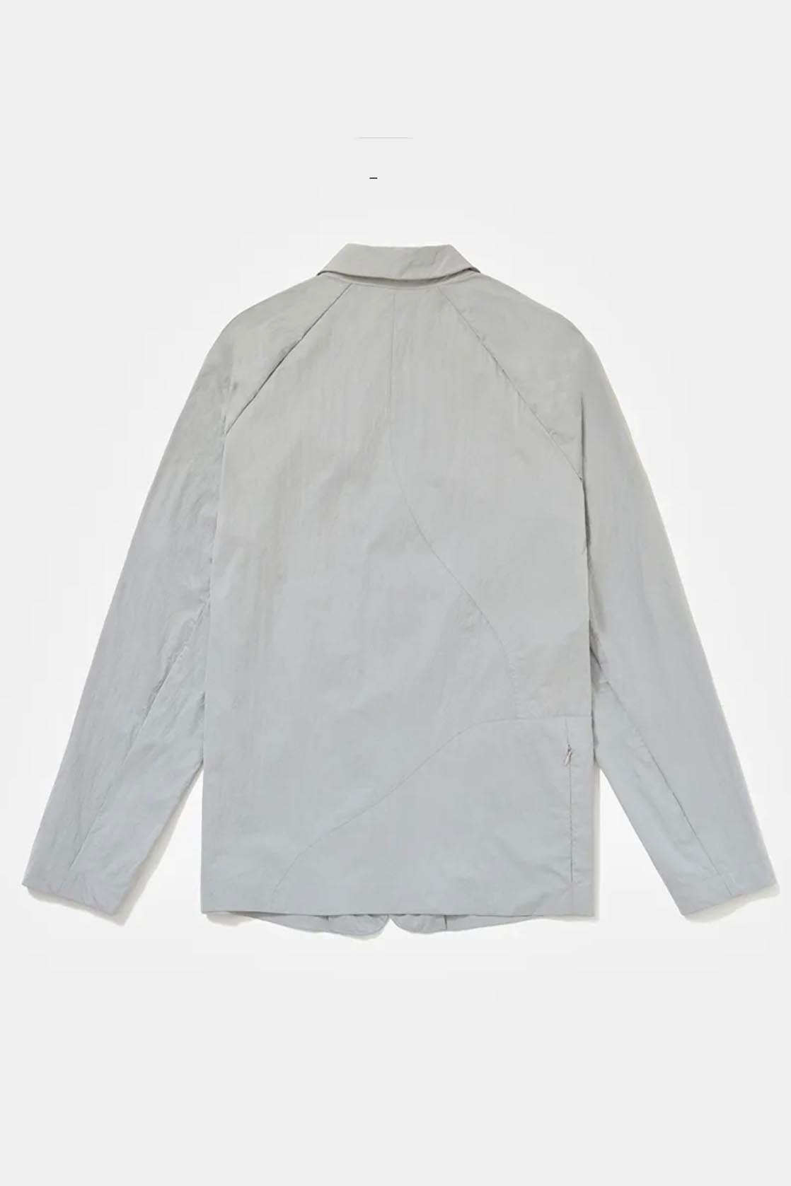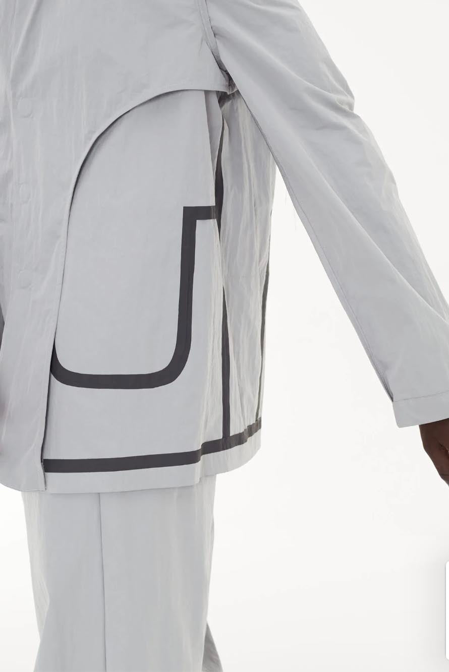 Blazer made of water-repellent biodegradable polyamide fabric in light gray. With a straight cut and magnetic closure, this blazer has sealed seams to improve the waterproofing process of the piece. Its organic lines were inspired by the architecture of the Copan building, a work of modern Brazilian architecture designed by Oscar Niemeyer in 1952. It has front pockets and a hidden back pocket.