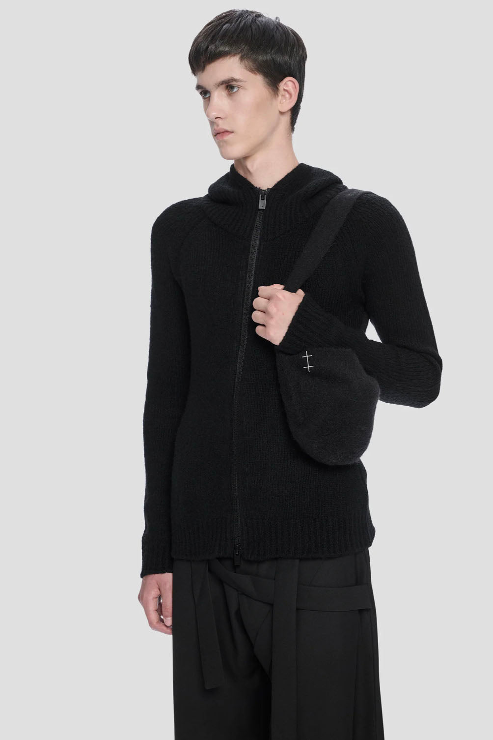 A furry knitted beanie with a strap and the H-clip. Can be worn as a small handbag.