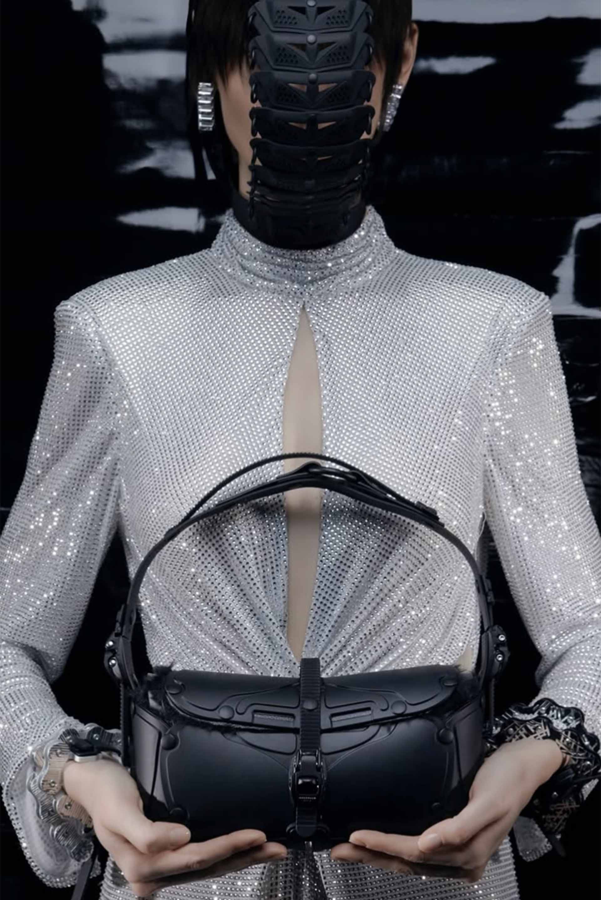Innerraum is a transformative design philosophy that translates language into polyphonic objects, redefining luxury as an ecstatic conflict with the subconscious. It emphasizes the body as both extension and metaphor, where objects like bags become shells for personal belongings and experiences. Through the integration of disparate parts from different imaginaries and histories, Innerraum creates unique, evolving objects that embody transformation and a new aesthetic, reflecting the fluidity and complexity of the self as seen with the Object I80 Mini Stereo Bag.