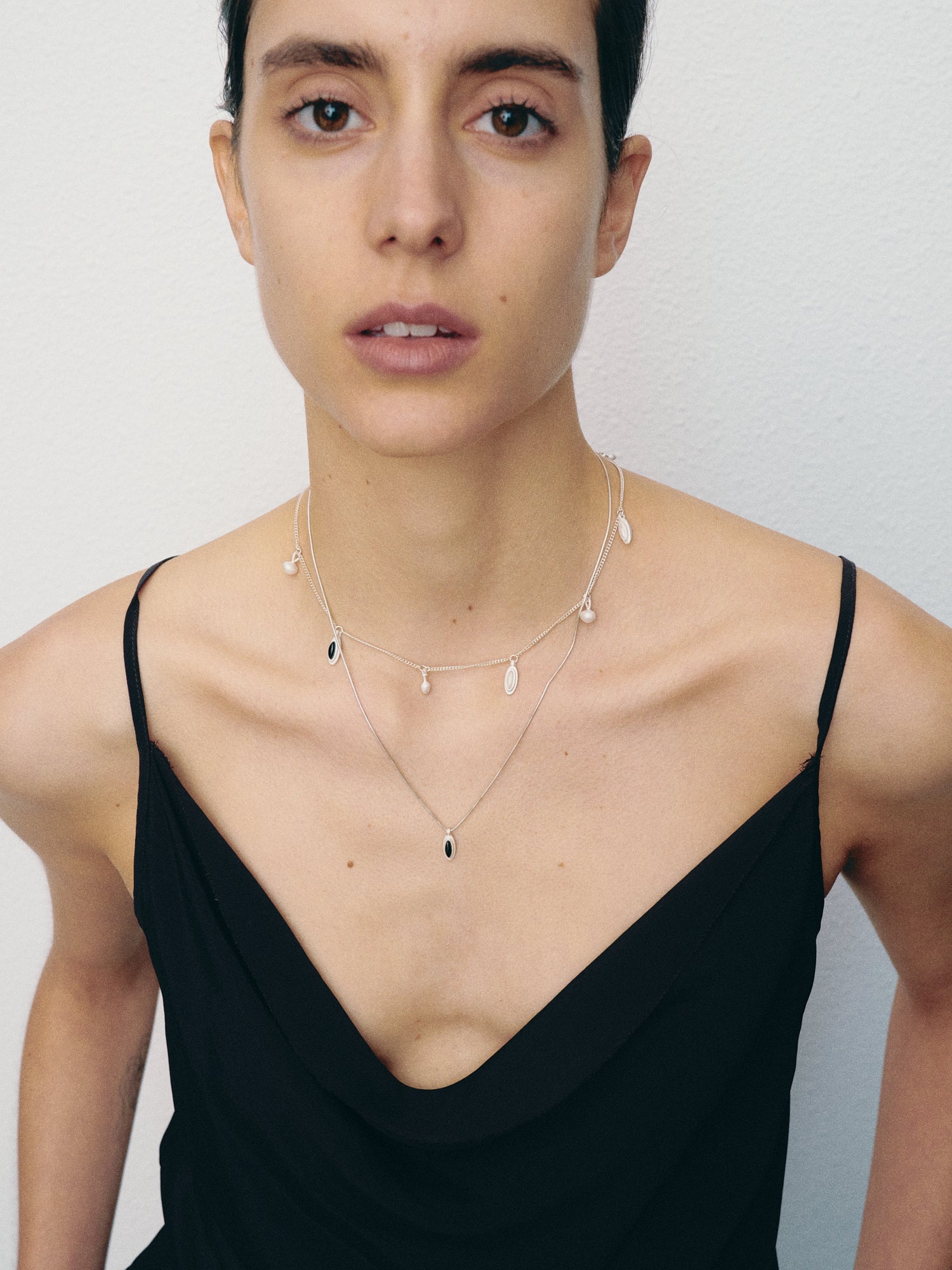 OLIO E ACETO is raw and authentic. It is about the companionship between people, and objects like the matte white surface becoming a blank canvas to be filled by the wearer as seen with the Obsidian Satellite Necklace.