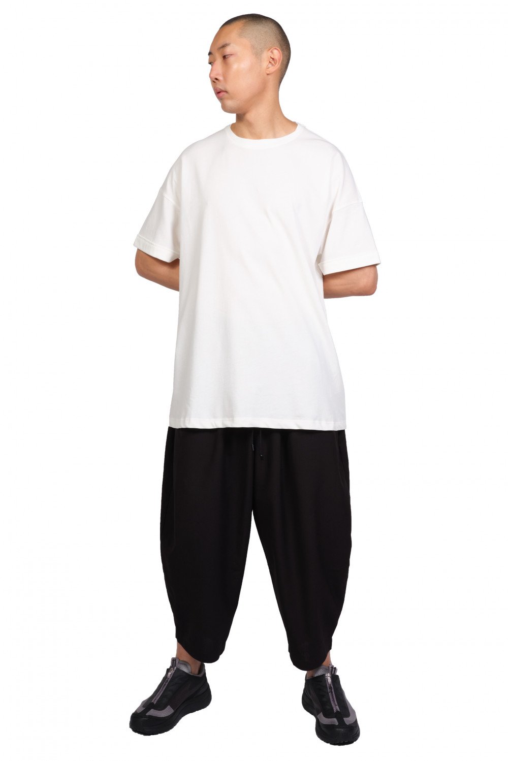 Thought-provoking silhouettes with nuances of monochromatism and functional essences being woven through whilst maintaining a strong tie to traditional and urban origins, seen in pieces like the Joe Chia Off White Rolled-Up Sleeves T-shirt