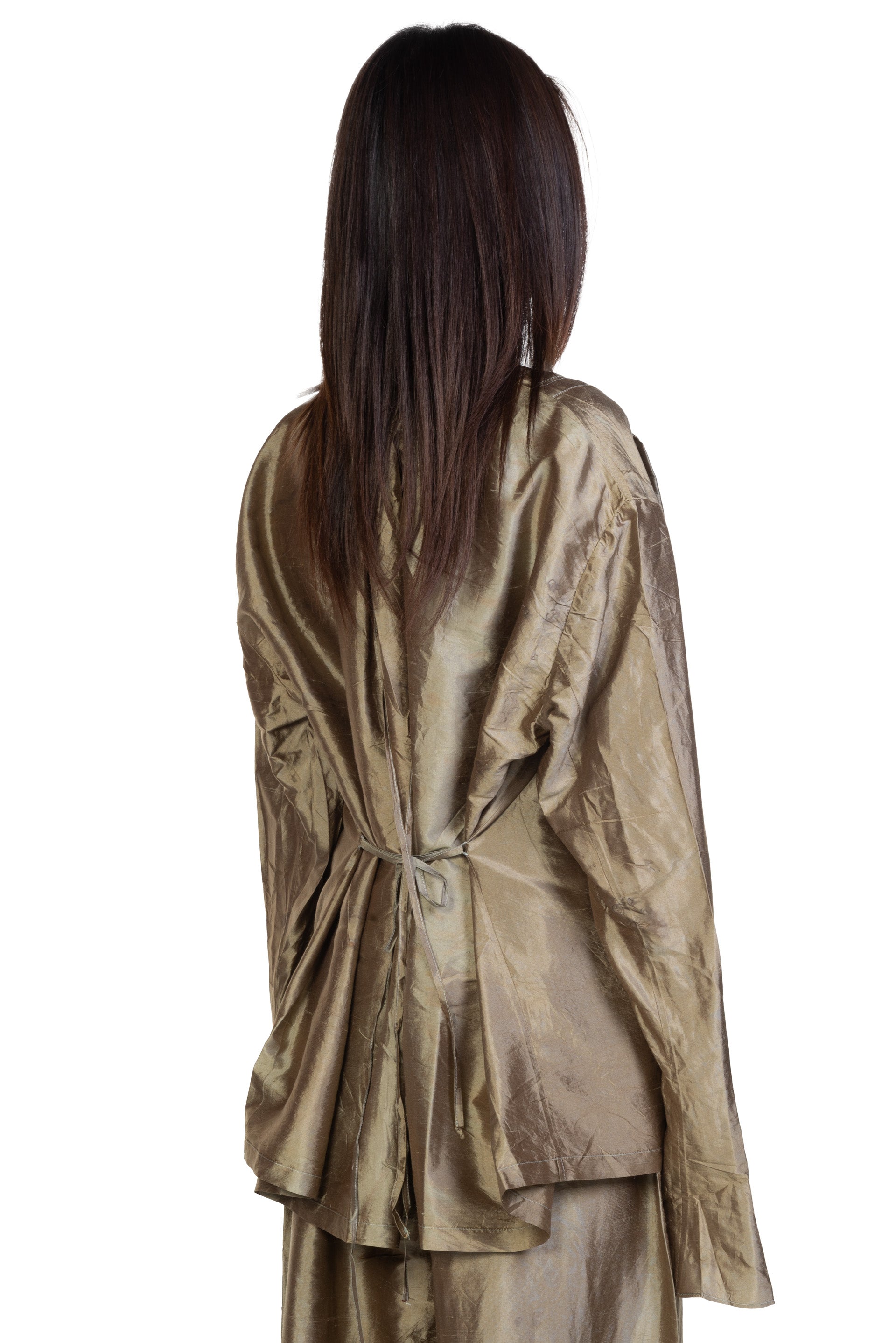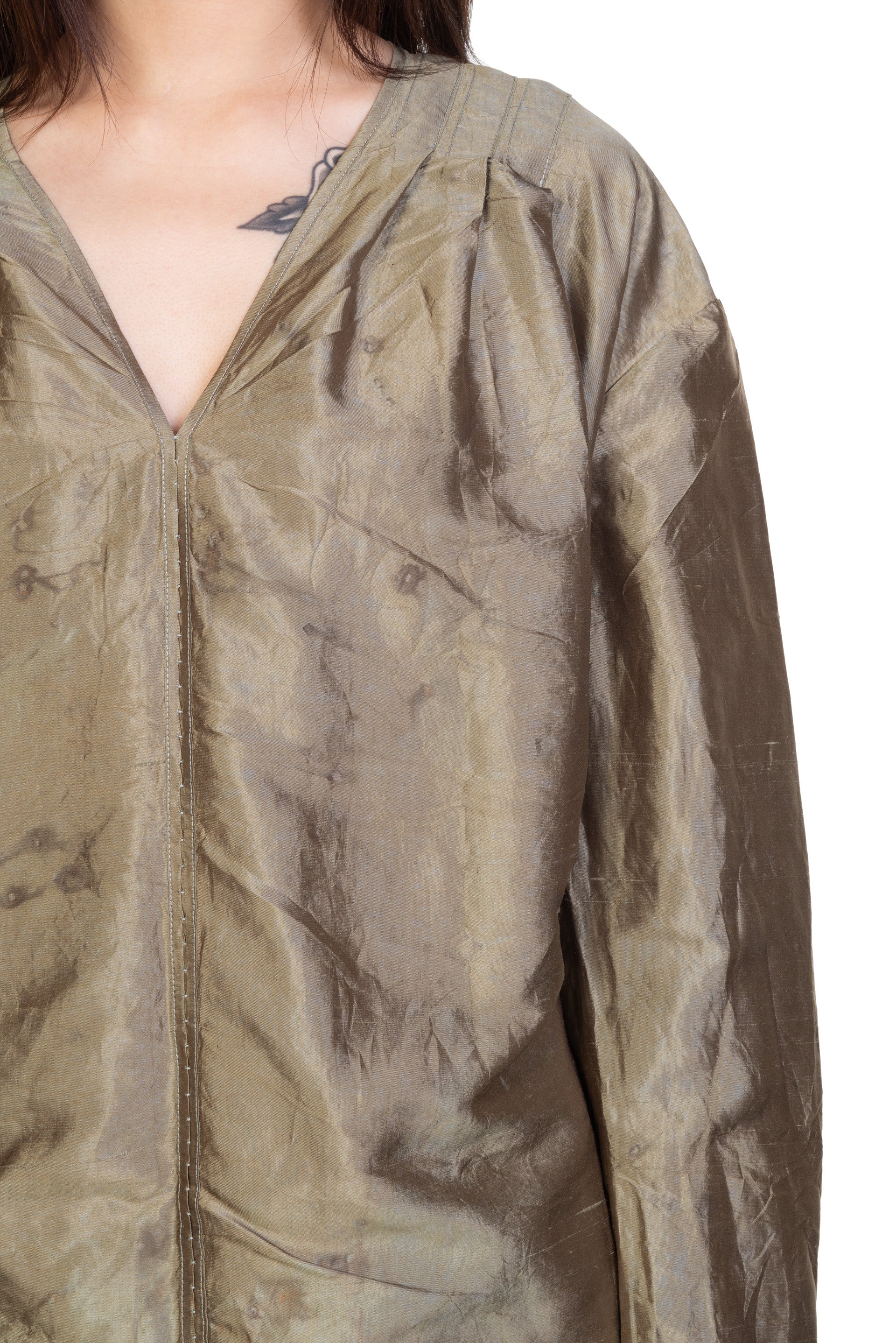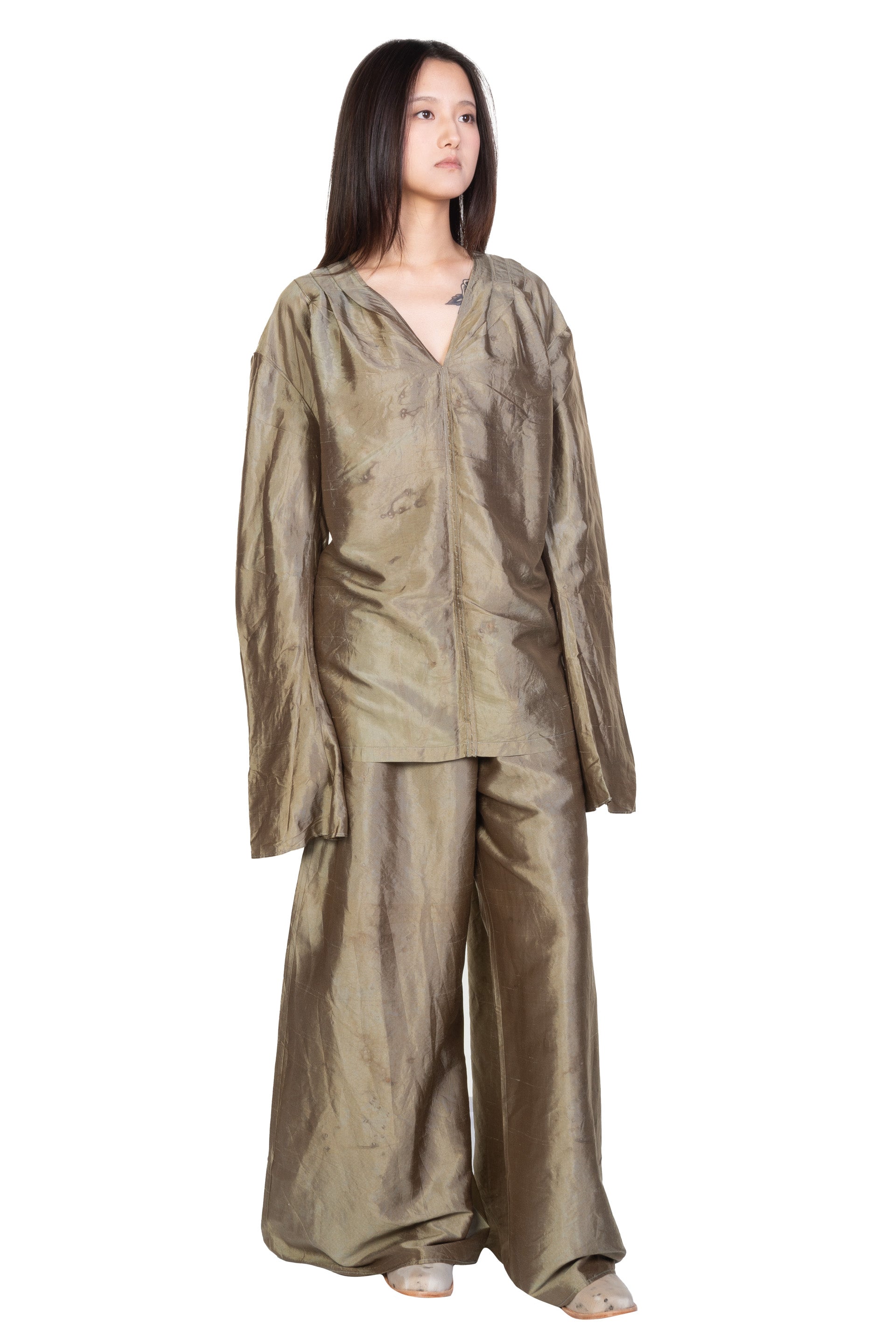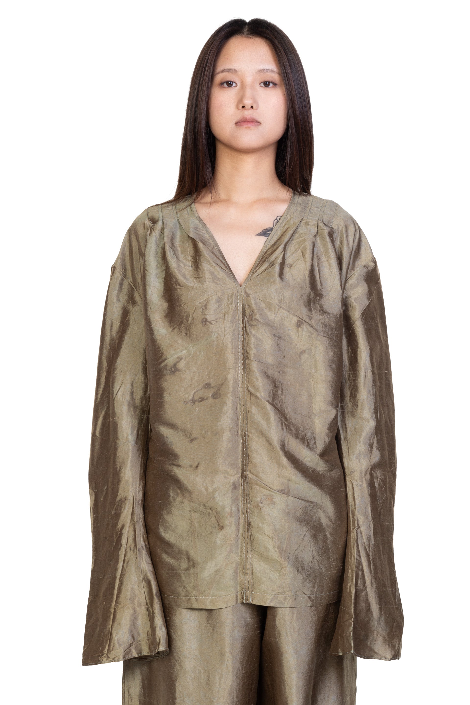 Yu Qun believes that everyone's character is multi-faceted and expressing spiritual independence. Fine hand-stitched threads, old mottled colours and patterns, and unconventional cuts are what Mute Dance has been exploring. The leaves and stems of fresh plants and berries, dried medicinal materials, old metals and so on are combined with the ancient and traditional dyeing technology to dye fabrics and paper as seen with the Olive Silk Dyed Shirt.