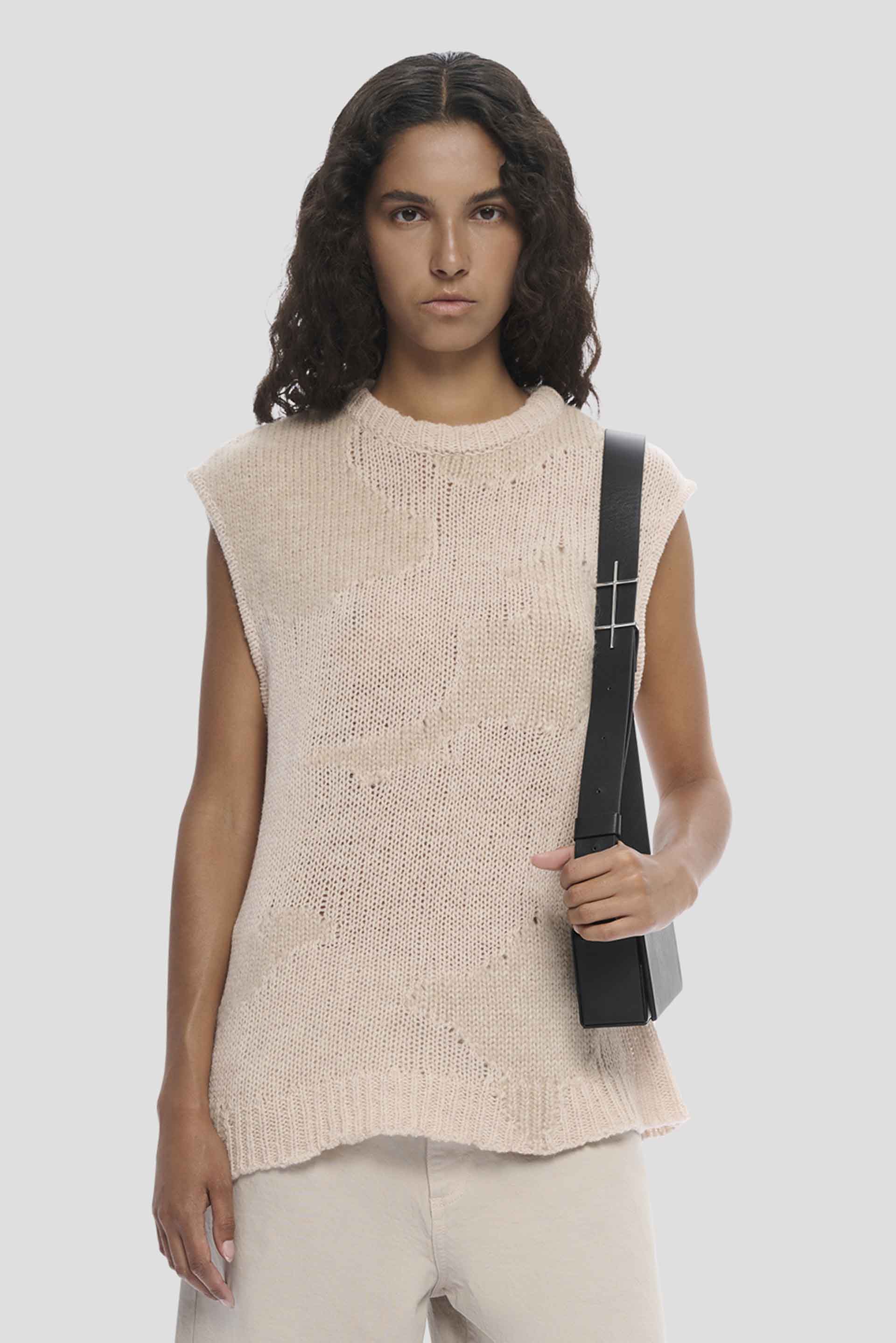 Heliot Emil Ophiolite Knit Vest Stone. Sleeveless. Round neck. Knit with seasonal pattern. Long fit. Soft texture.