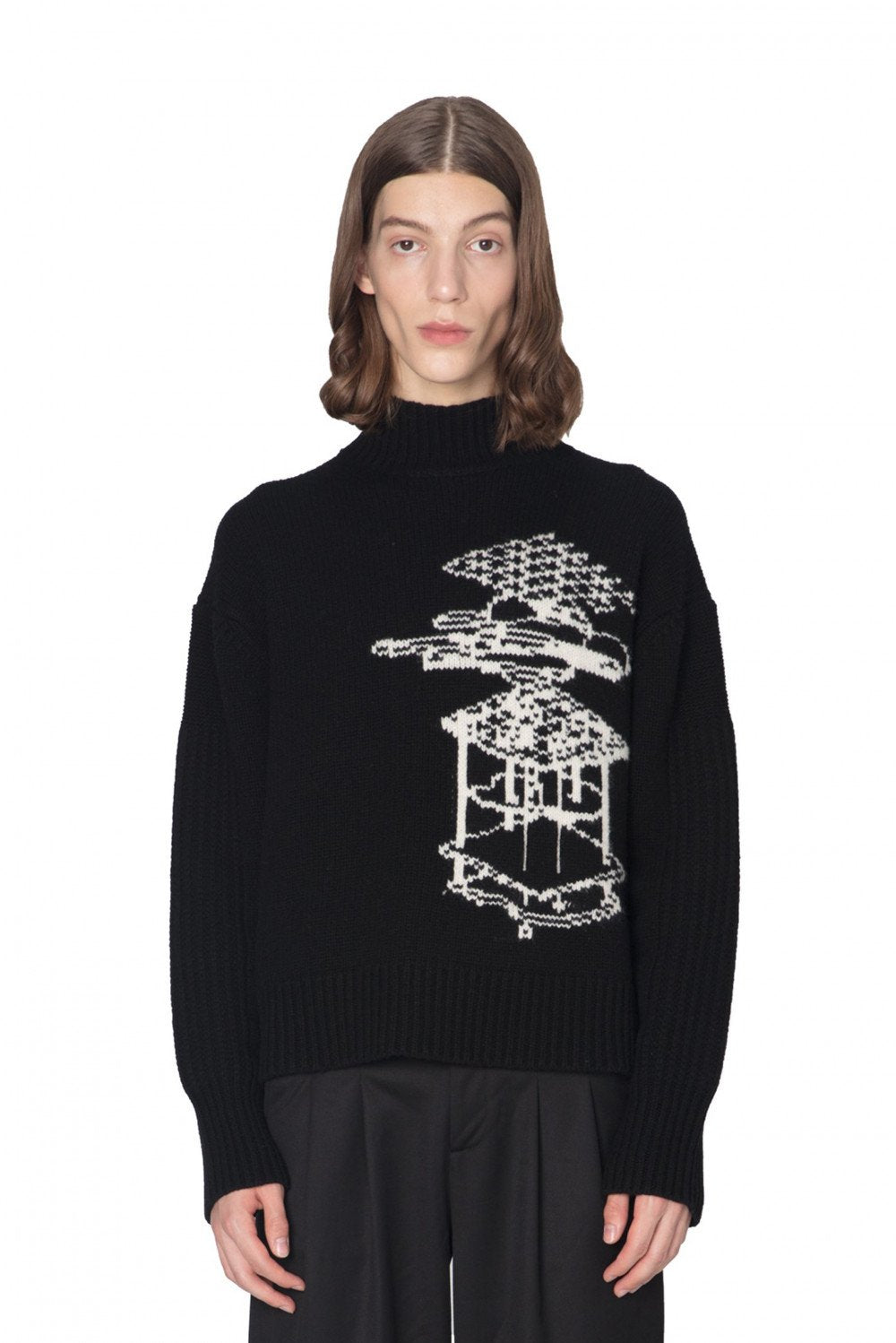 Long sleeve panelled knit wool sweater in black.