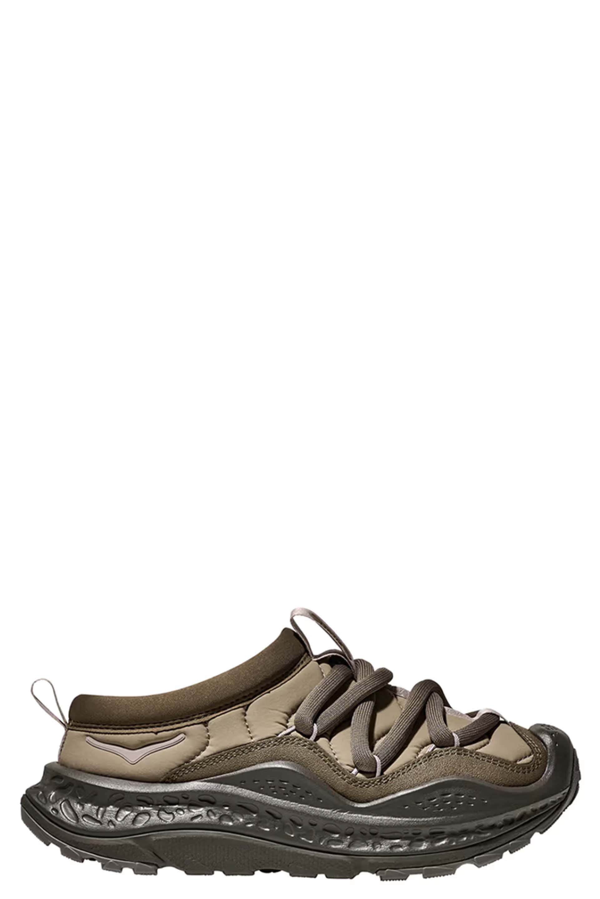 Hoka one one Light Roast. Insulated puff upper. Knit collar. Zig-zag stitch detail. Round elastic lace system. Protective toe bumper. 30% recycled rubber outsole.