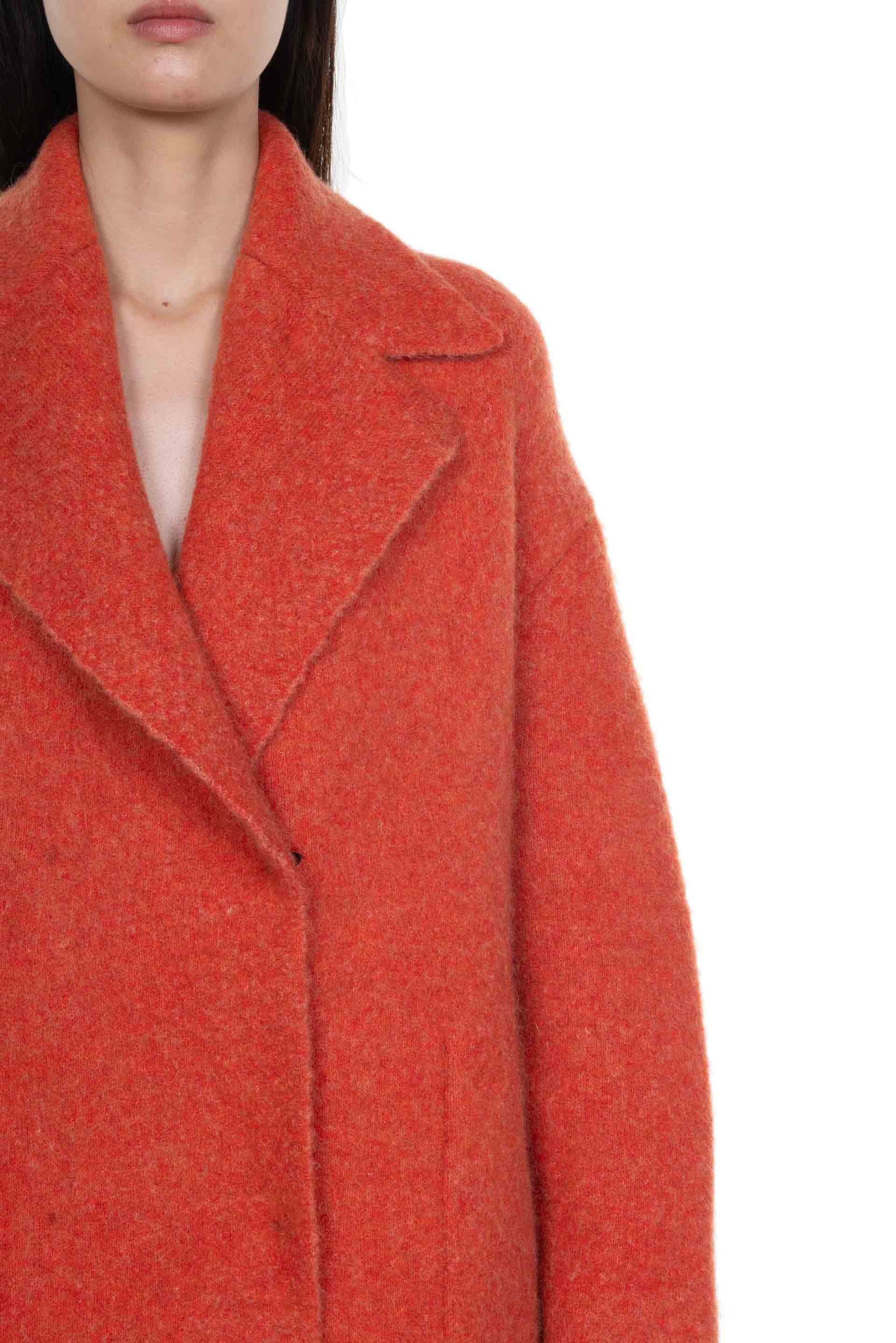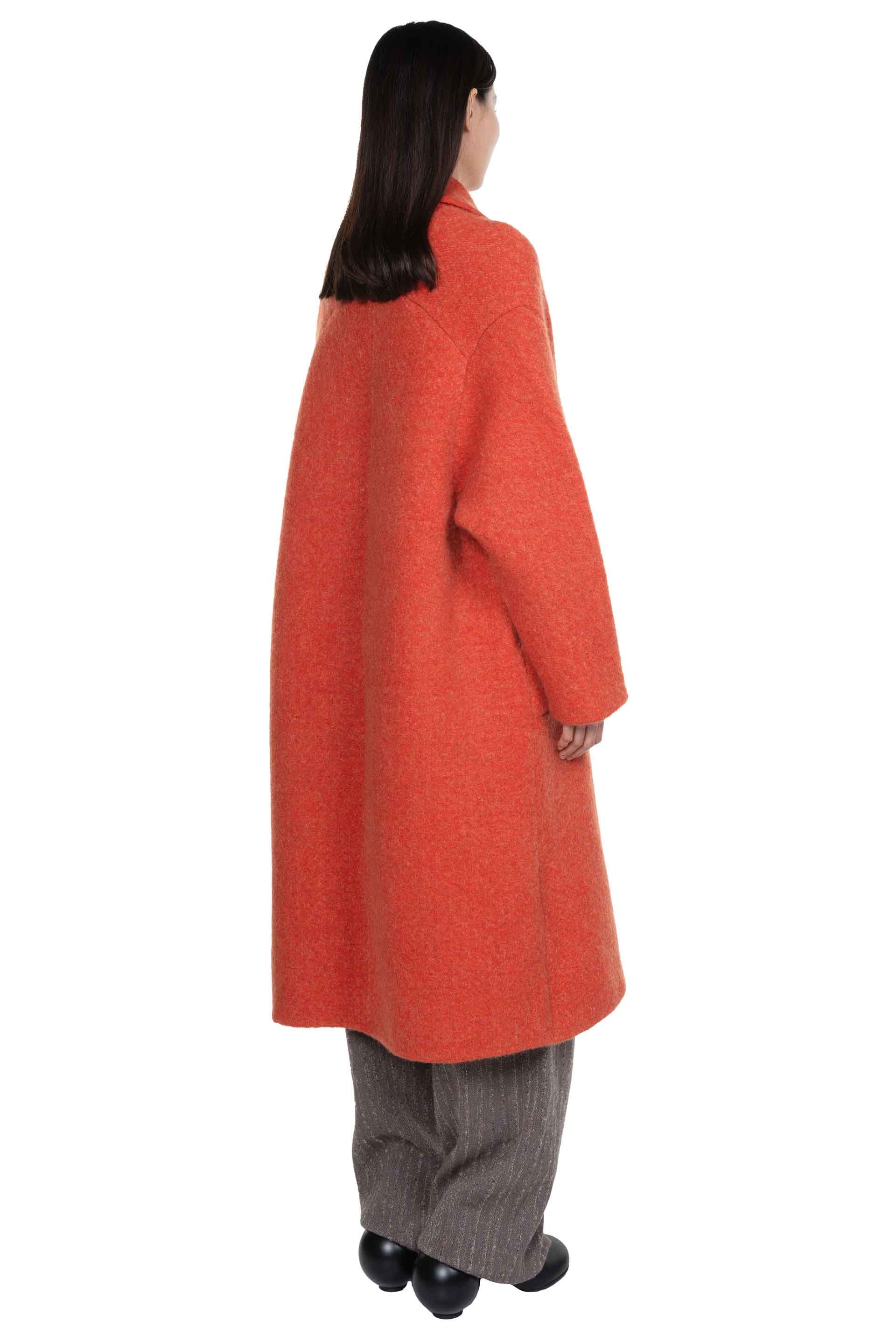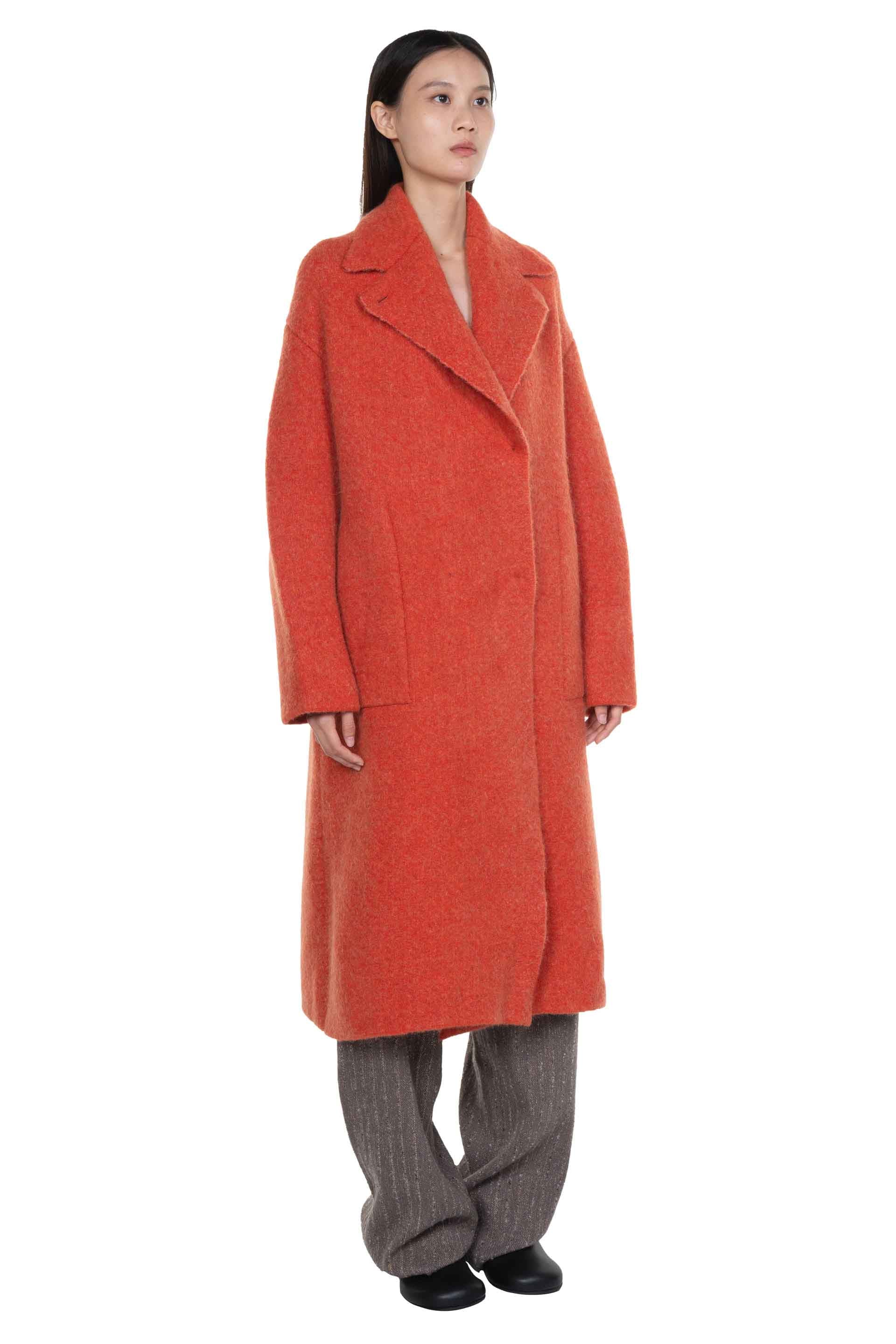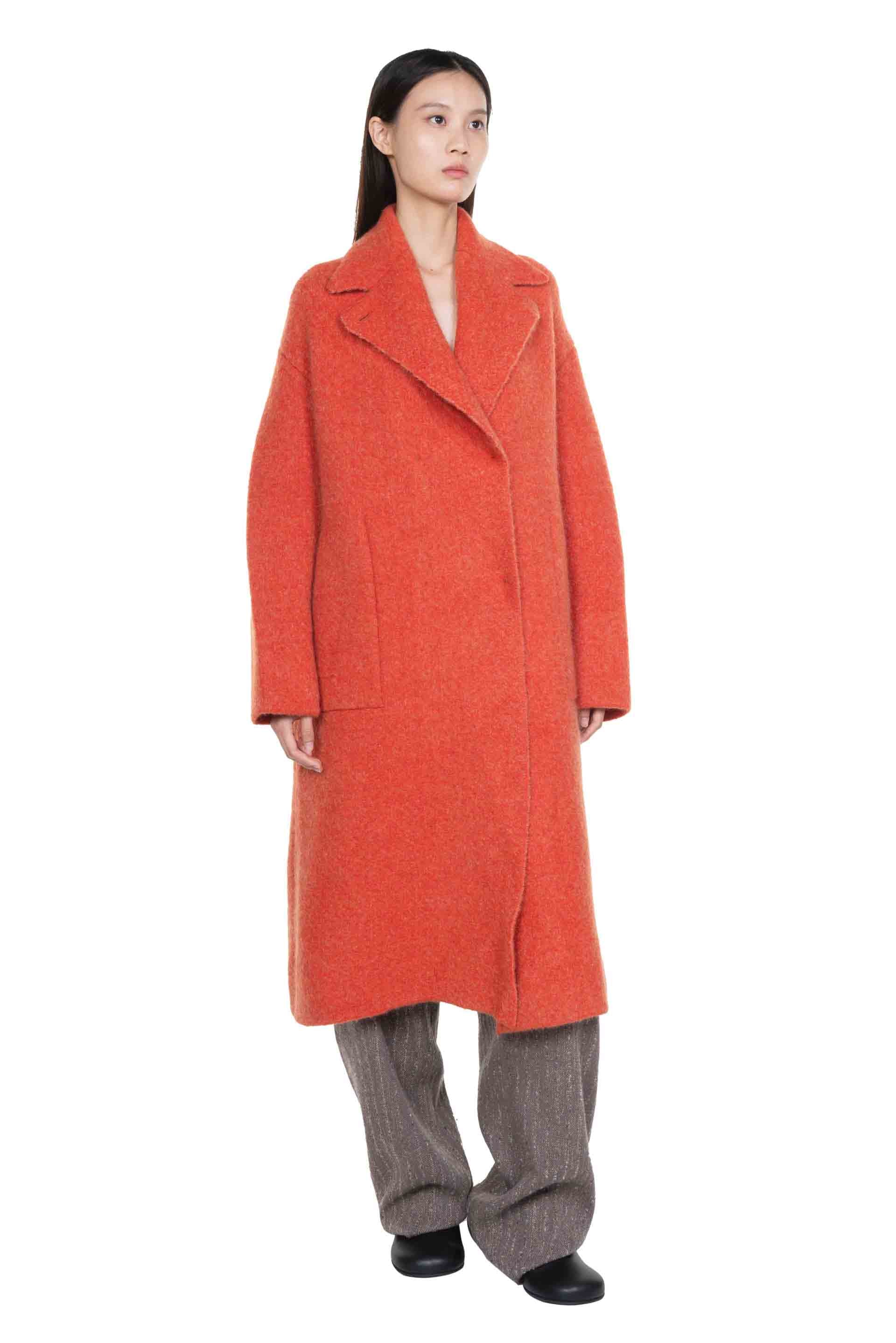 Orange Yak wool coat from Boboutic. Classic collar. Double breated. Long sleeves. Button closure at front. Hidden button system. Two side pockets. Signature Yak mix. Soft textural fabric. Lightweight.
