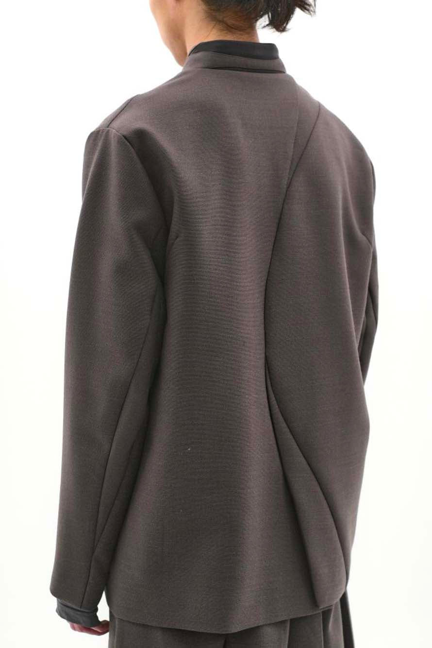 Attempt project 11 oriental blazer in brown. Long sleeves. Hook closure at front. Two side pockets. The inside is a restrained expression, recordings of subconscious flows. The exterior design shoes sharp lines of verbal expression. The representation of "flow" is also reflected on the collar design that interprets an oriental mood hiding the design inside.